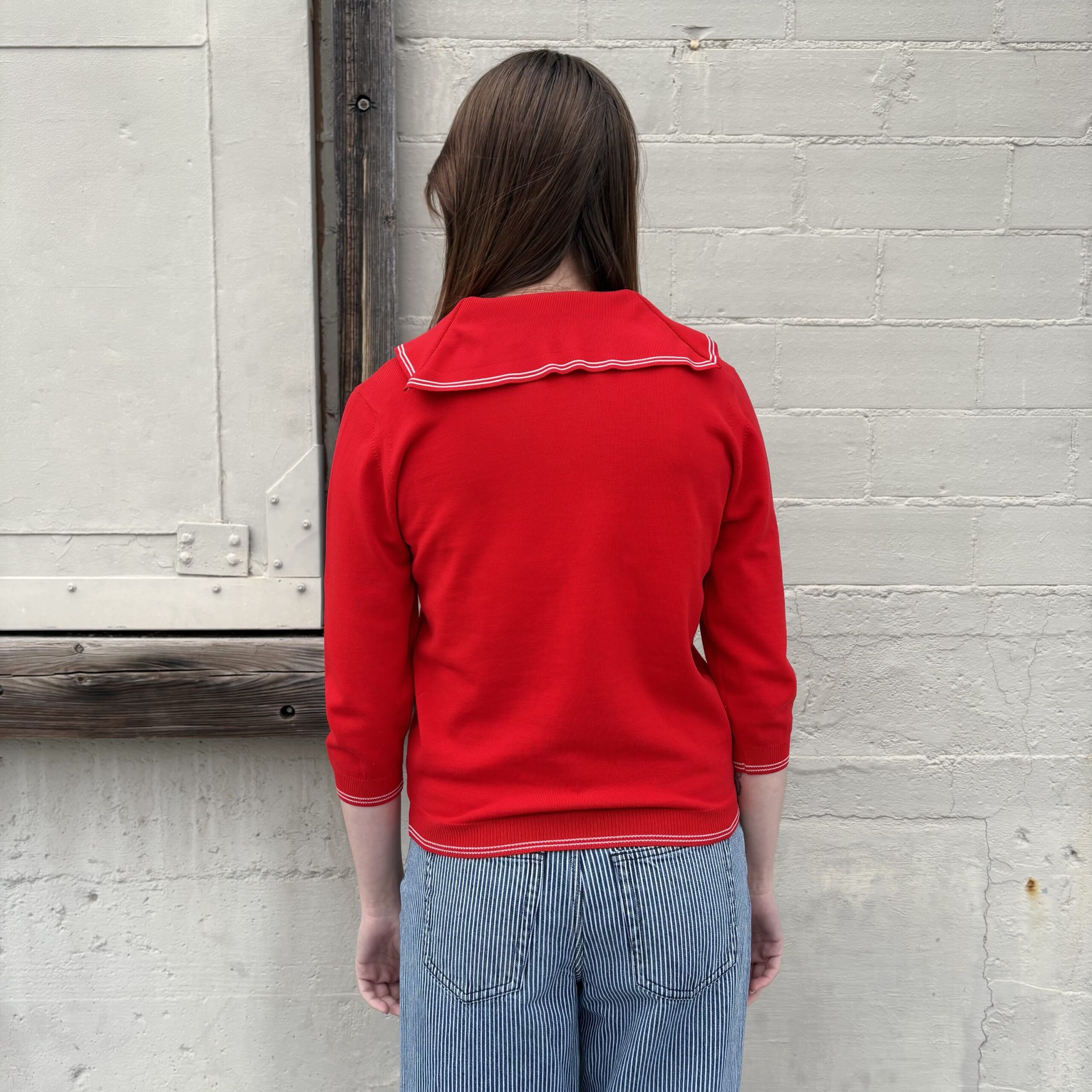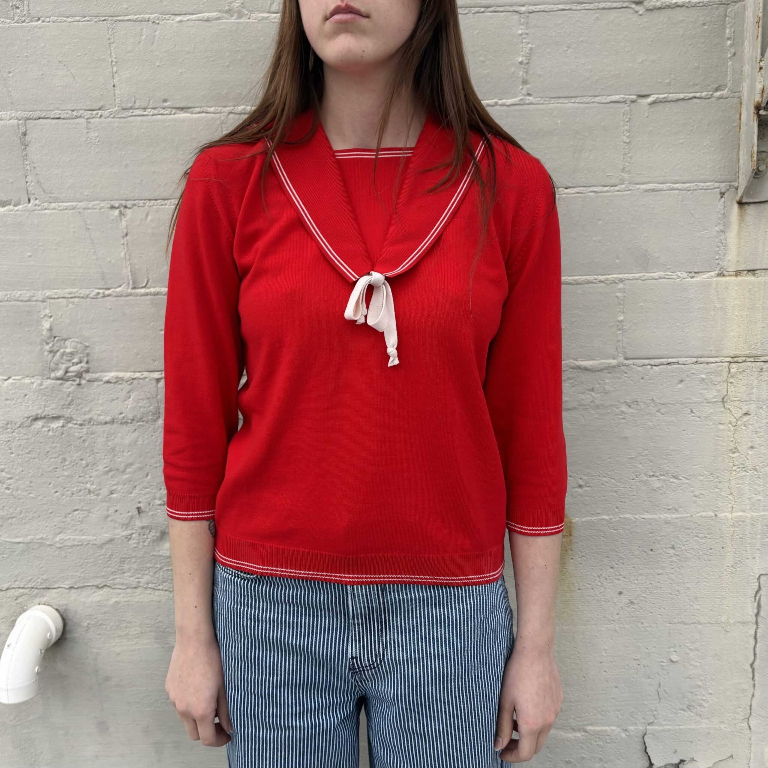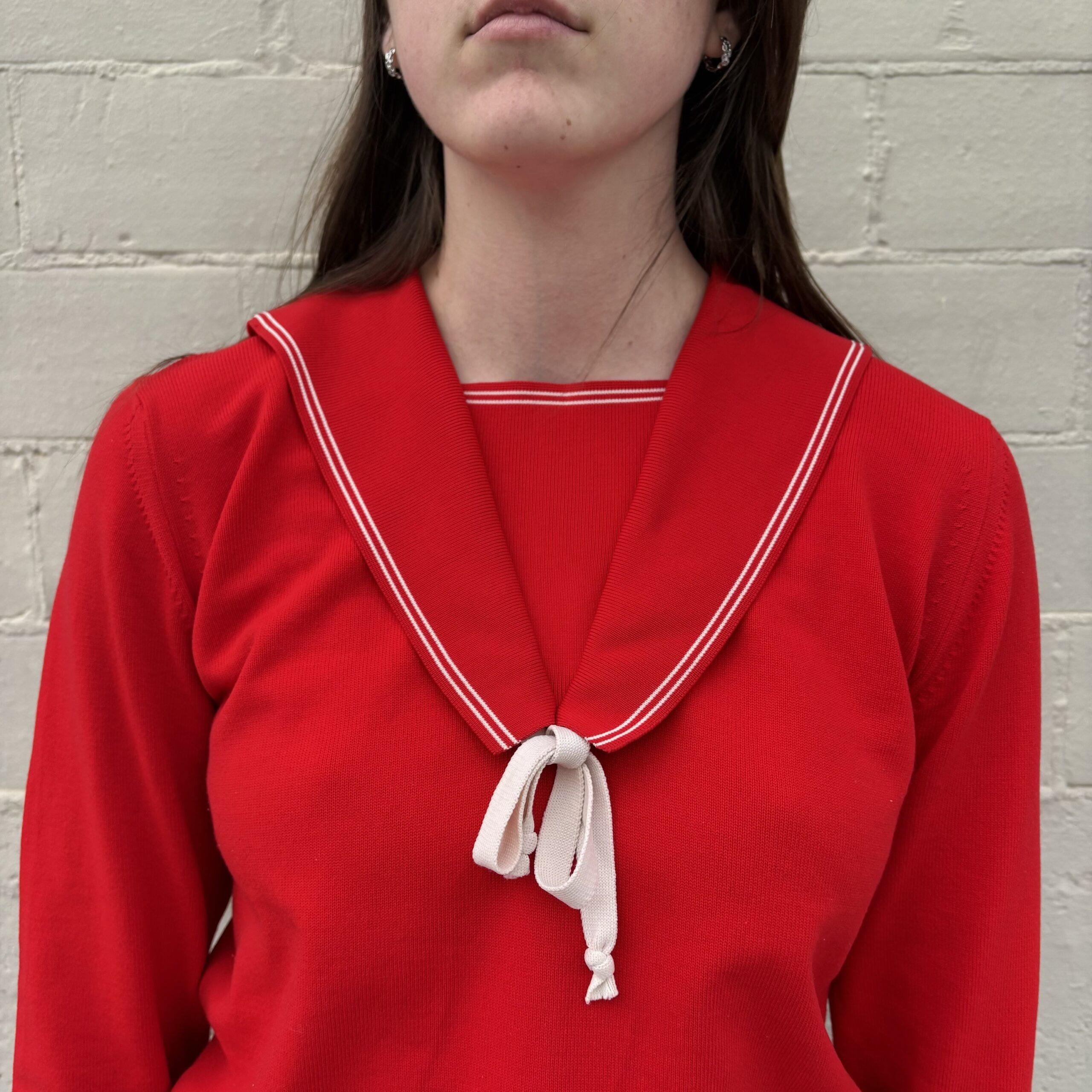 1940s, Red color, sailor style neckline, white trim detailing, removable snap-on white tie in front, quarter sleeve, stretchy fabric.
