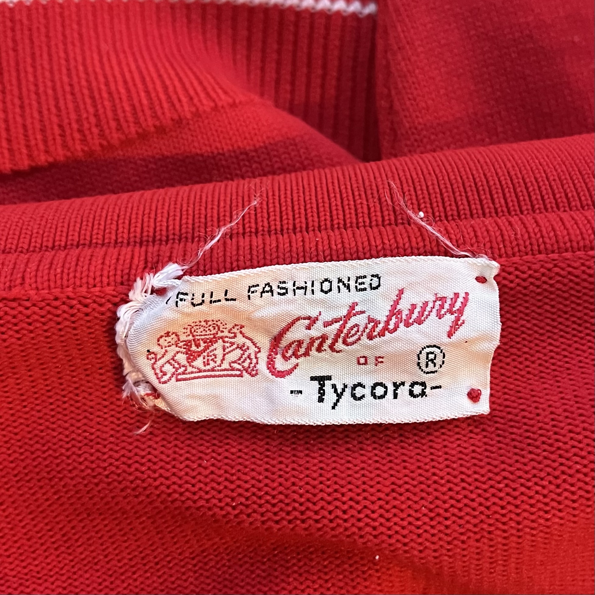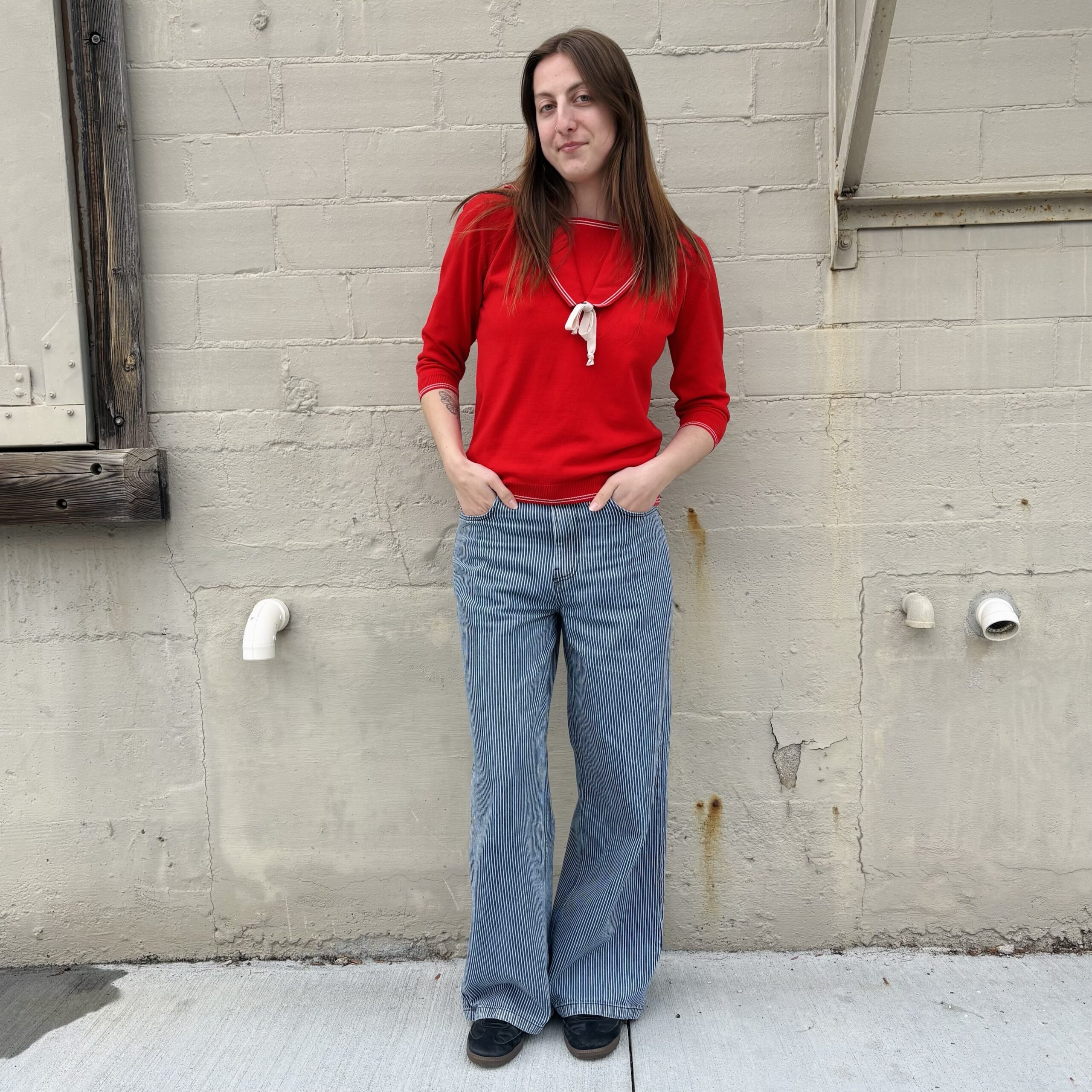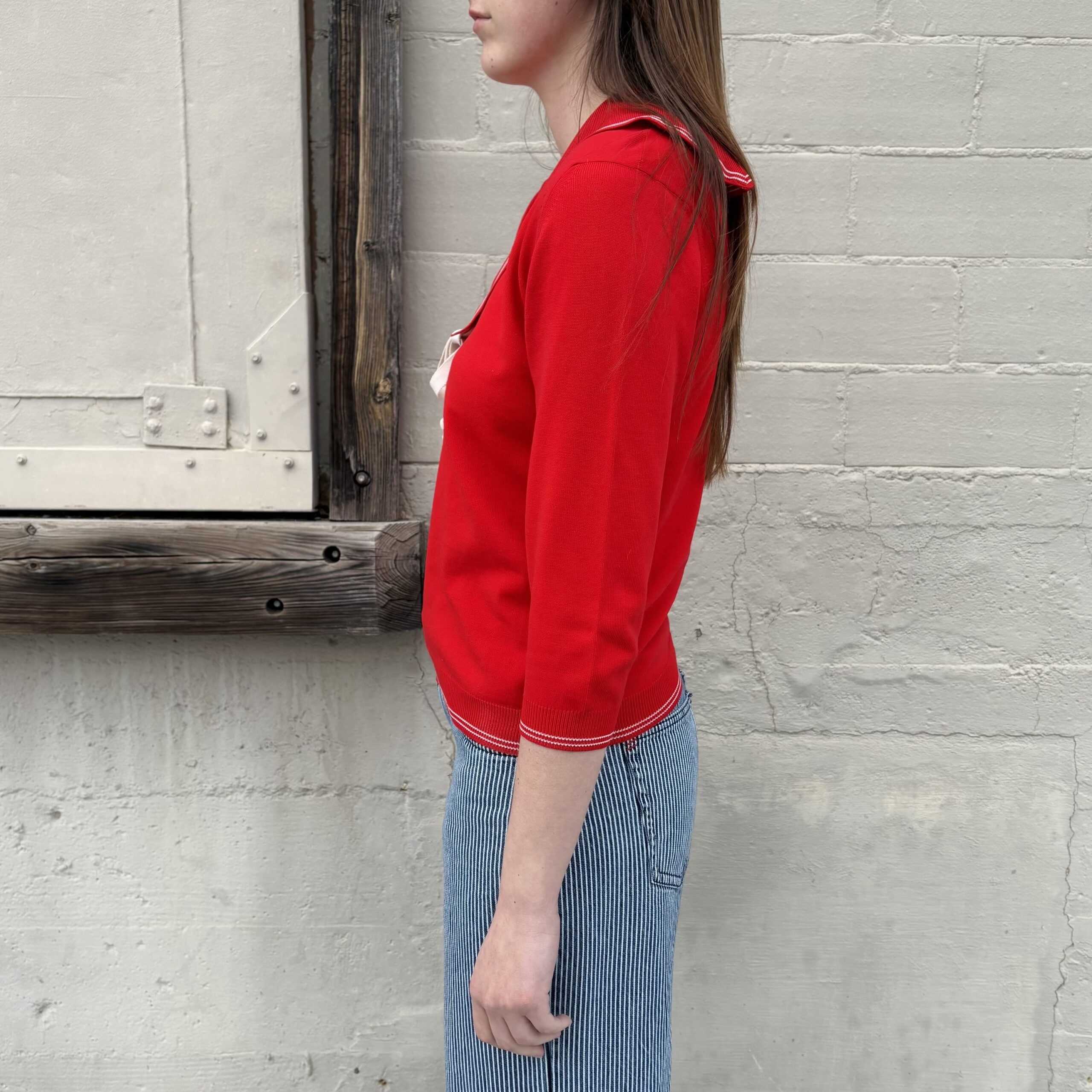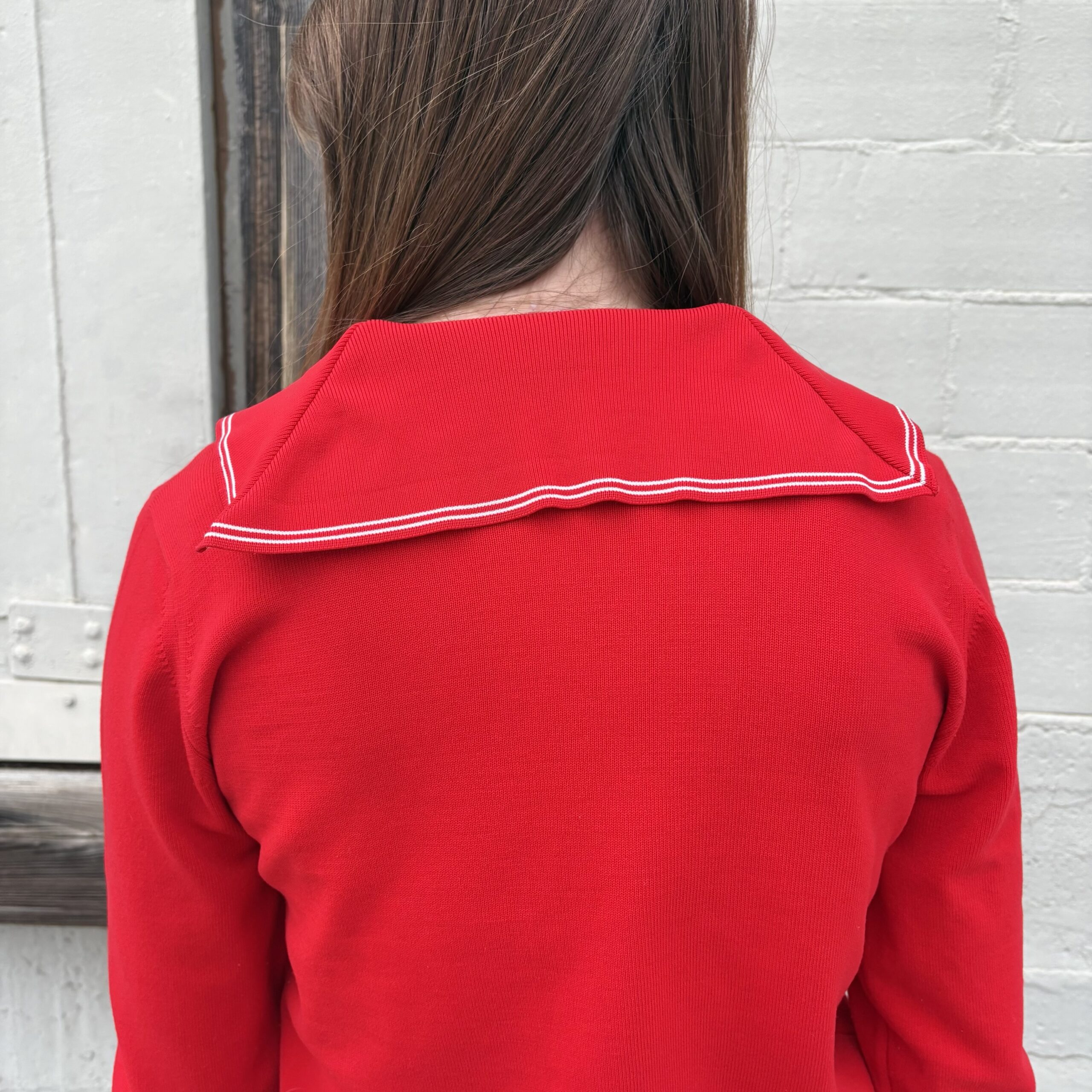 1940s, Red color, sailor style neckline, white trim detailing, removable snap-on white tie in front, quarter sleeve, stretchy fabric.
