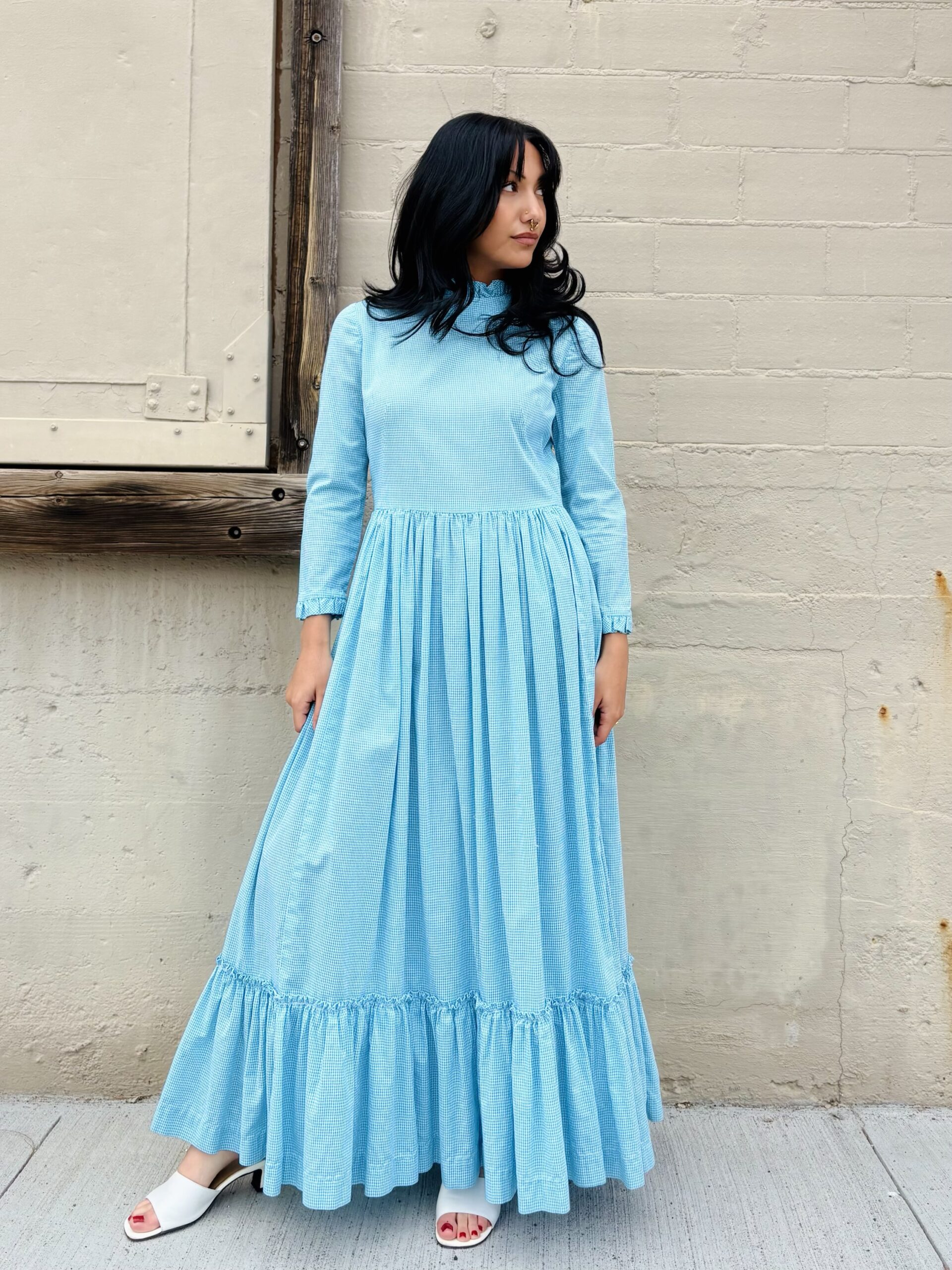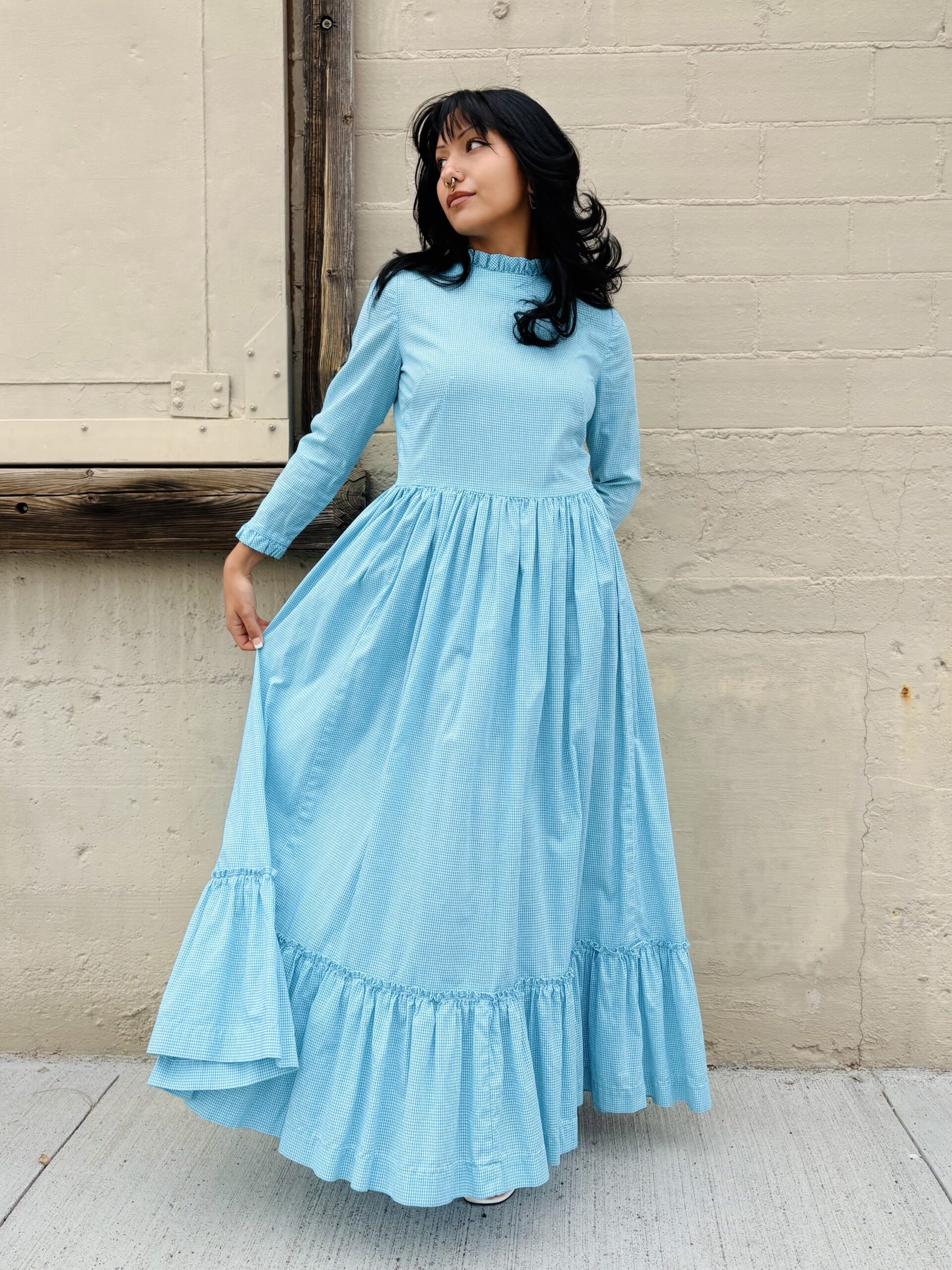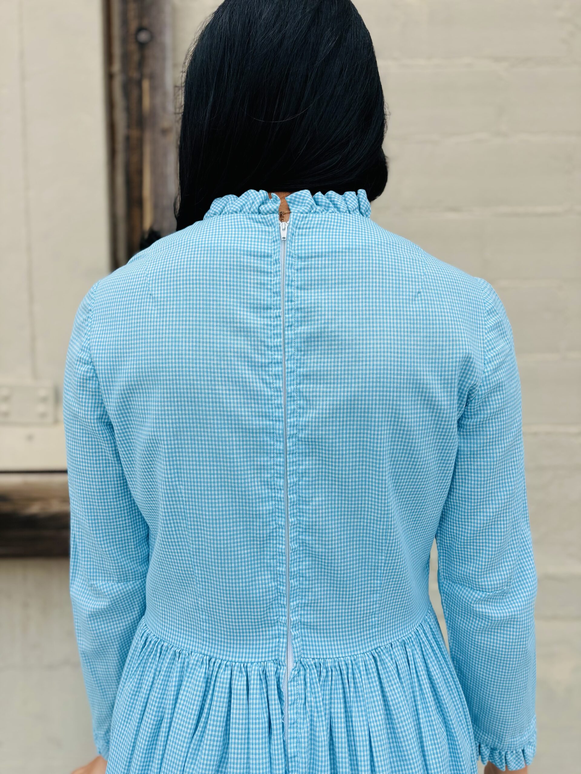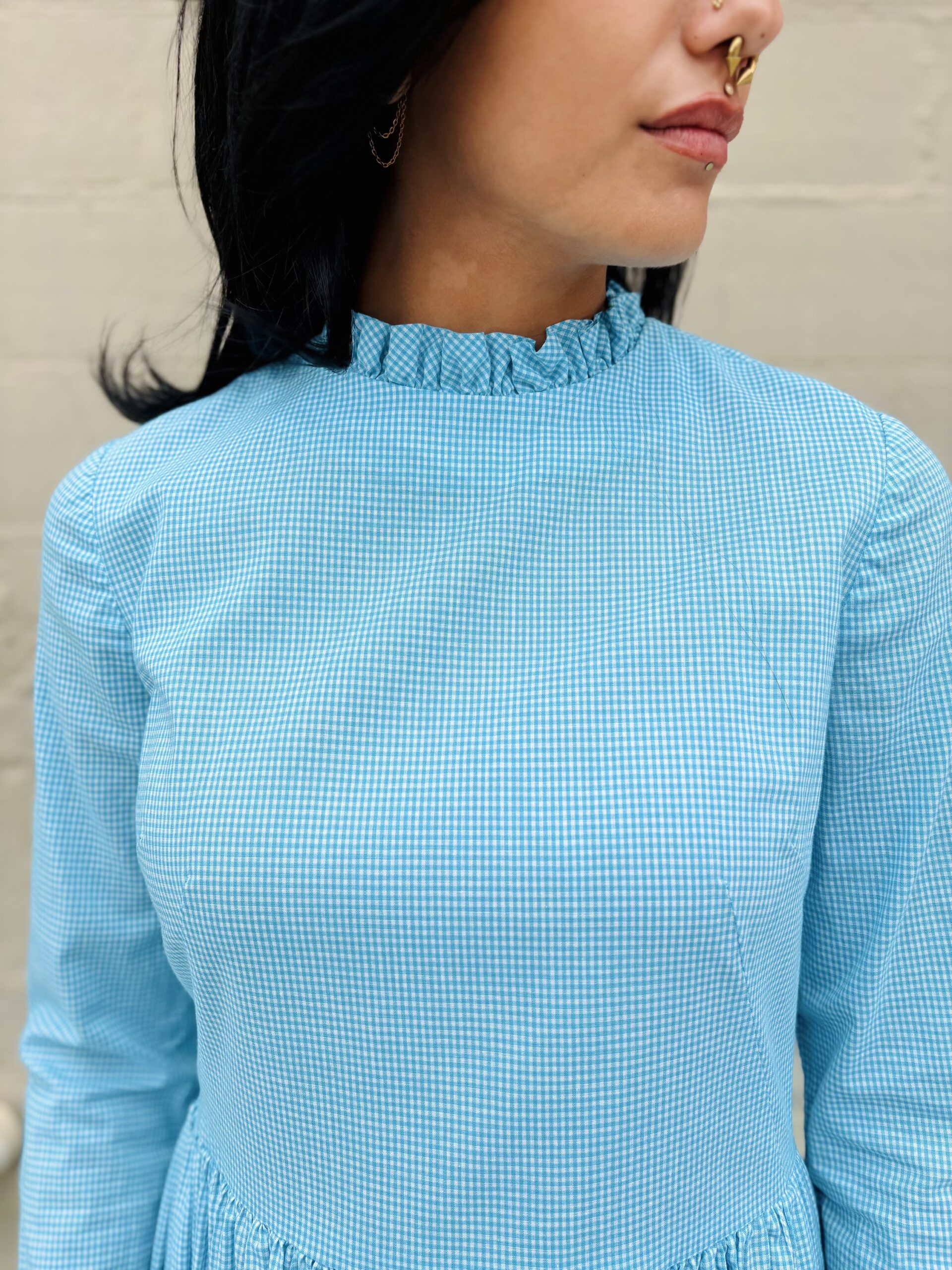 1970s, aqua blue and white, micro gingham print, ruffle collar, long sleeves, ruffle cuffs, flounce hem, spine zipper, material feels like cotton or polycotton.