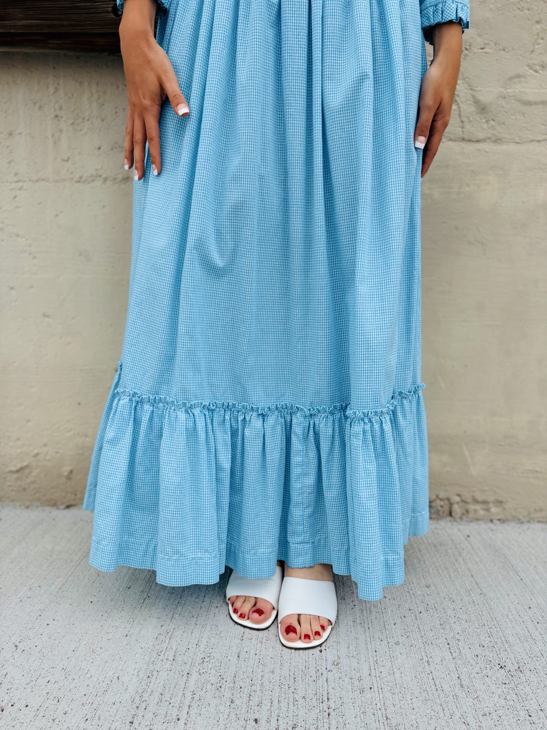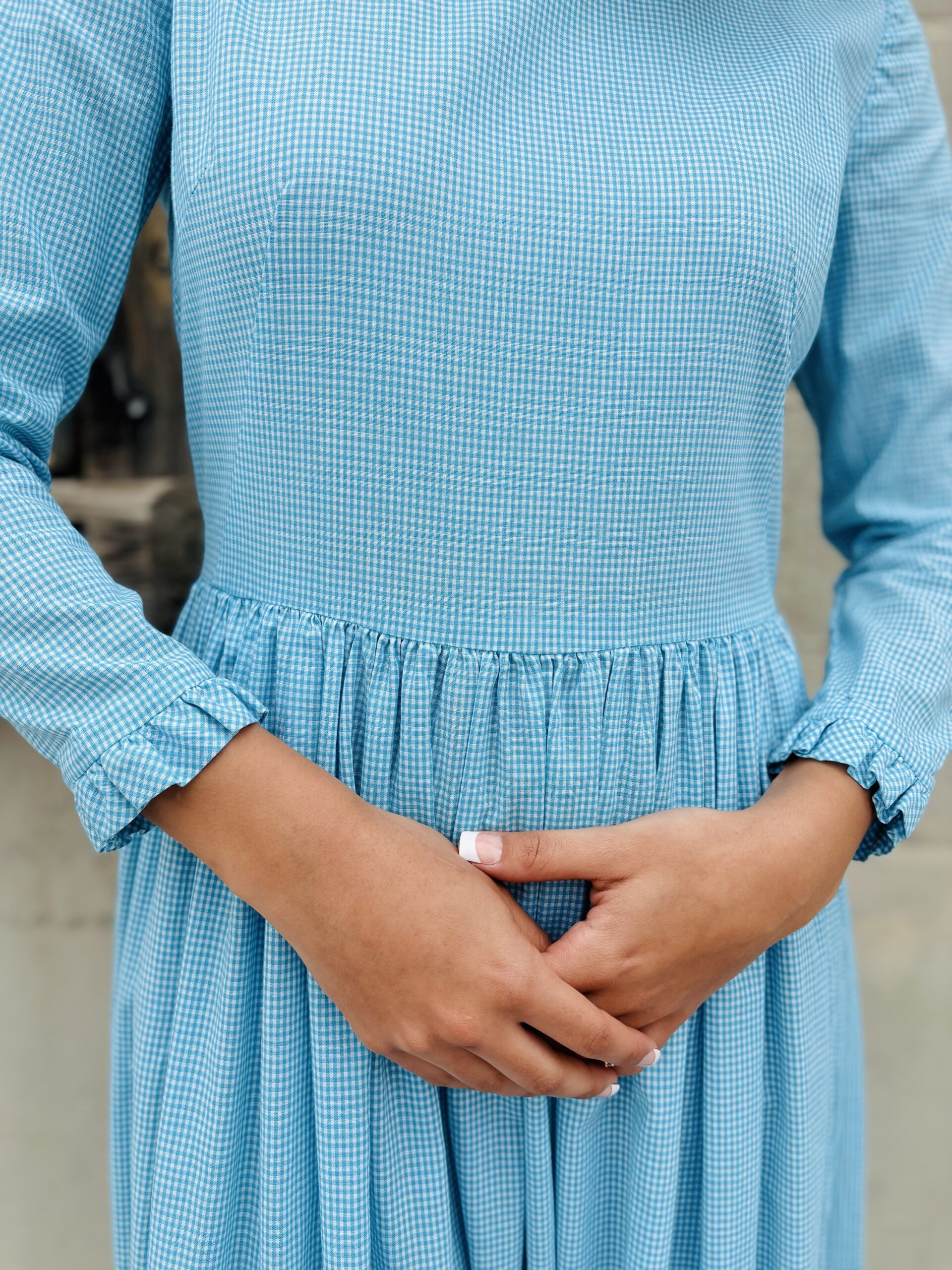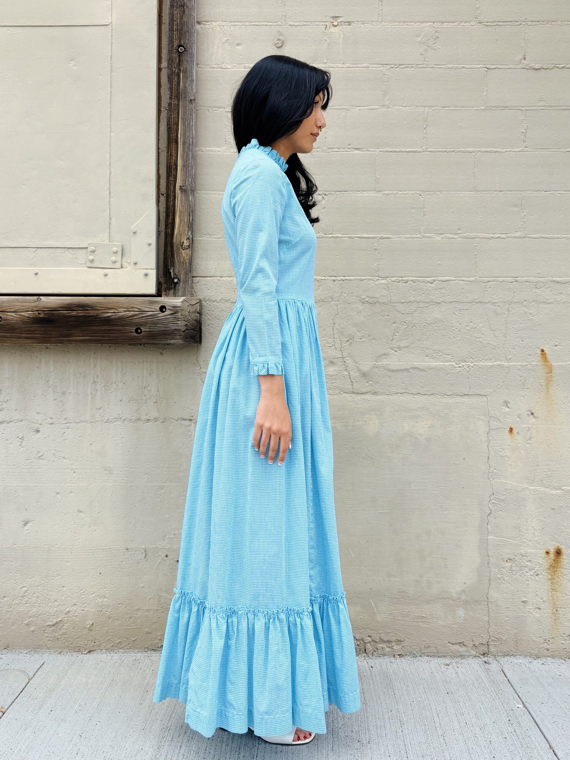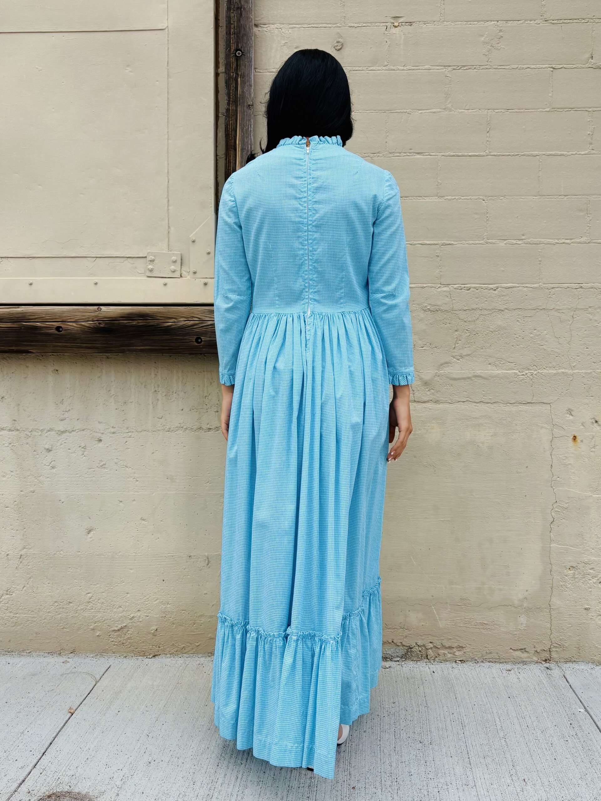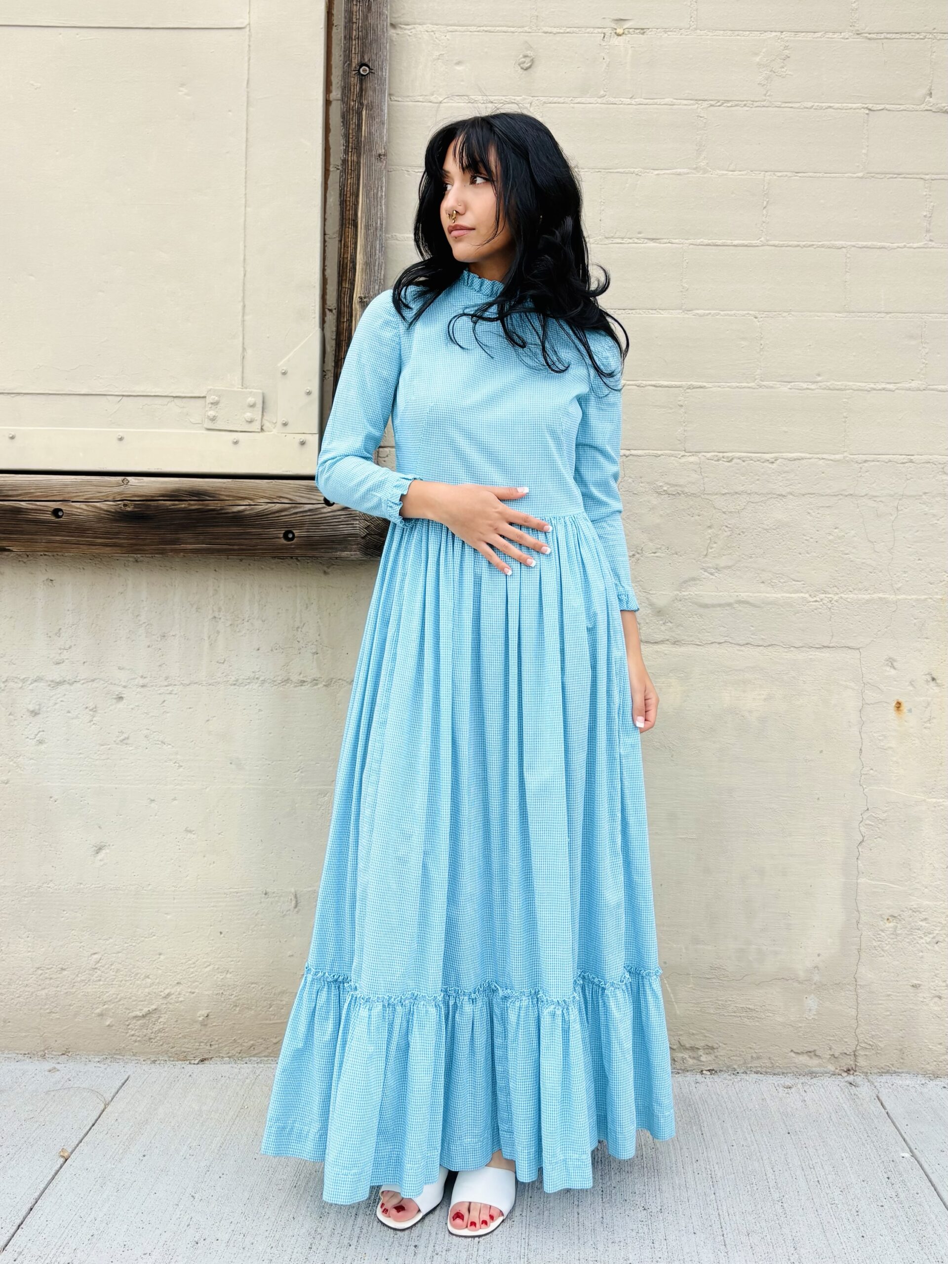 1970s, aqua blue and white, micro gingham print, ruffle collar, long sleeves, ruffle cuffs, flounce hem, spine zipper, material feels like cotton or polycotton.
