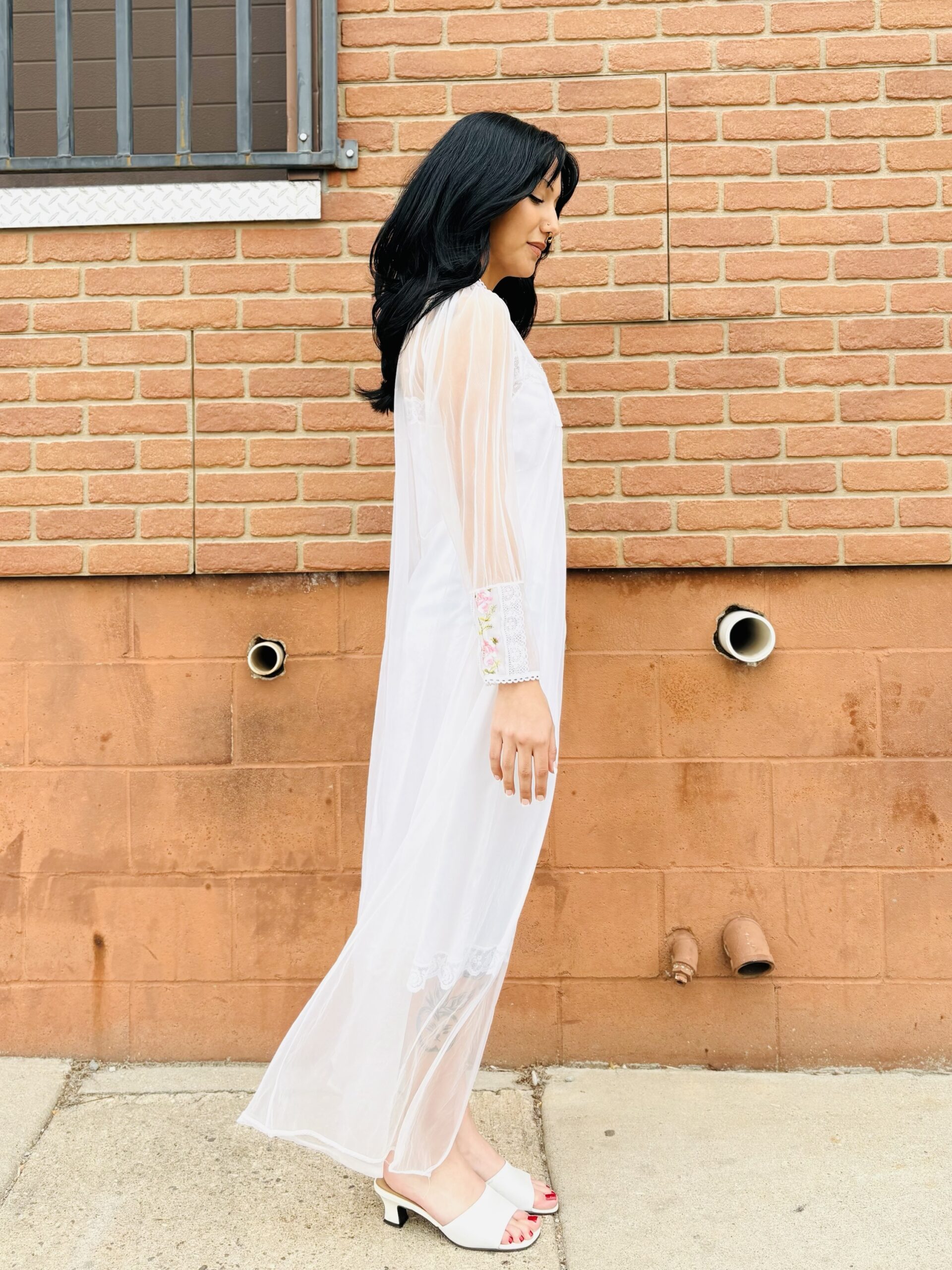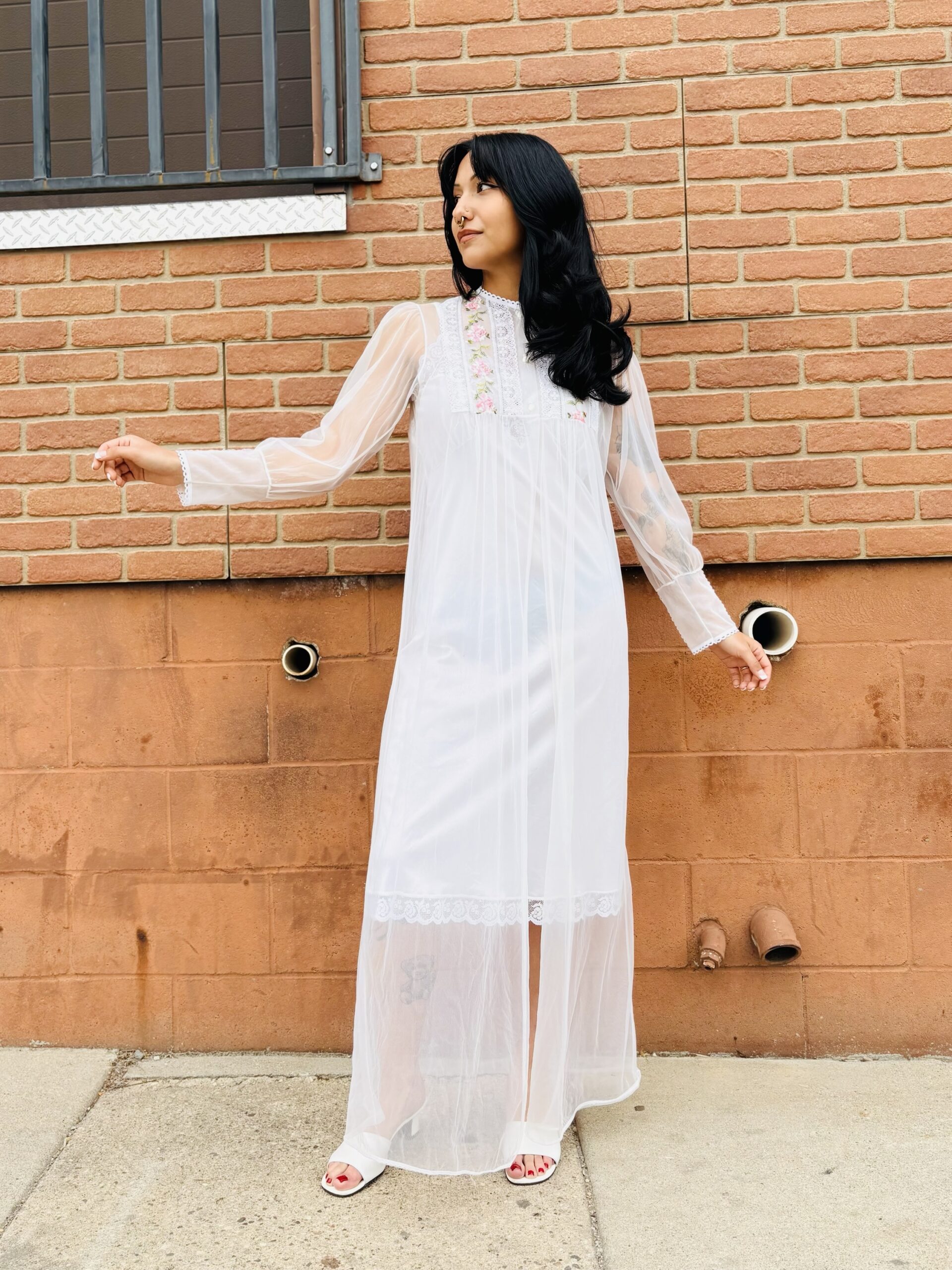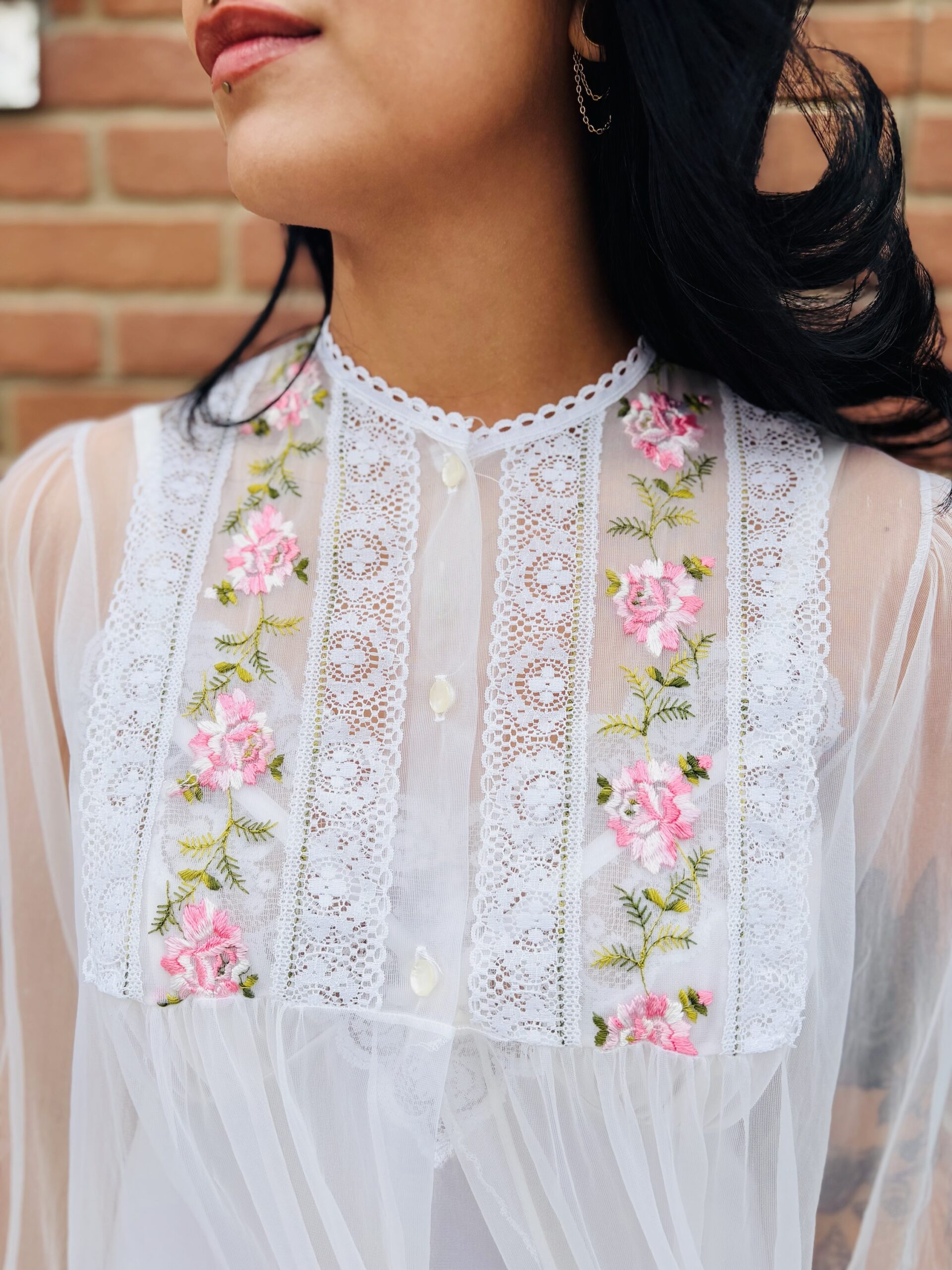 1970s, beige color, lace/floral embroidered chest & cuffs, crew neckline, button front chest, long sleeves, maxi length, sheer chiffon.
