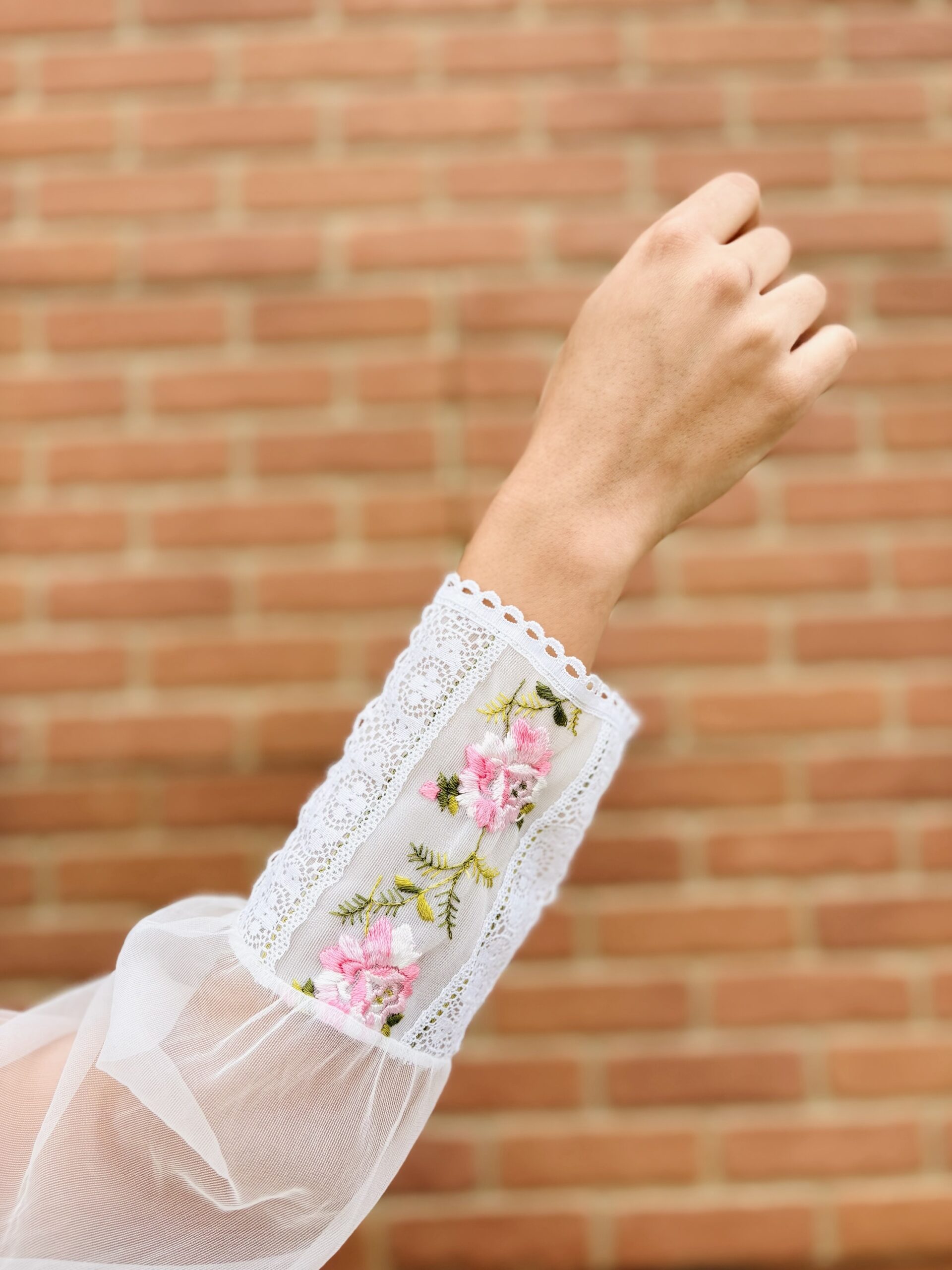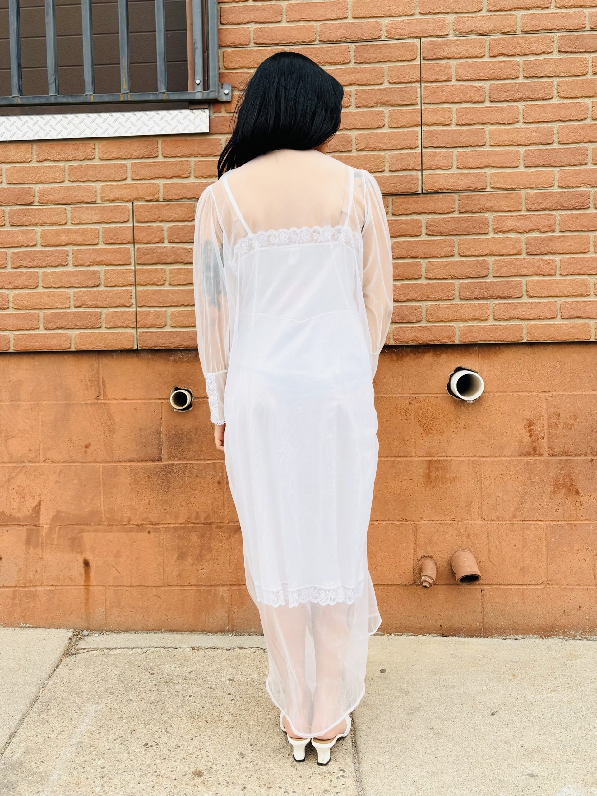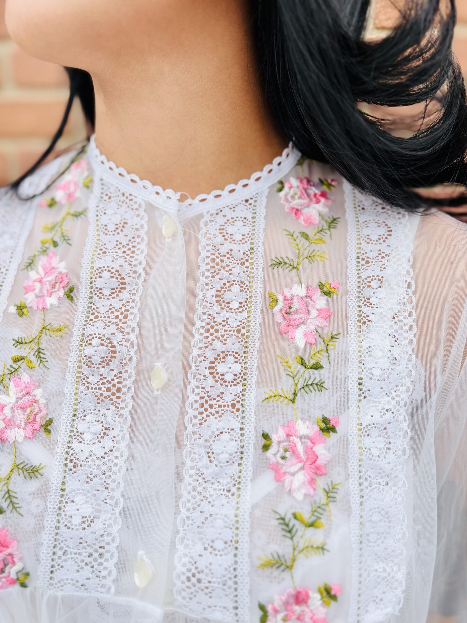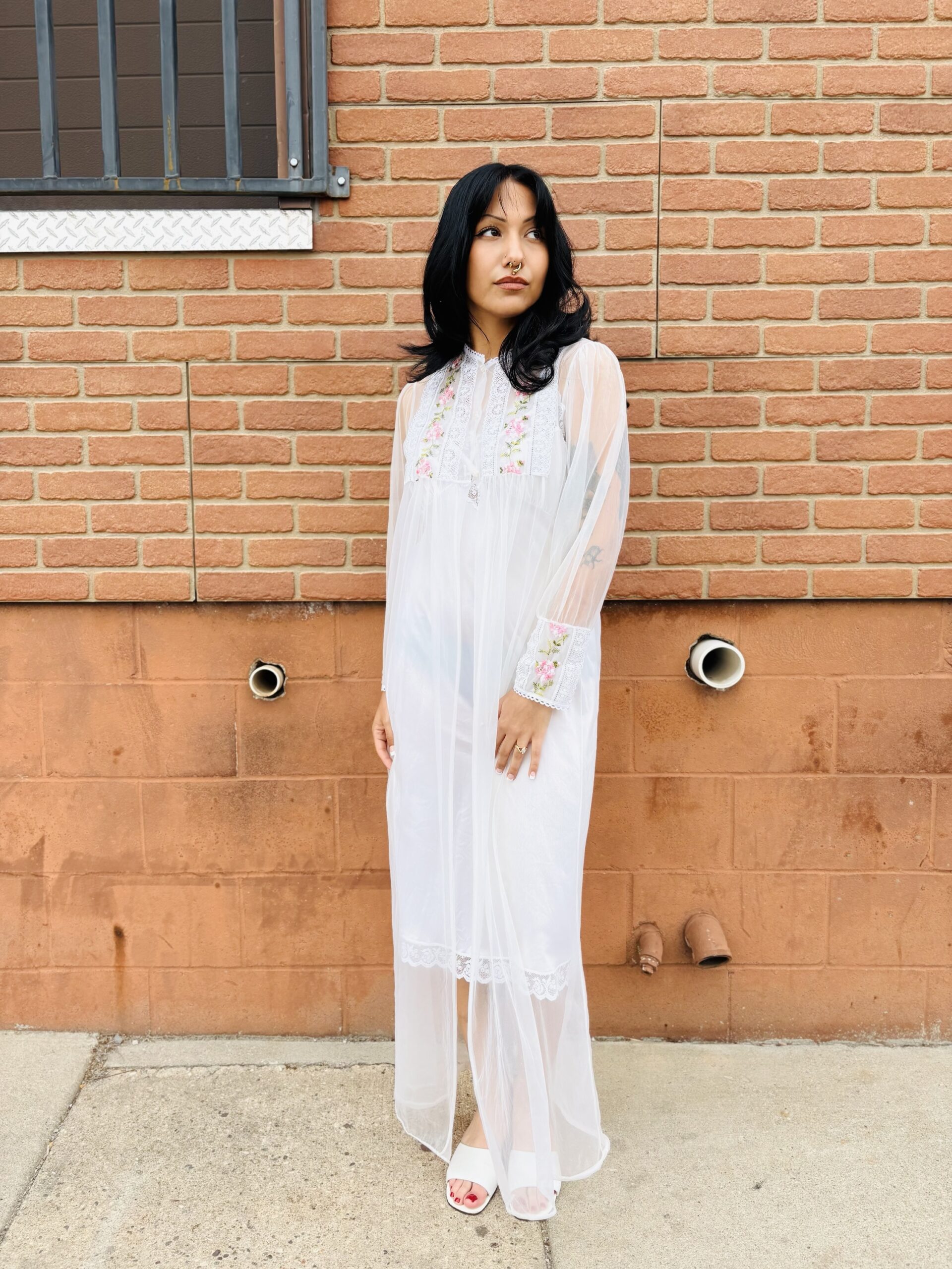 1970s, beige color, lace/floral embroidered chest & cuffs, crew neckline, button front chest, long sleeves, maxi length, sheer chiffon.