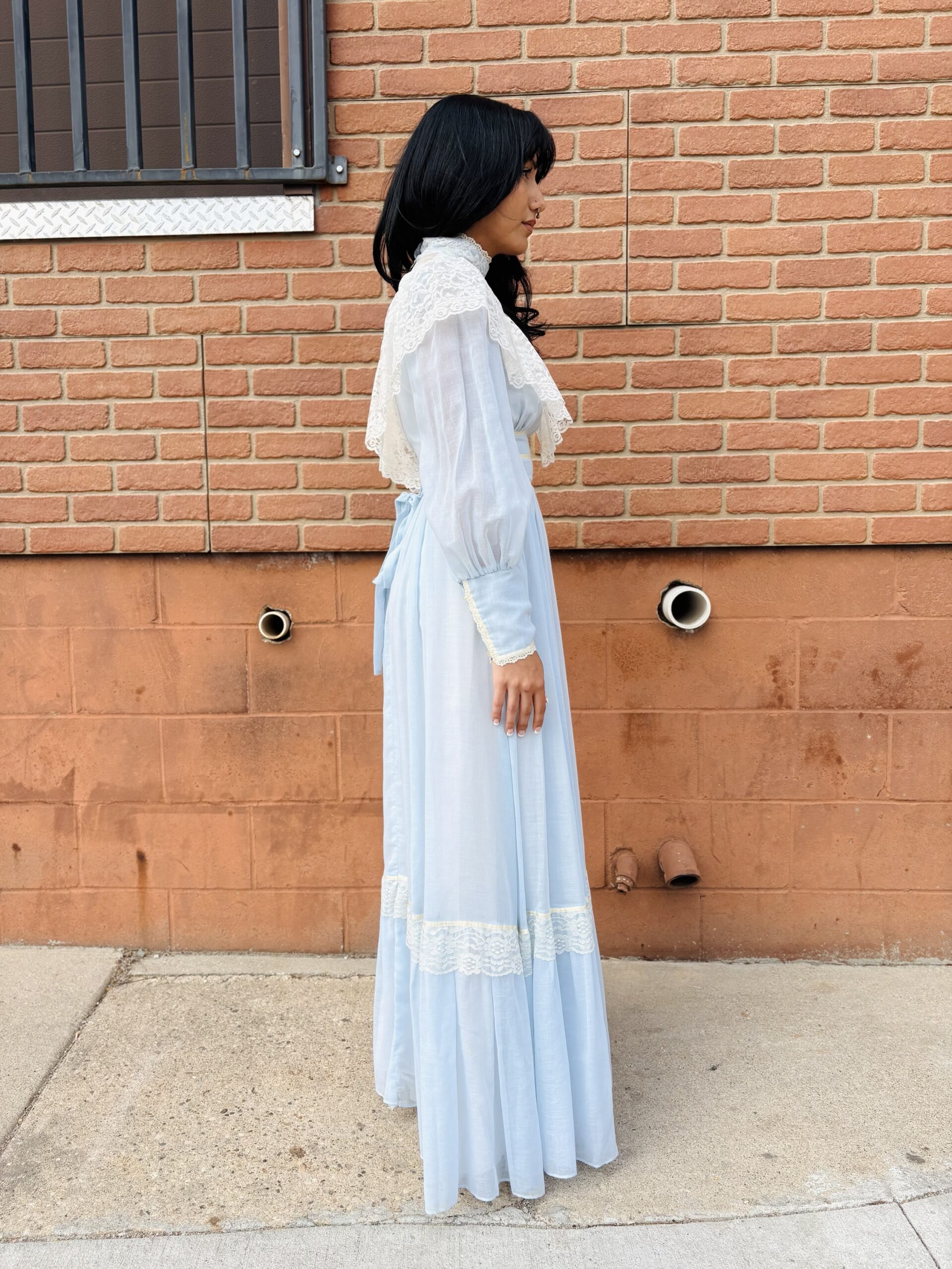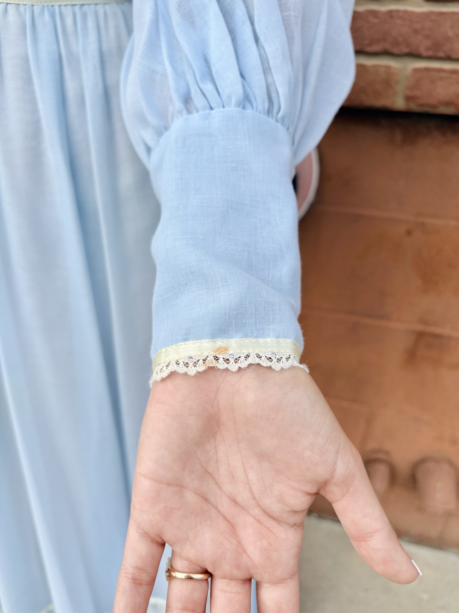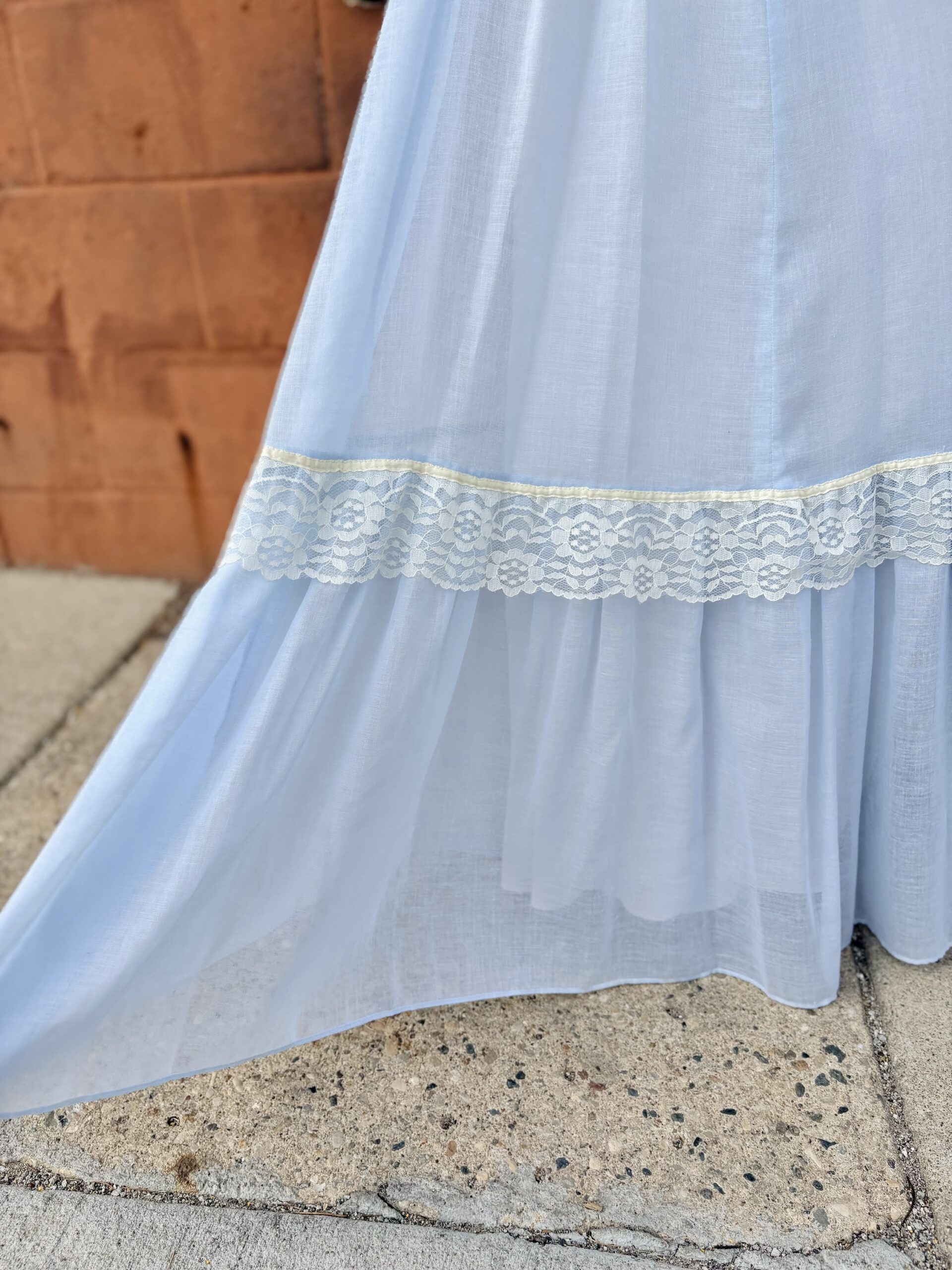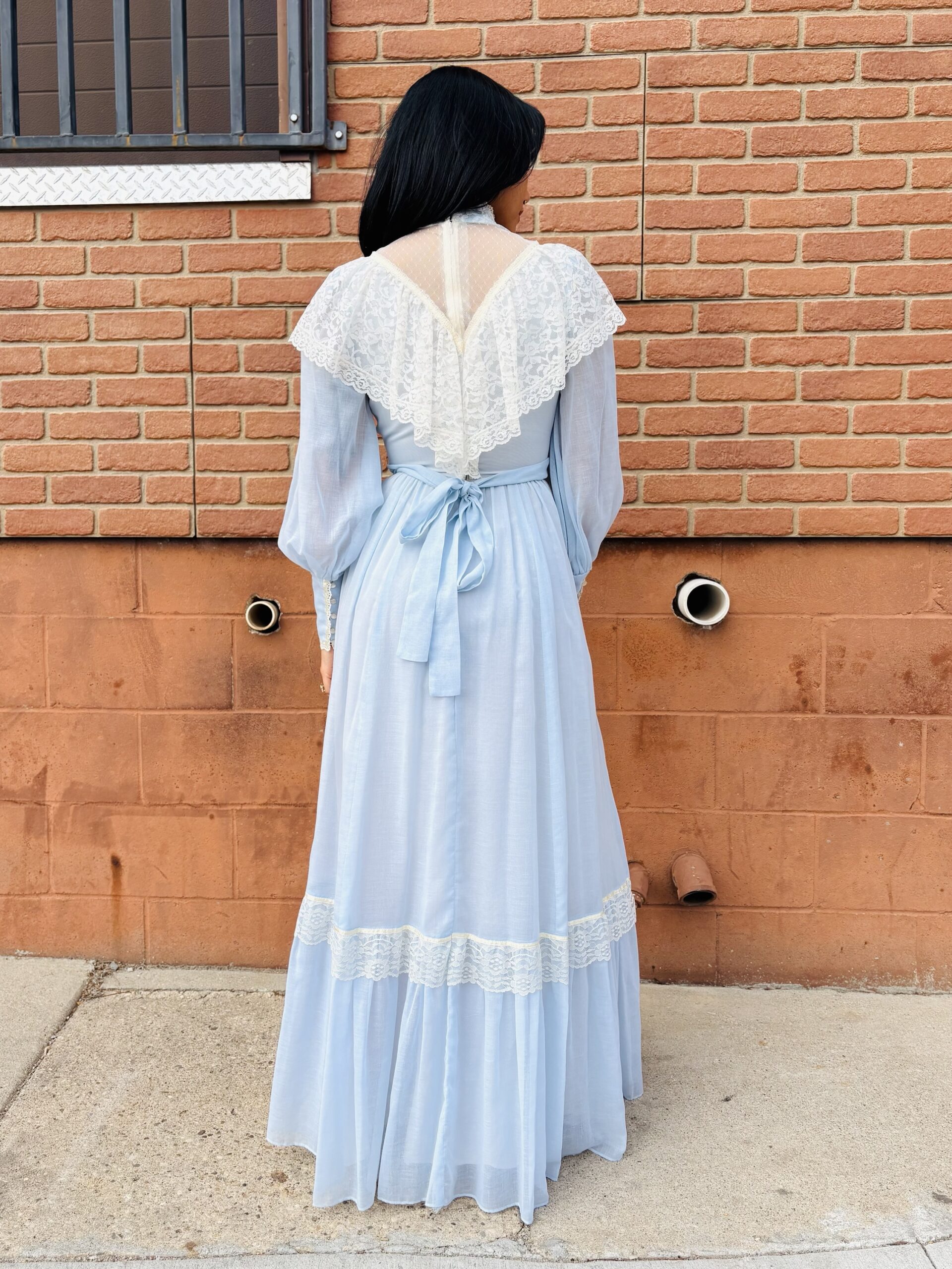 1970s, light blue/beige, band collar, semi-sheer long sleeves, pearly buttons on cuff, triple ribbon waist, tie back, maxi length, spine zipper, hook & eye back collar, lined, flounce hem, 65% polyester 35% cotton.