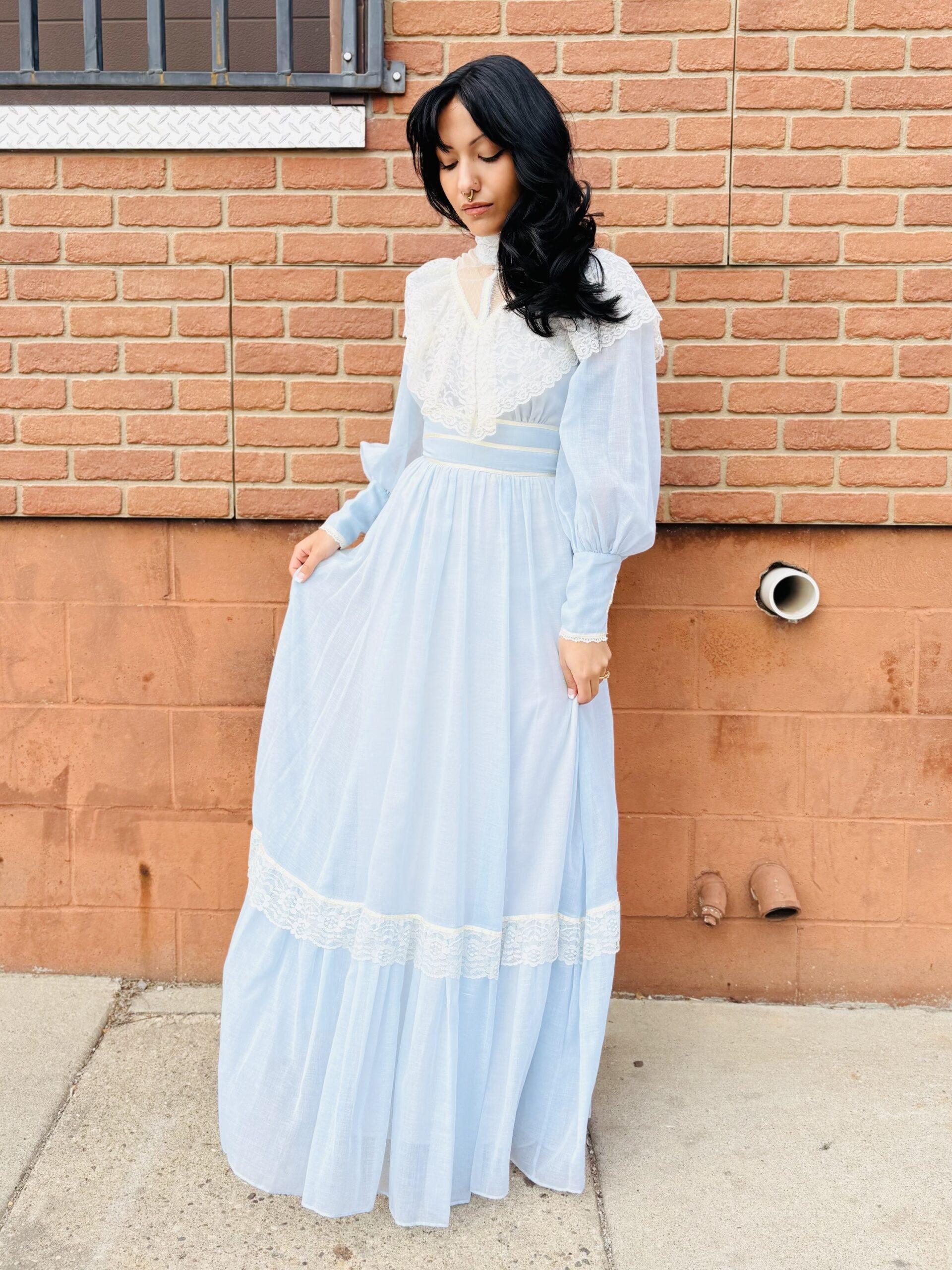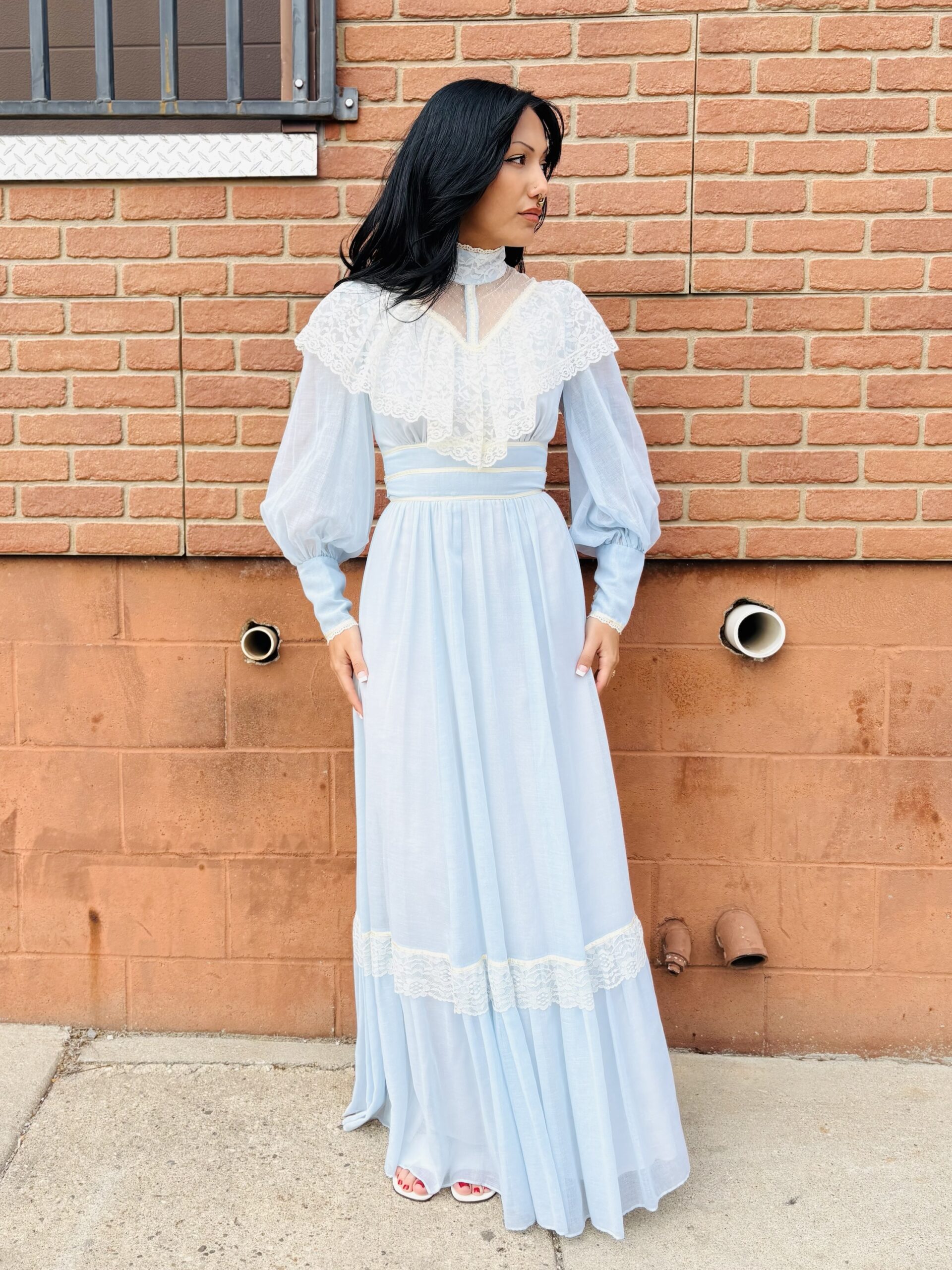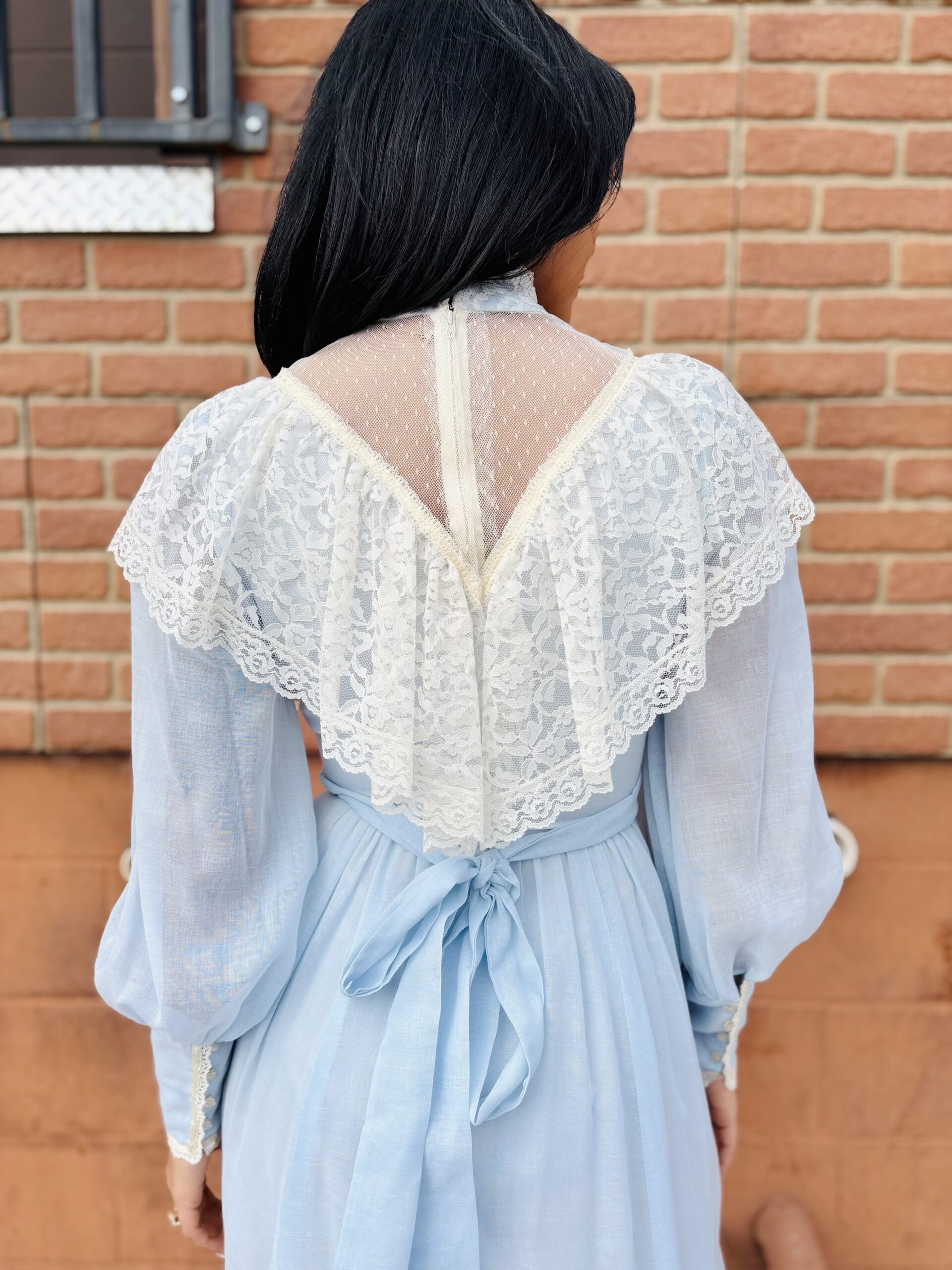 1970s, light blue/beige, band collar, semi-sheer long sleeves, pearly buttons on cuff, triple ribbon waist, tie back, maxi length, spine zipper, hook & eye back collar, lined, flounce hem, 65% polyester 35% cotton.