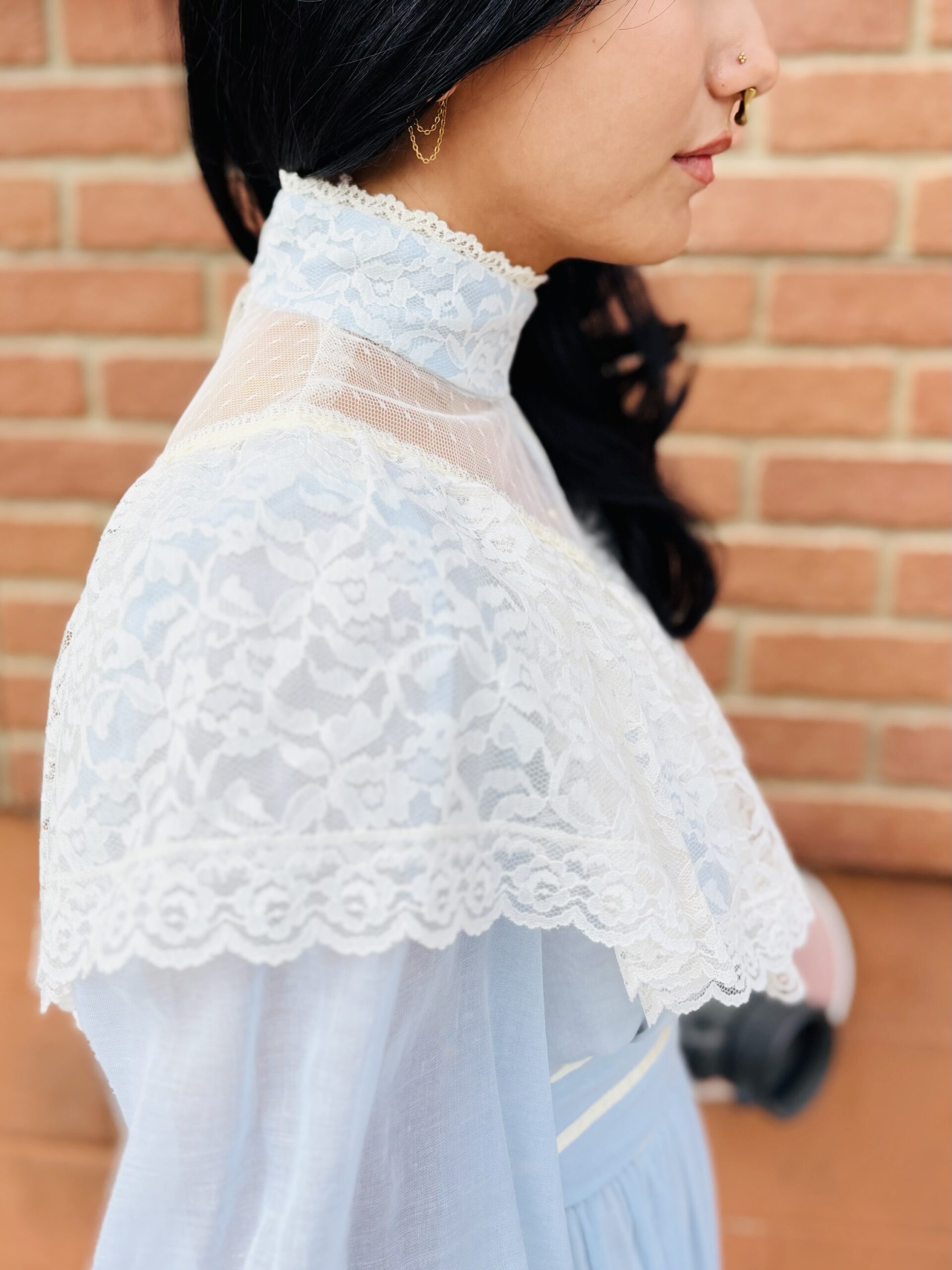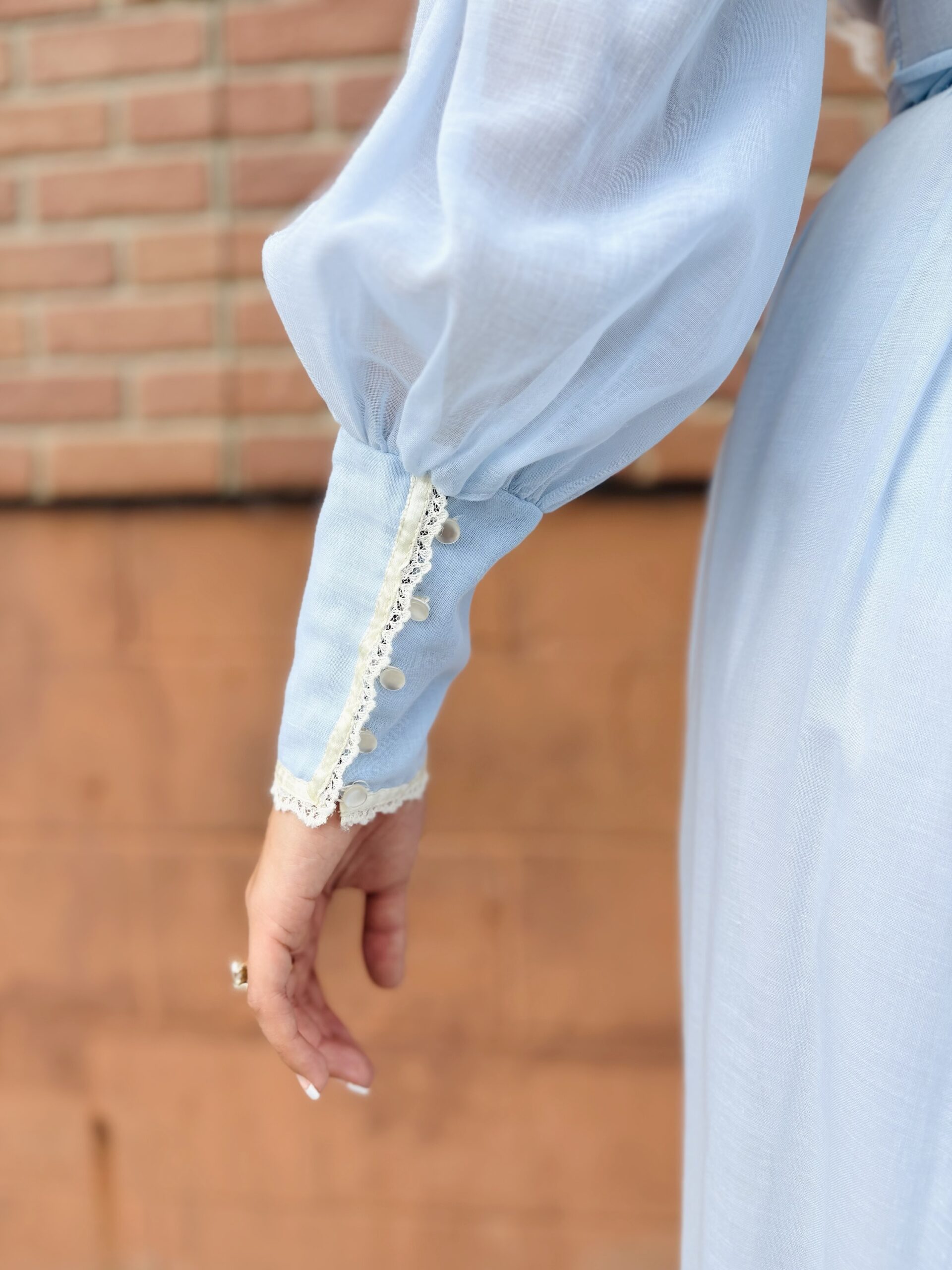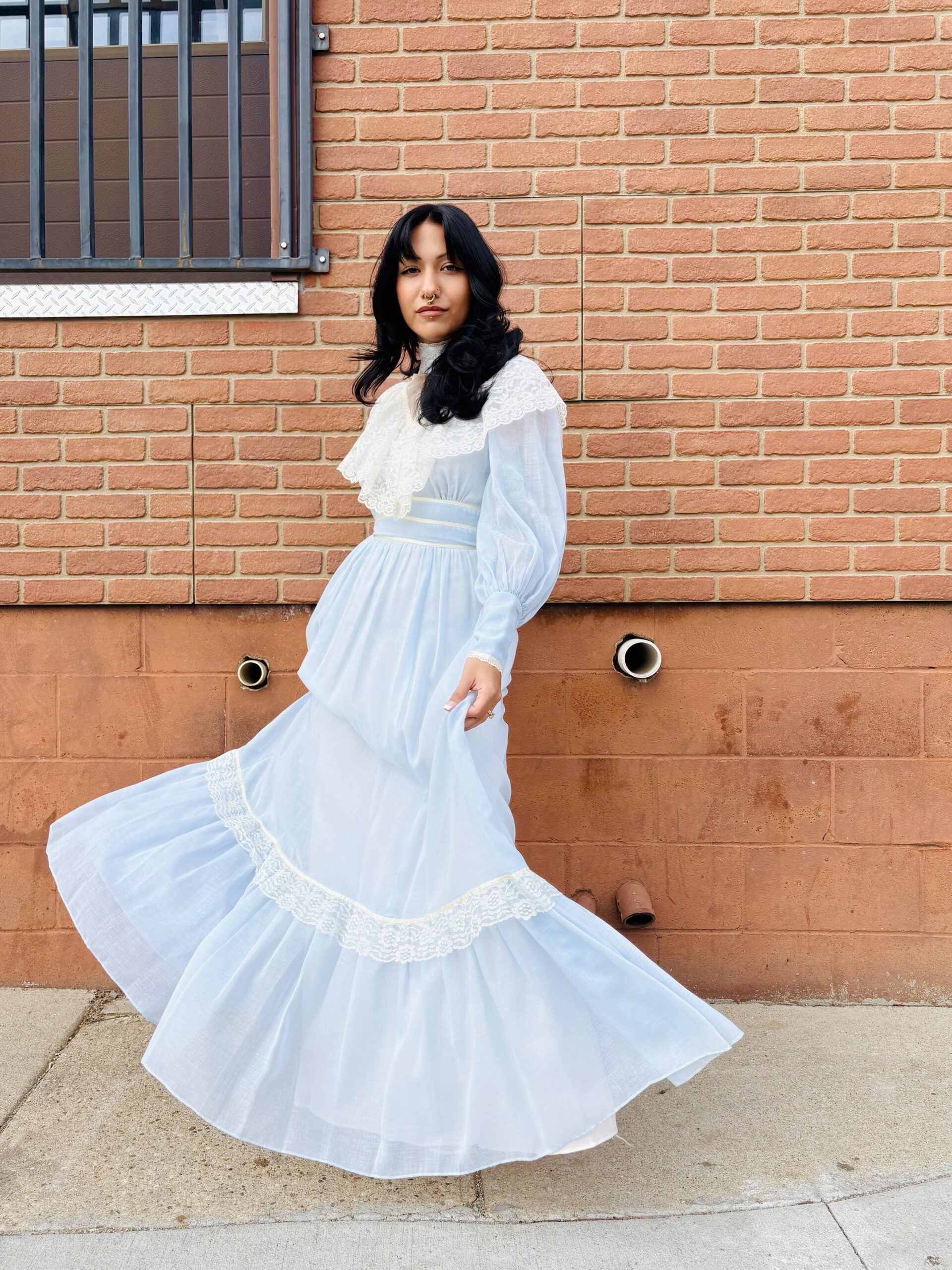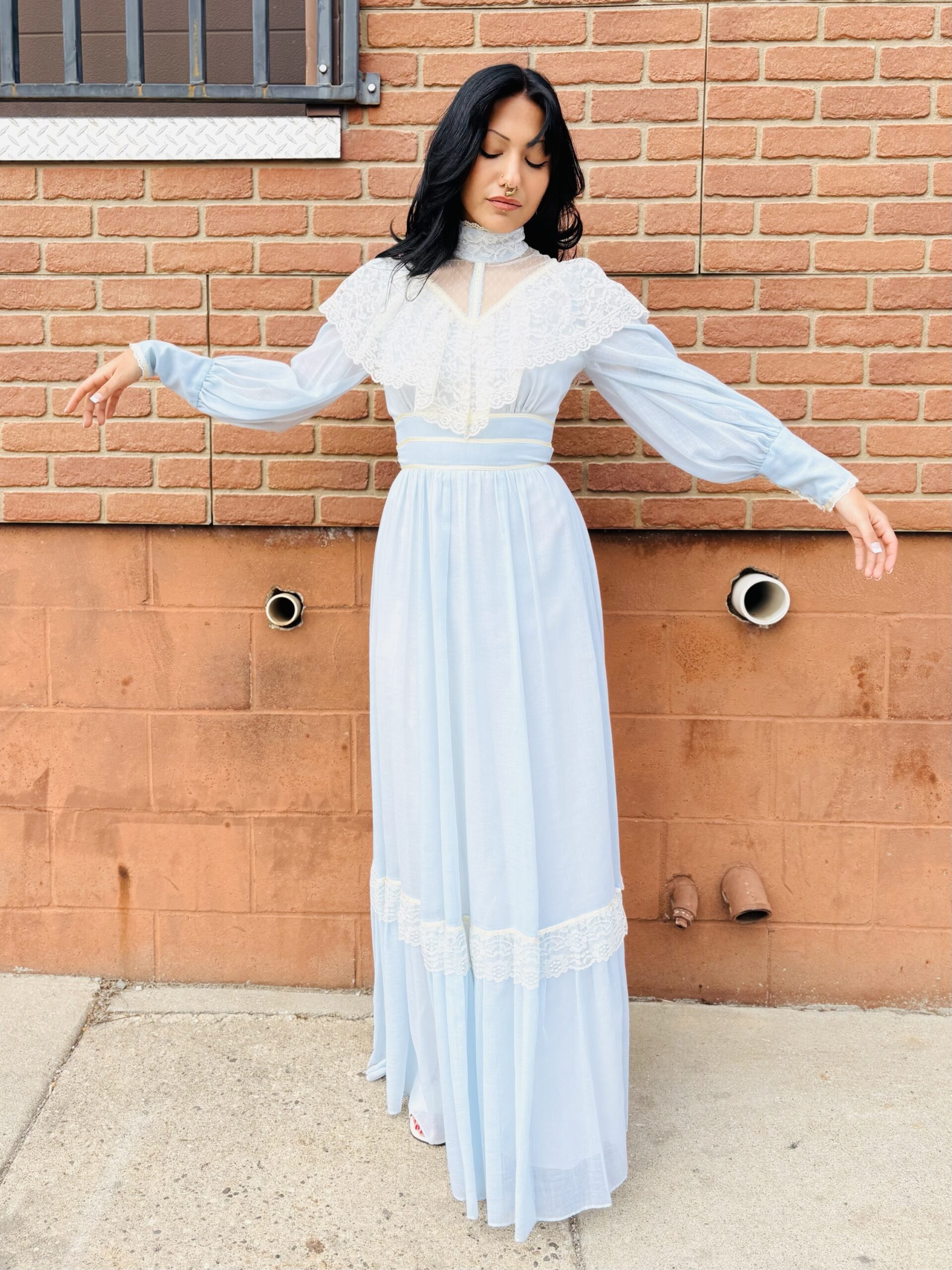 1970s, light blue/beige, band collar, semi-sheer long sleeves, pearly buttons on cuff, triple ribbon waist, tie back, maxi length, spine zipper, hook & eye back collar, lined, flounce hem, 65% polyester 35% cotton.