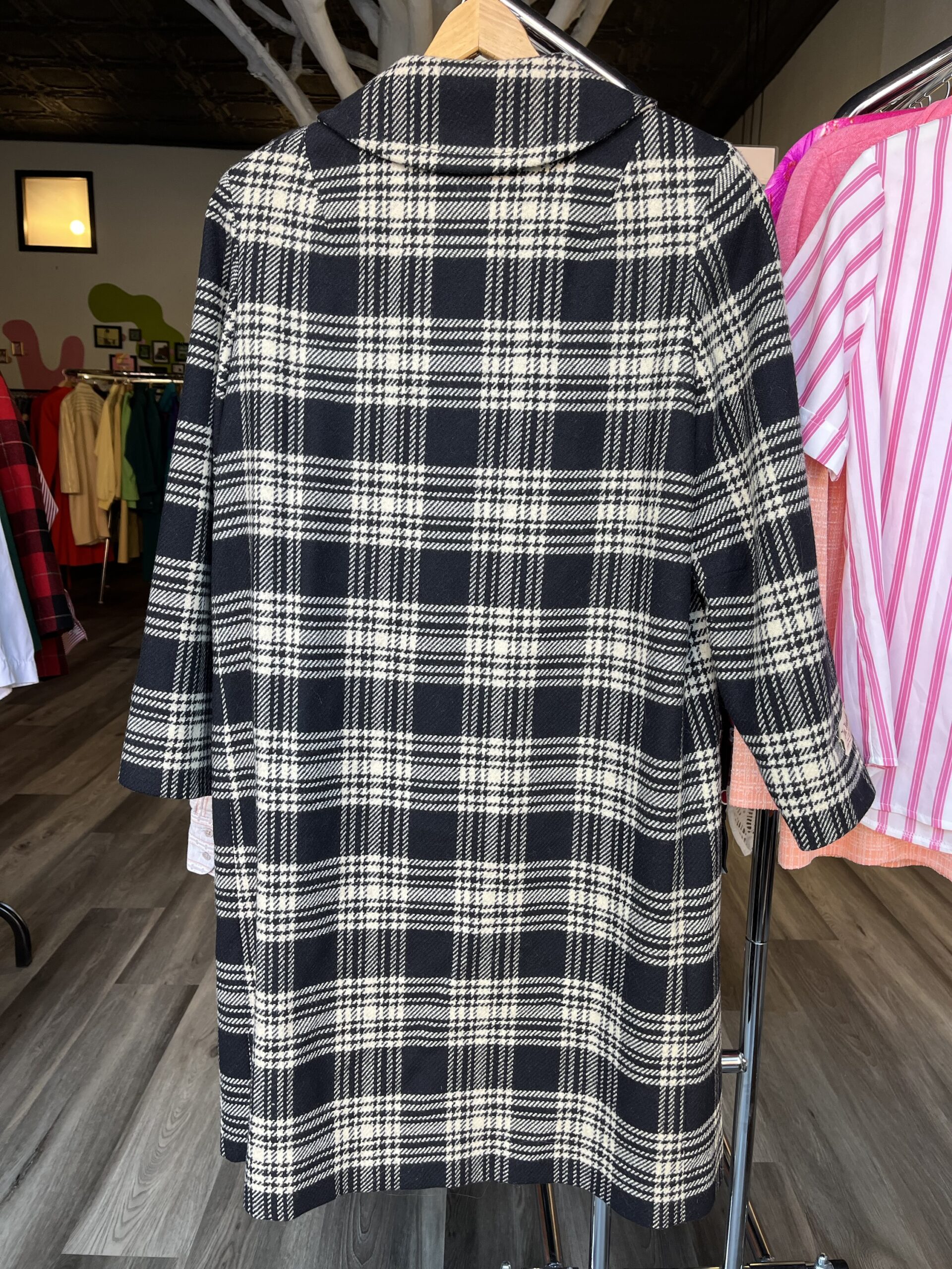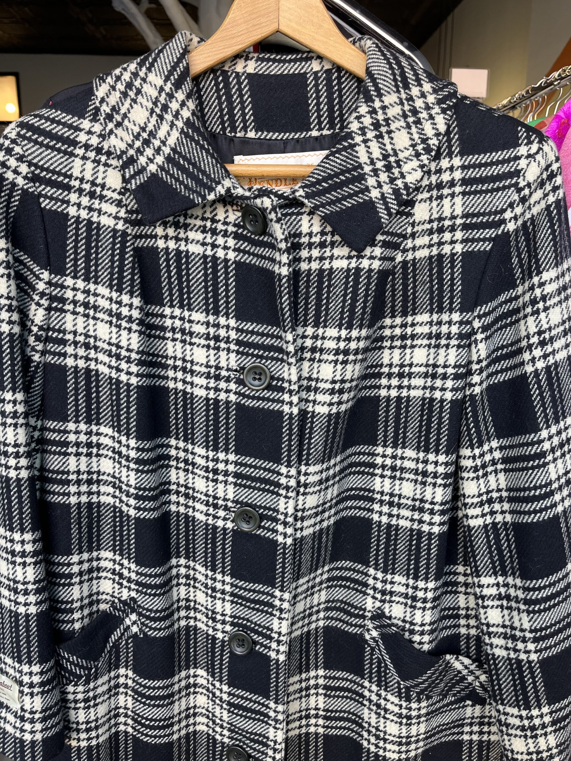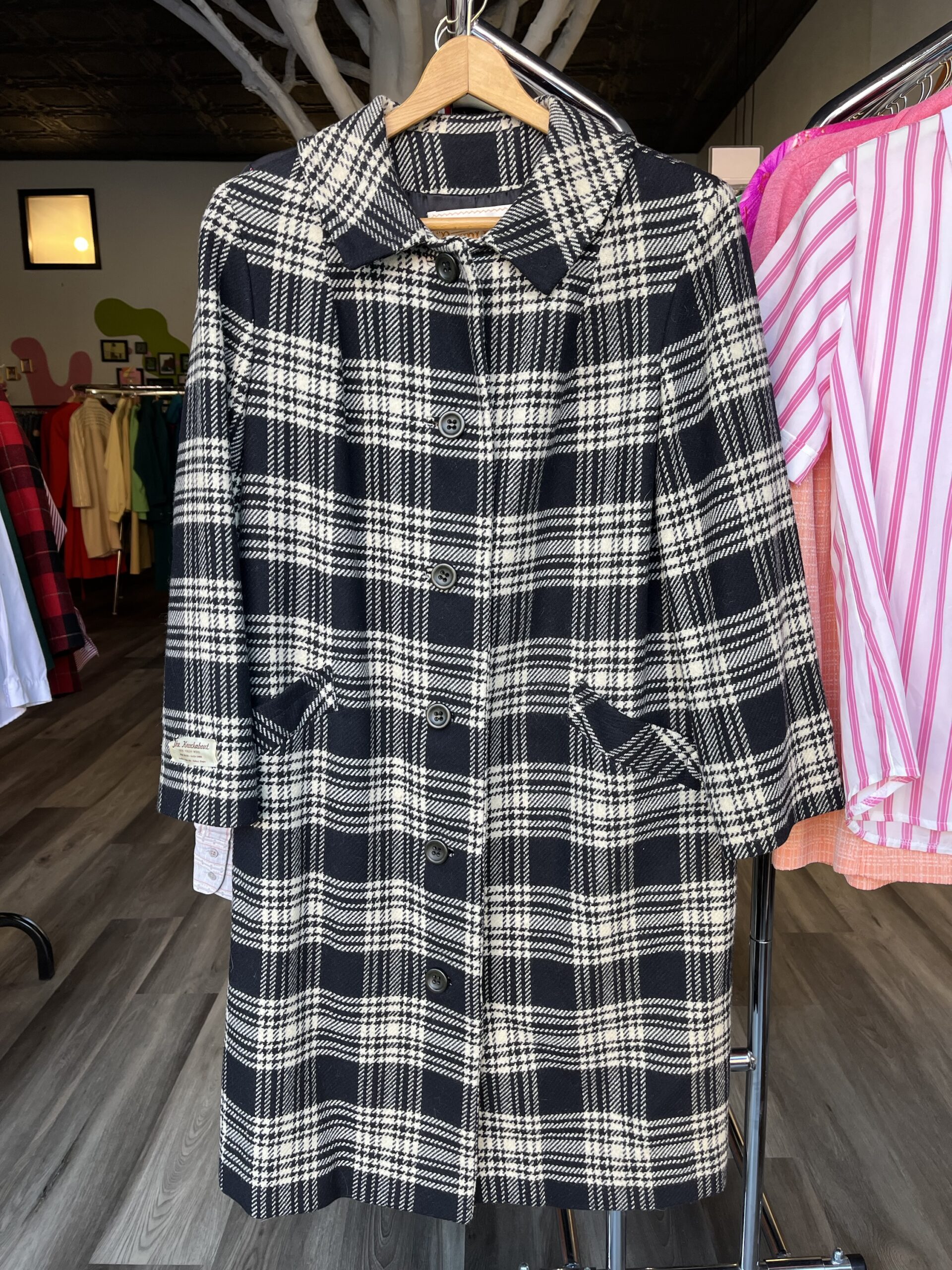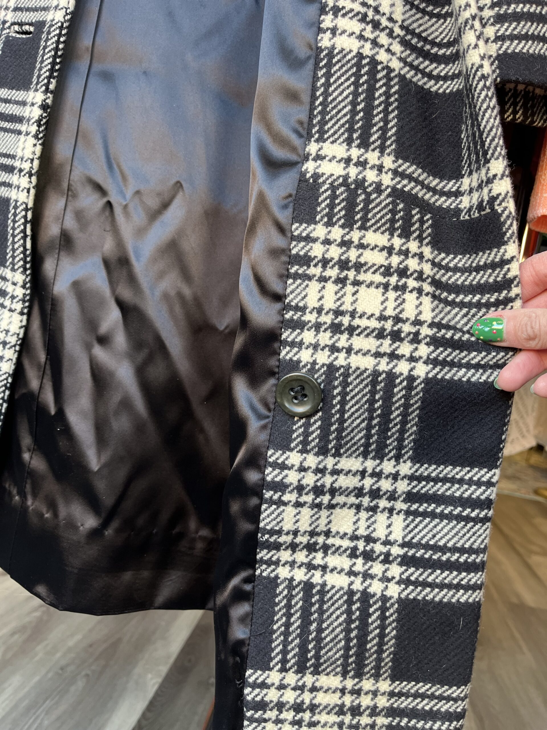 Circa late ‘60s/early ‘70s, black and white plaid/houndstooth print, button-front closure, collared, front slit pockets, fully lined with satin rayon fabric, 100% wool shell. Has a tag on the outer, right sleeve. Buttons are nearly black, but in natural light they’re a subtle, very dark green color. It still has an extra button attached on the inside.