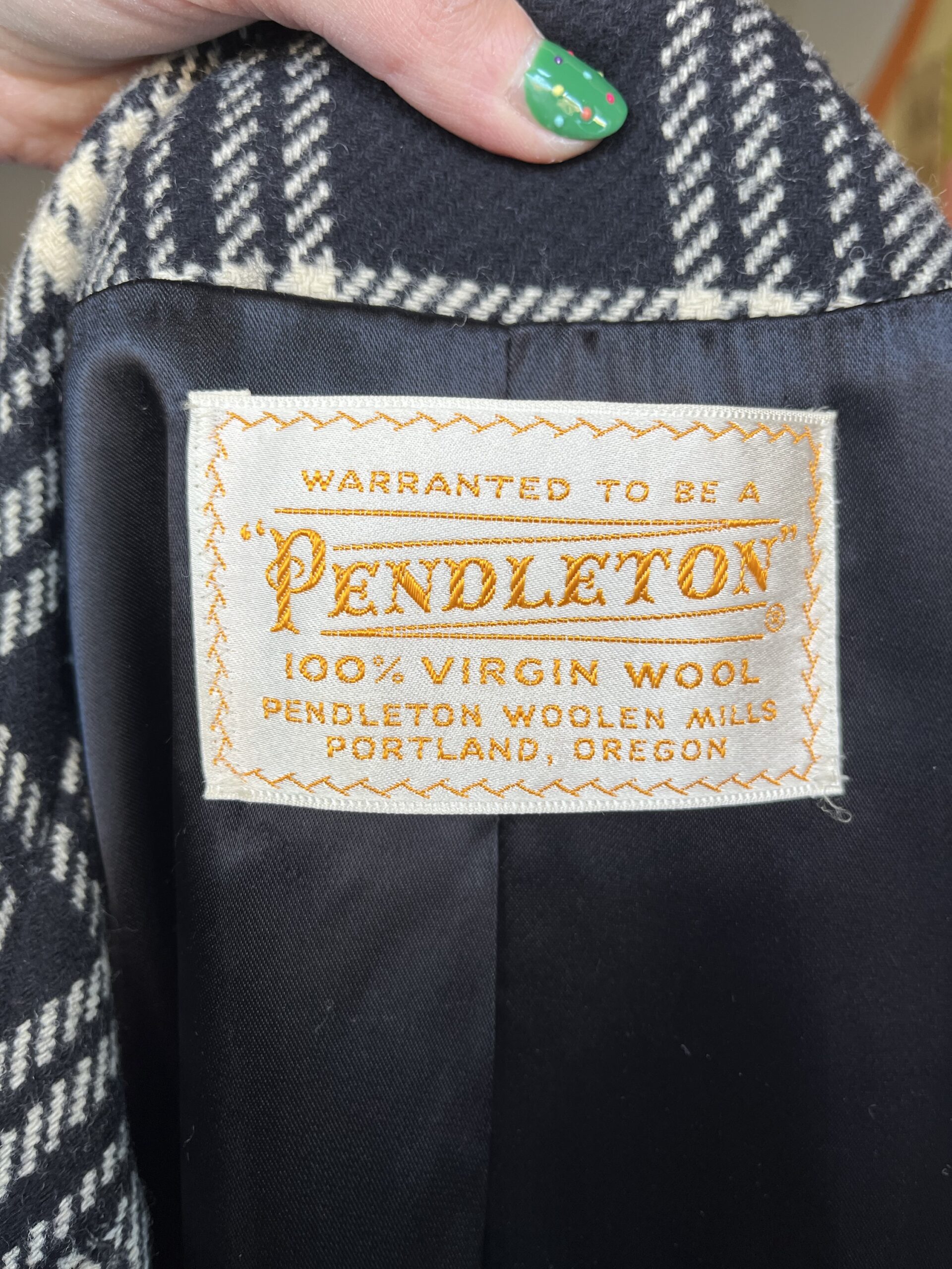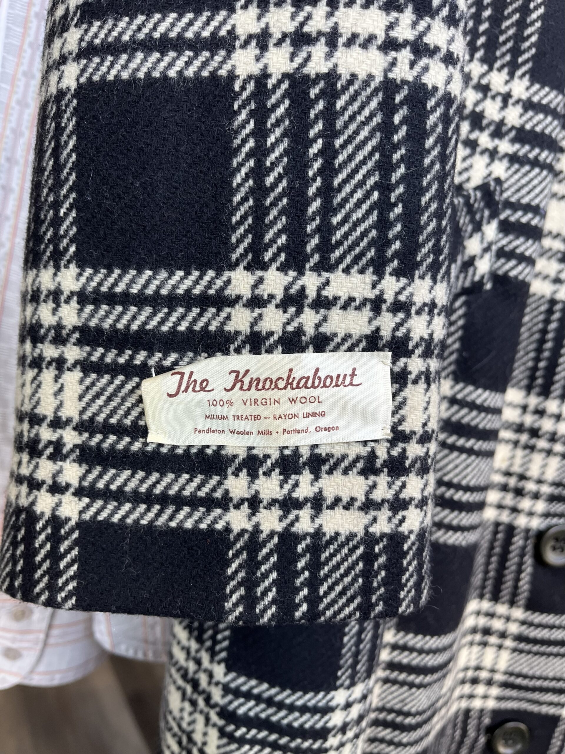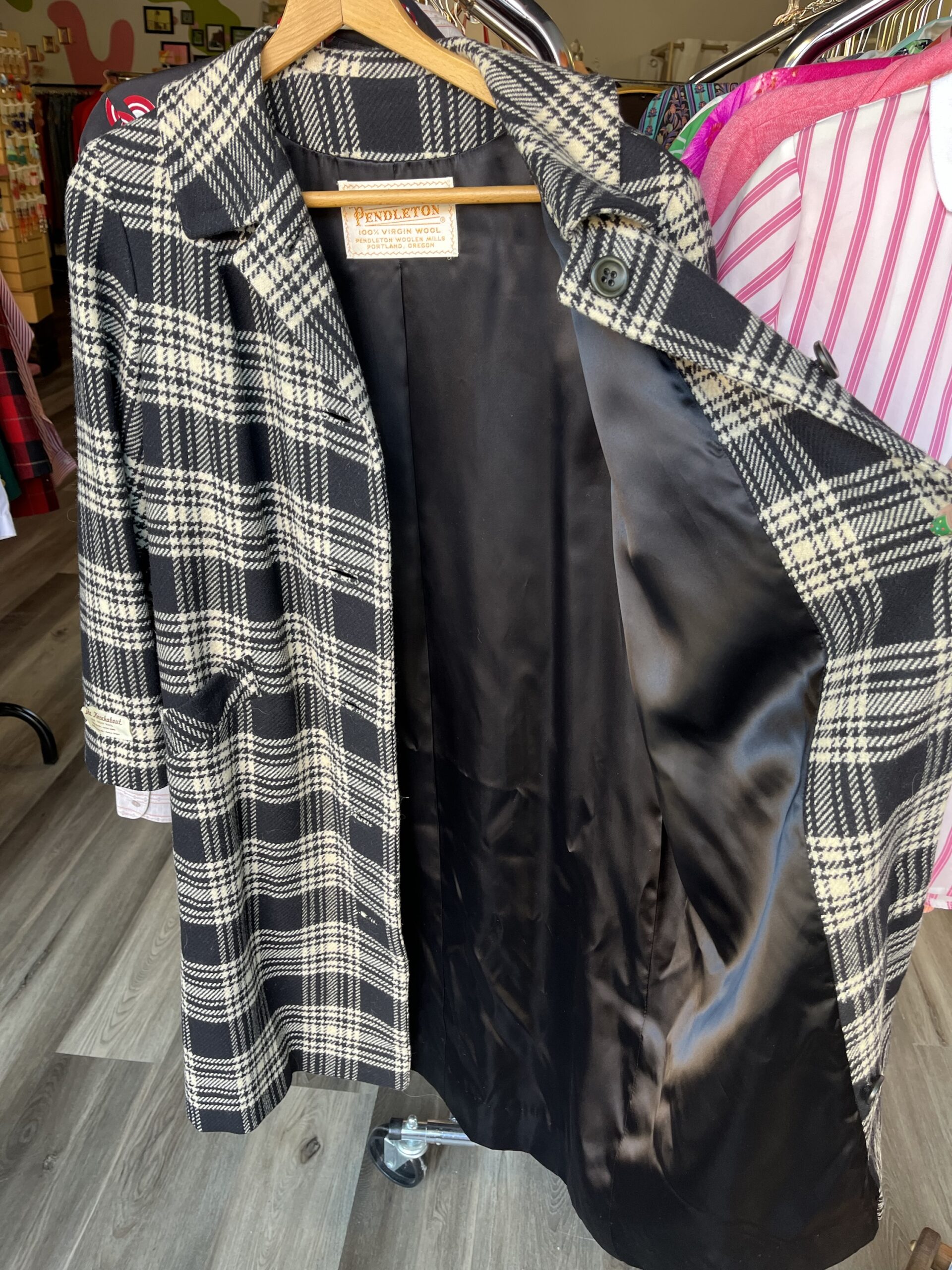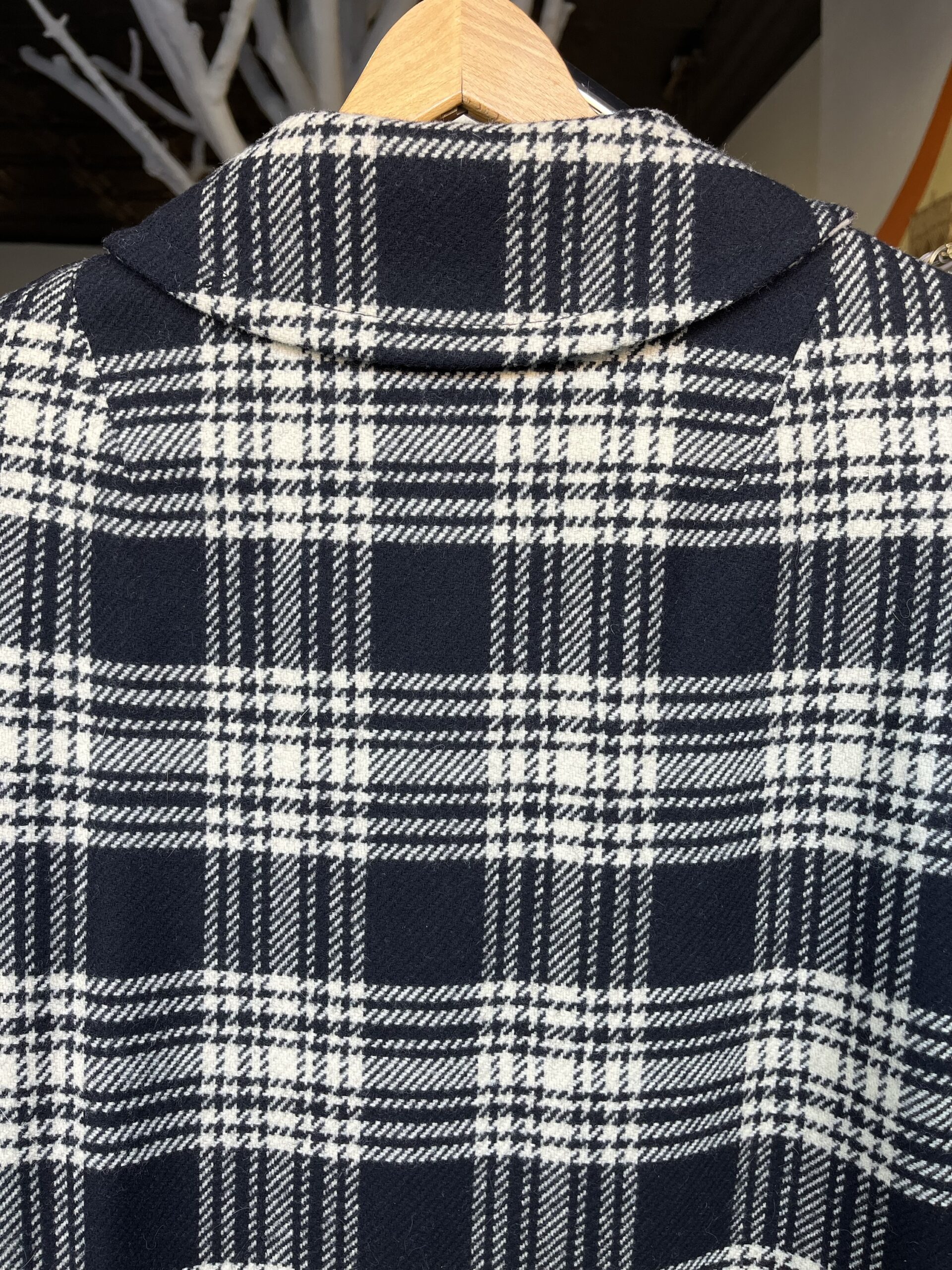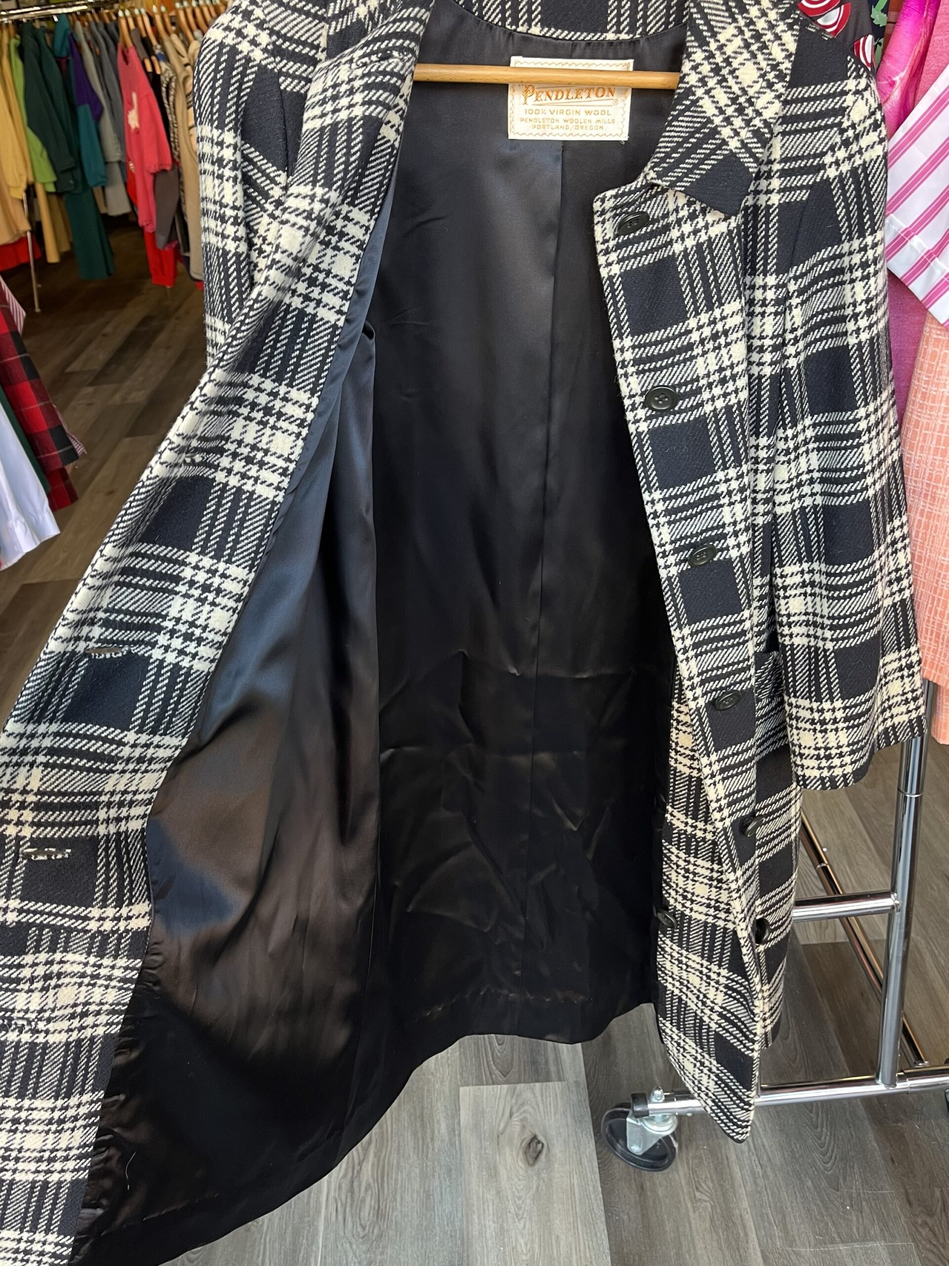 Circa late ‘60s/early ‘70s, black and white plaid/houndstooth print, button-front closure, collared, front slit pockets, fully lined with satin rayon fabric, 100% wool shell. Has a tag on the outer, right sleeve. Buttons are nearly black, but in natural light they’re a subtle, very dark green color. It still has an extra button attached on the inside.