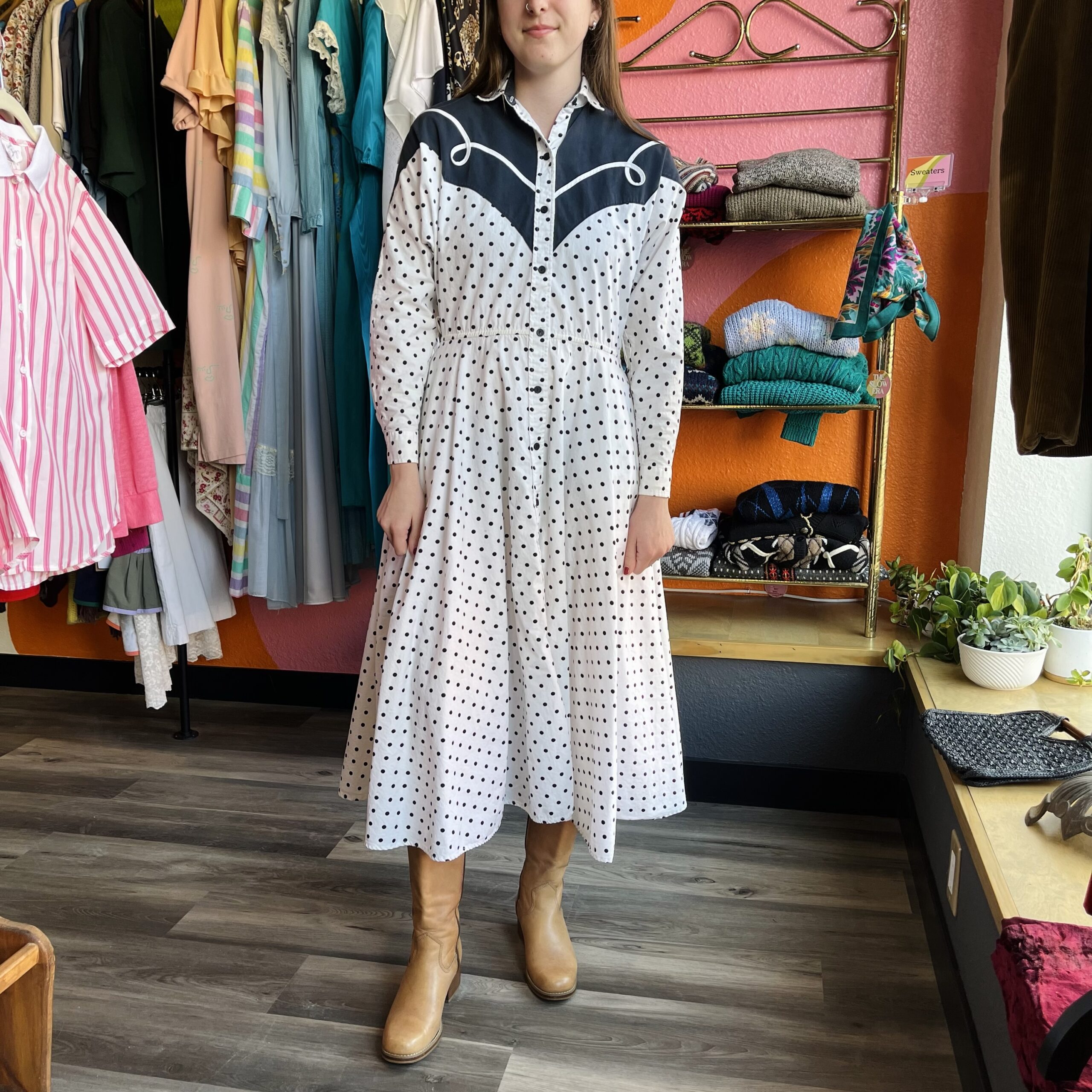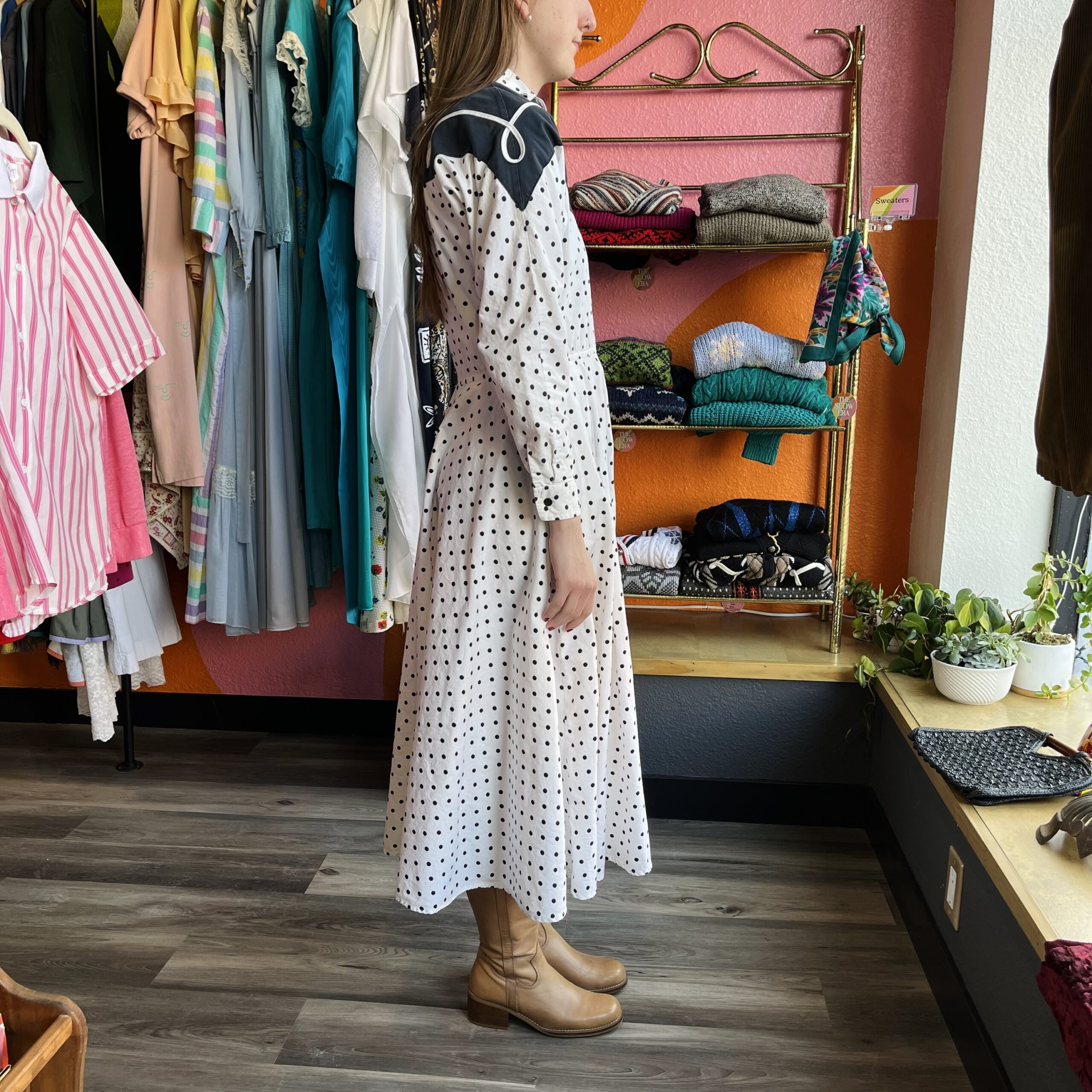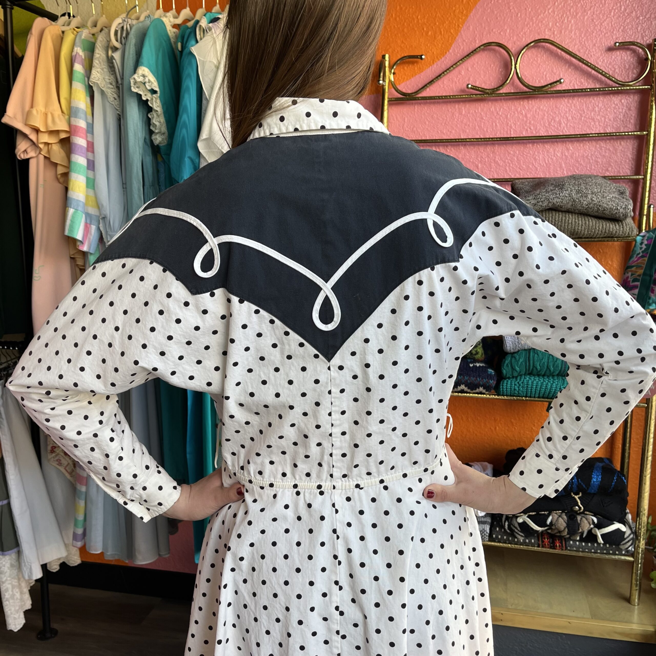 1980s, black/white, polka dot print, Aline silhouette, maxi length, collared, button up, long sleeve, side slit pockets, belt loops, 100% cotton. Belt not included.