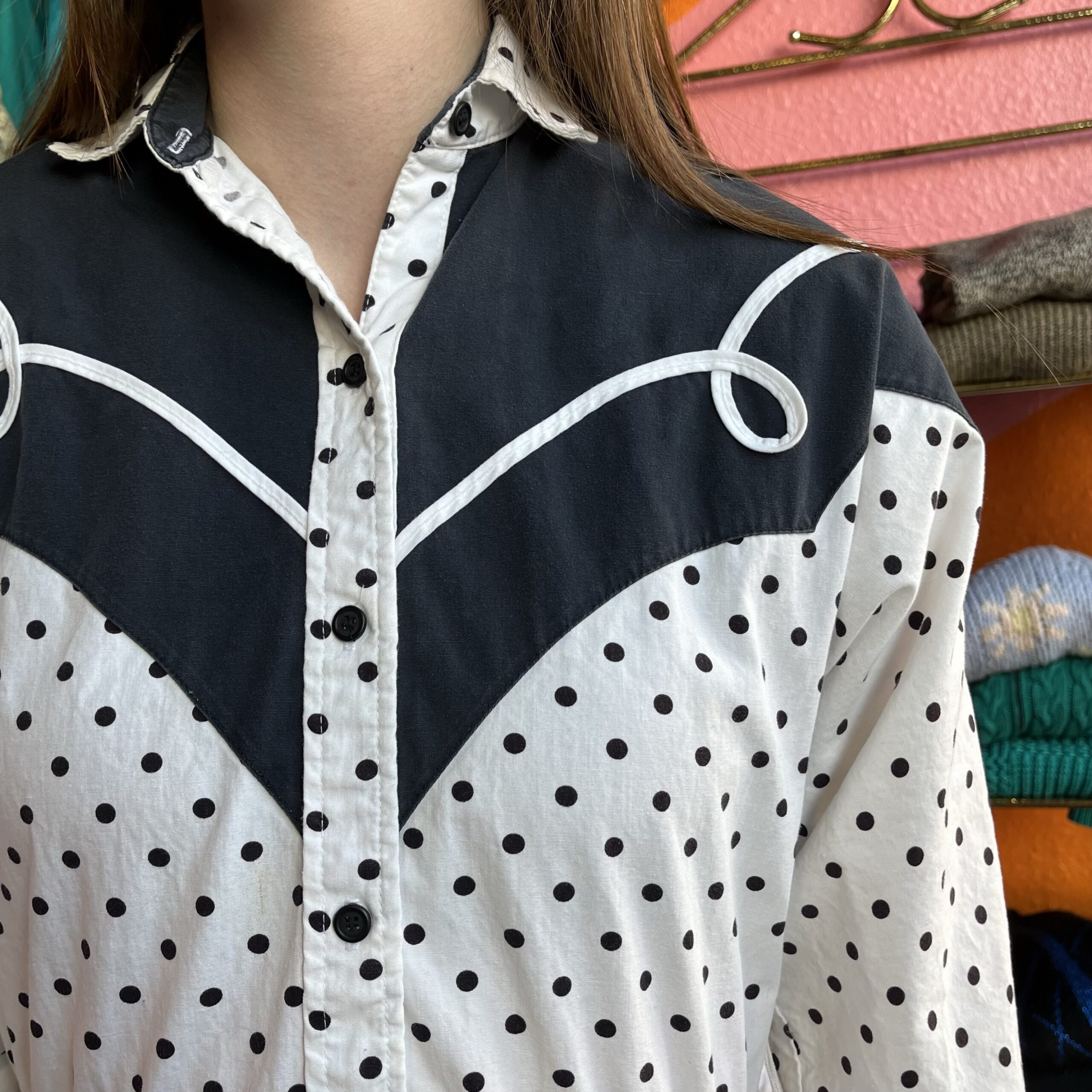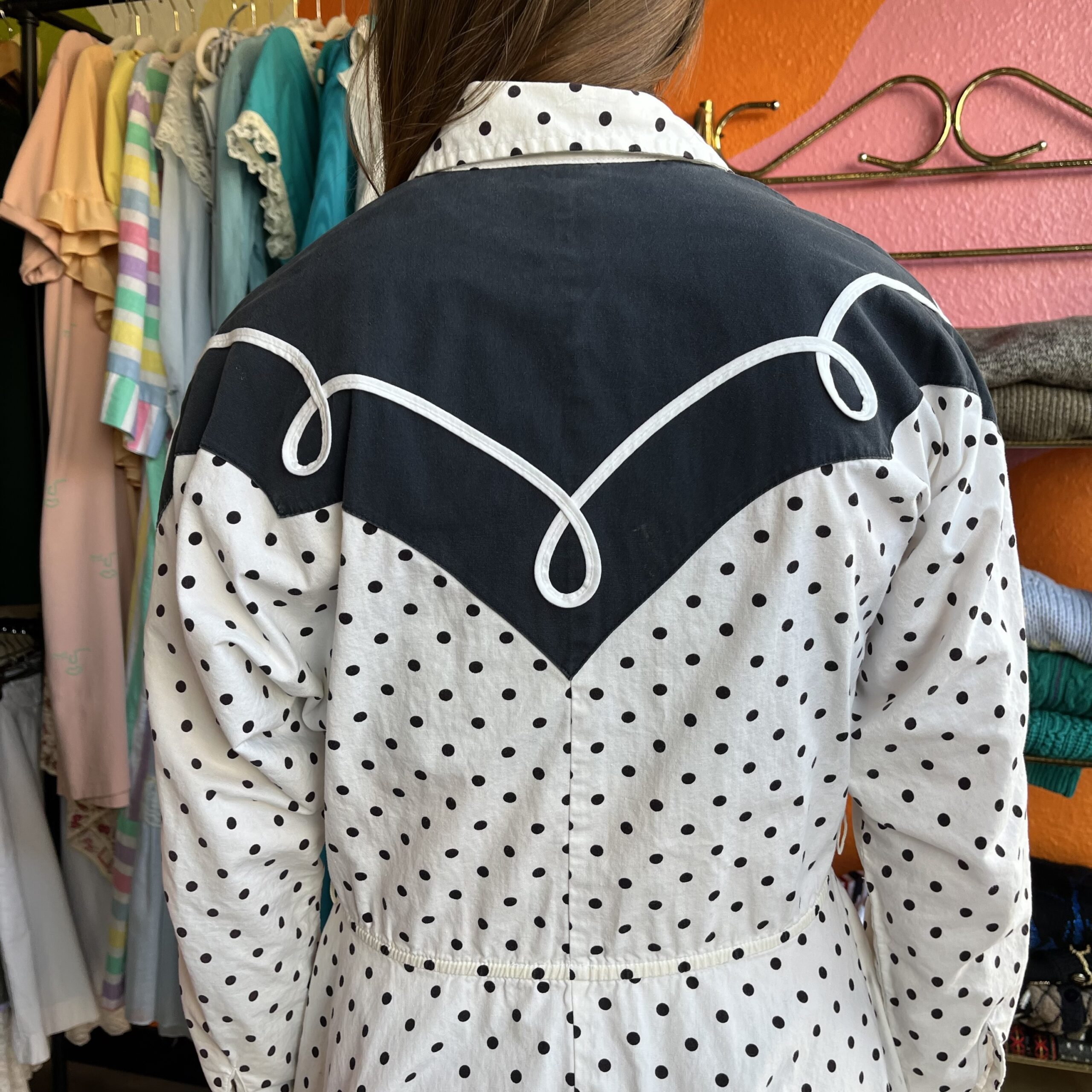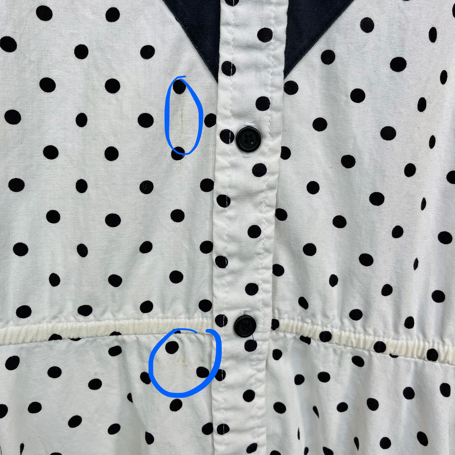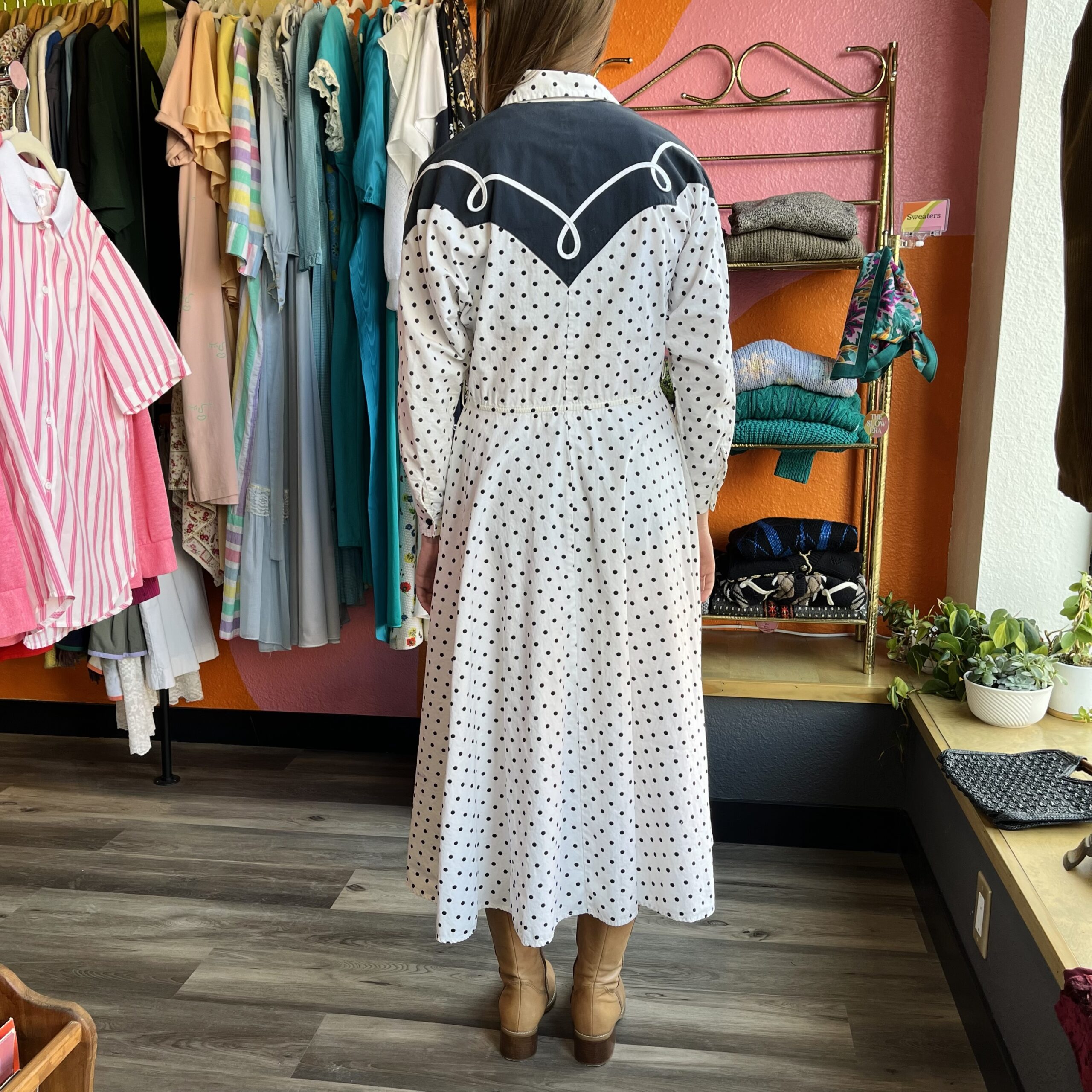 1980s, black/white, polka dot print, Aline silhouette, maxi length, collared, button up, long sleeve, side slit pockets, belt loops, 100% cotton. Belt not included.
