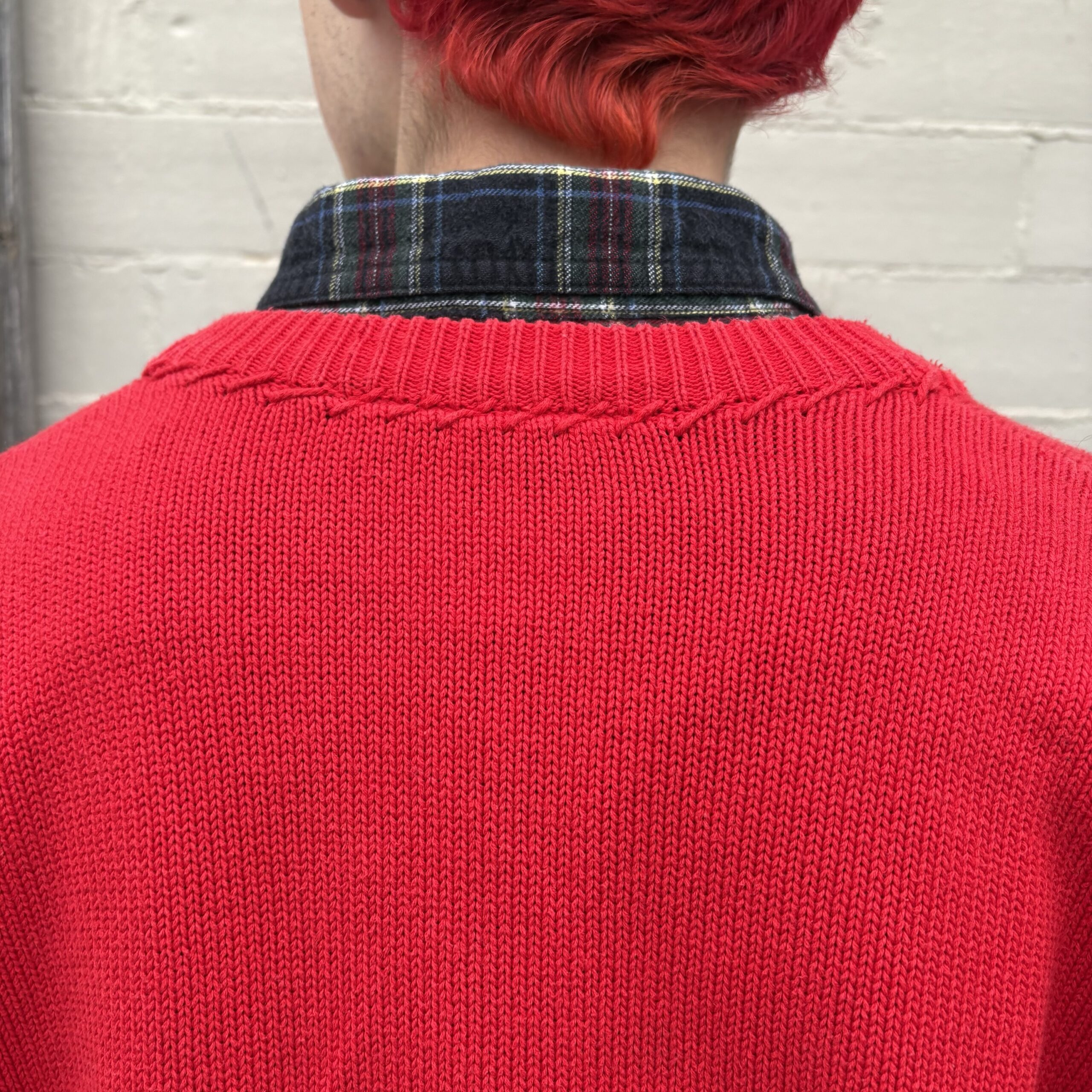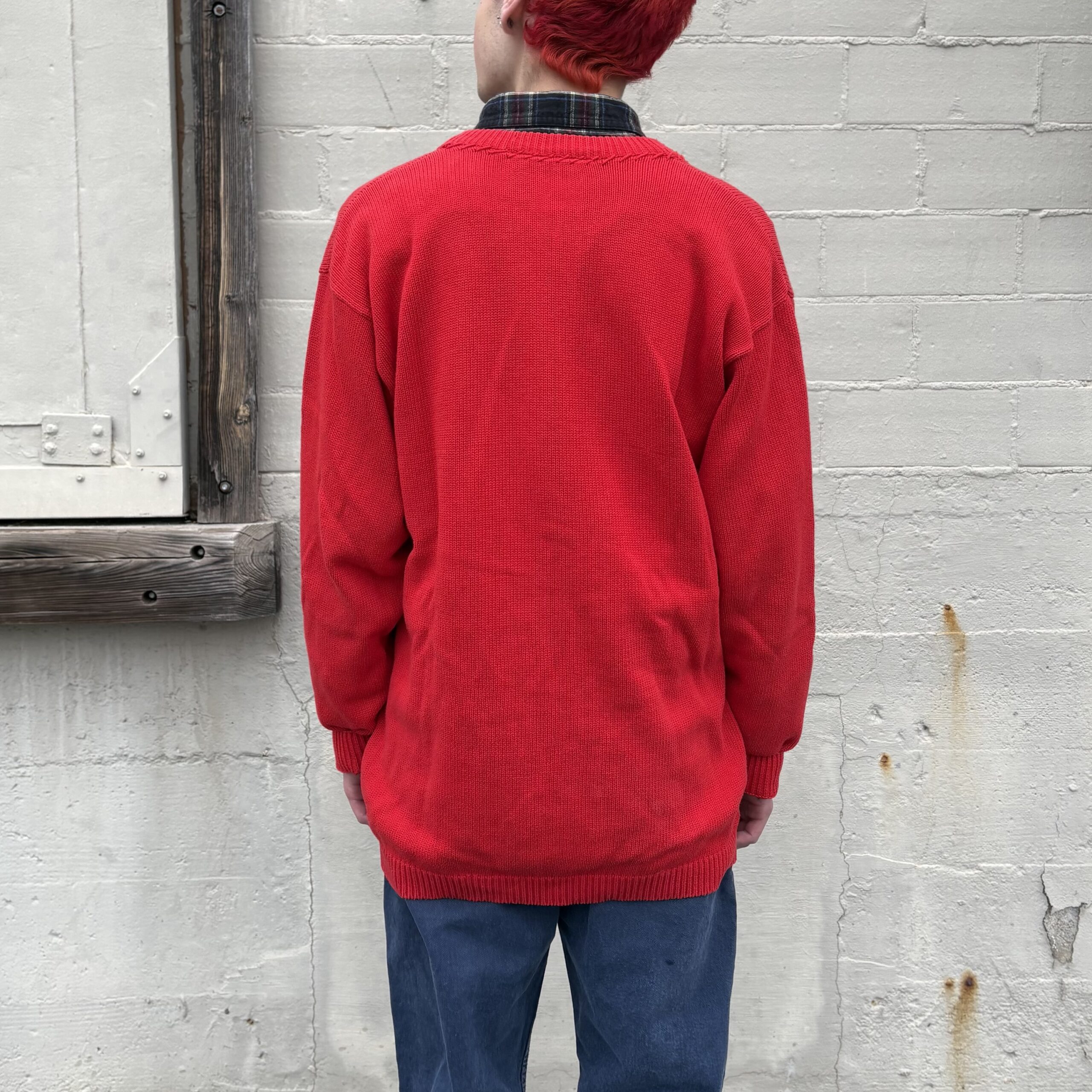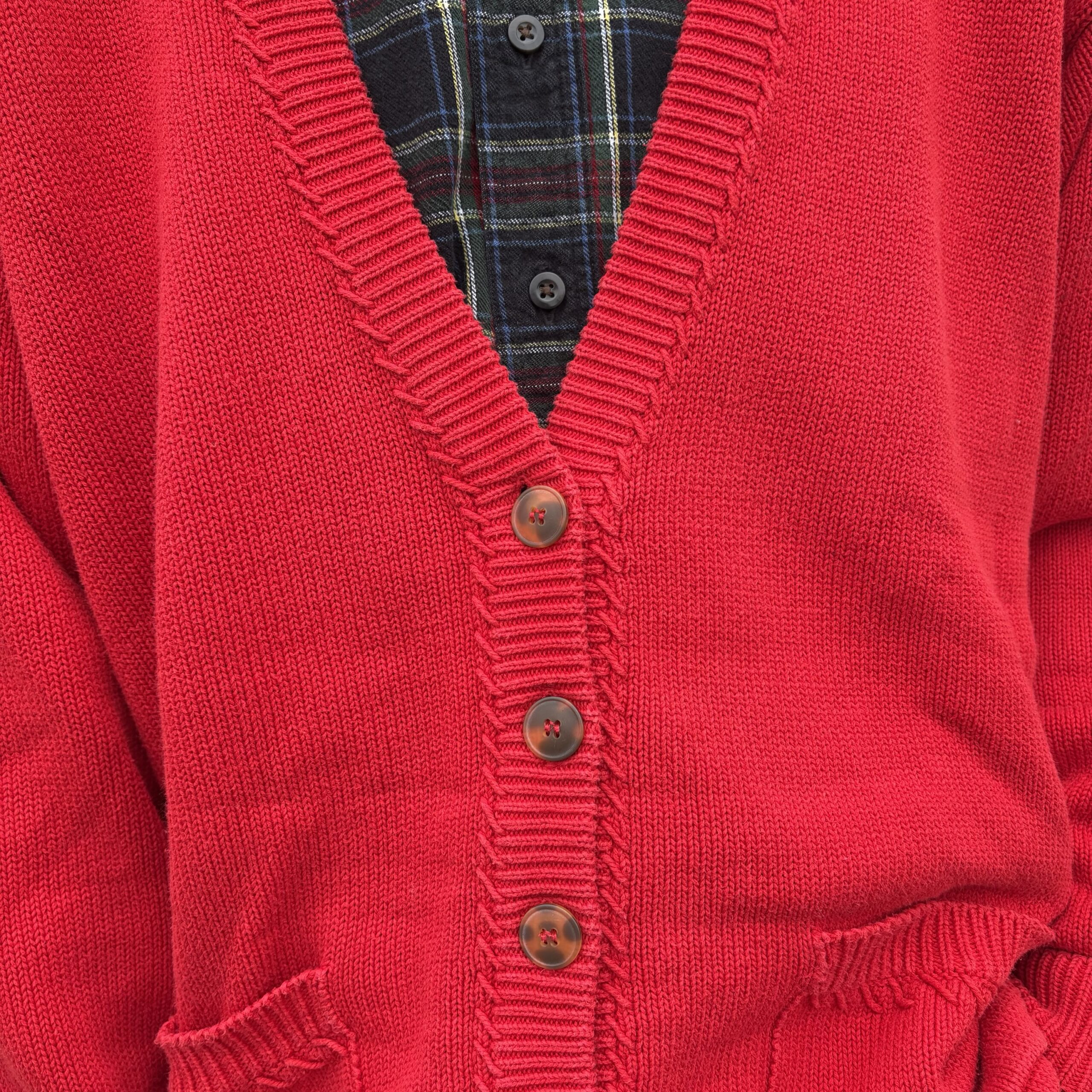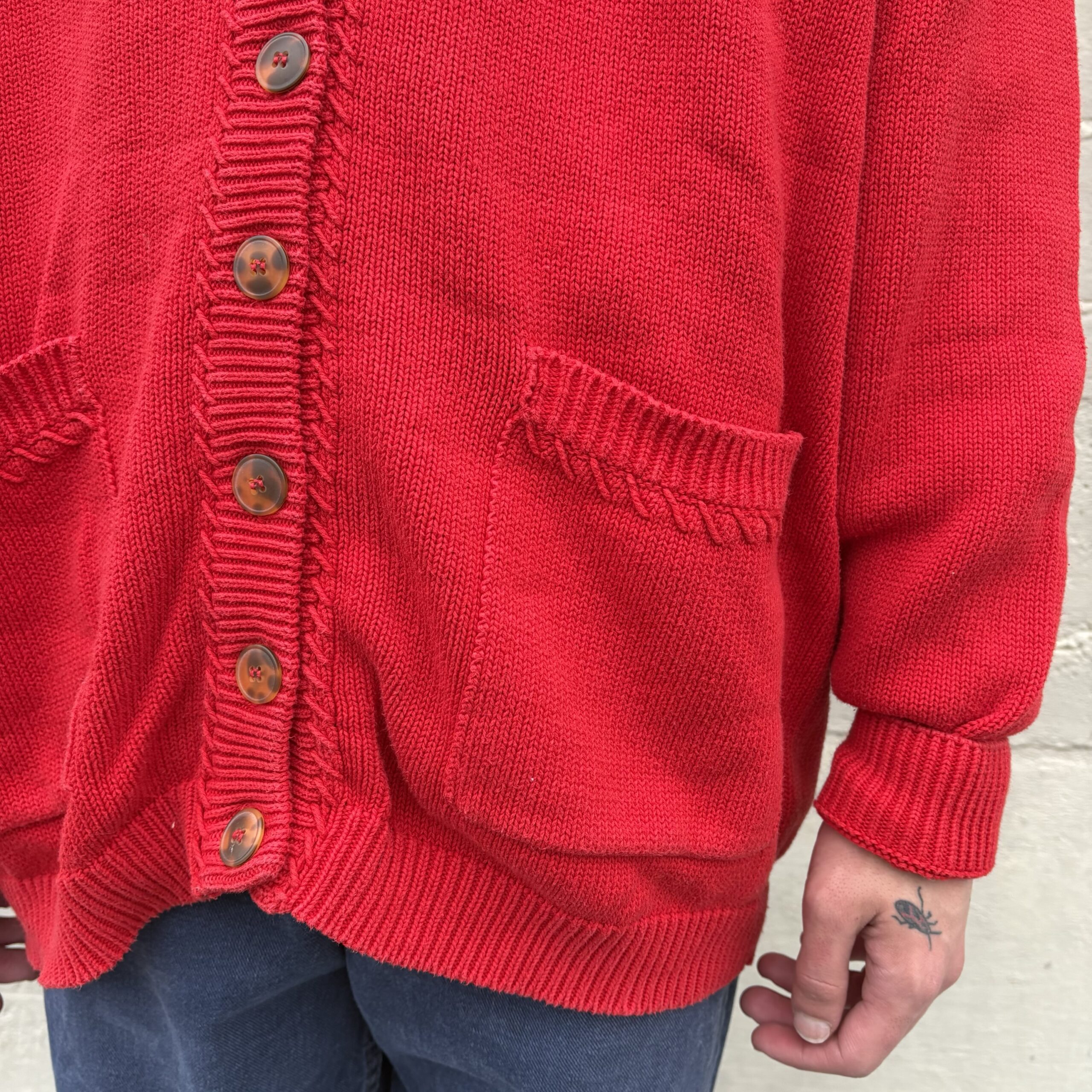 1980s, red color, ribbed collar with monochromatic stitching detail, button closure, front pockets, 100% cotton.