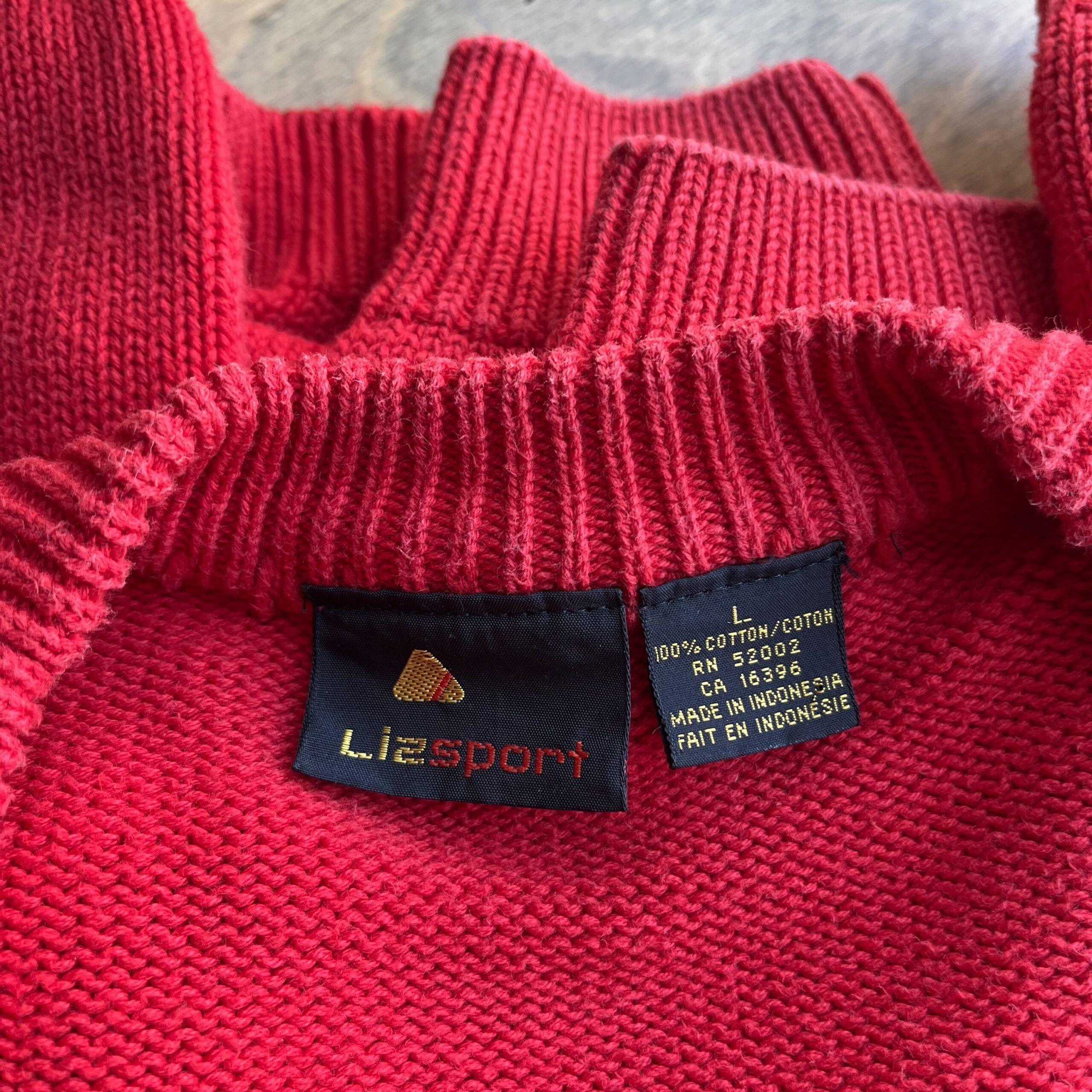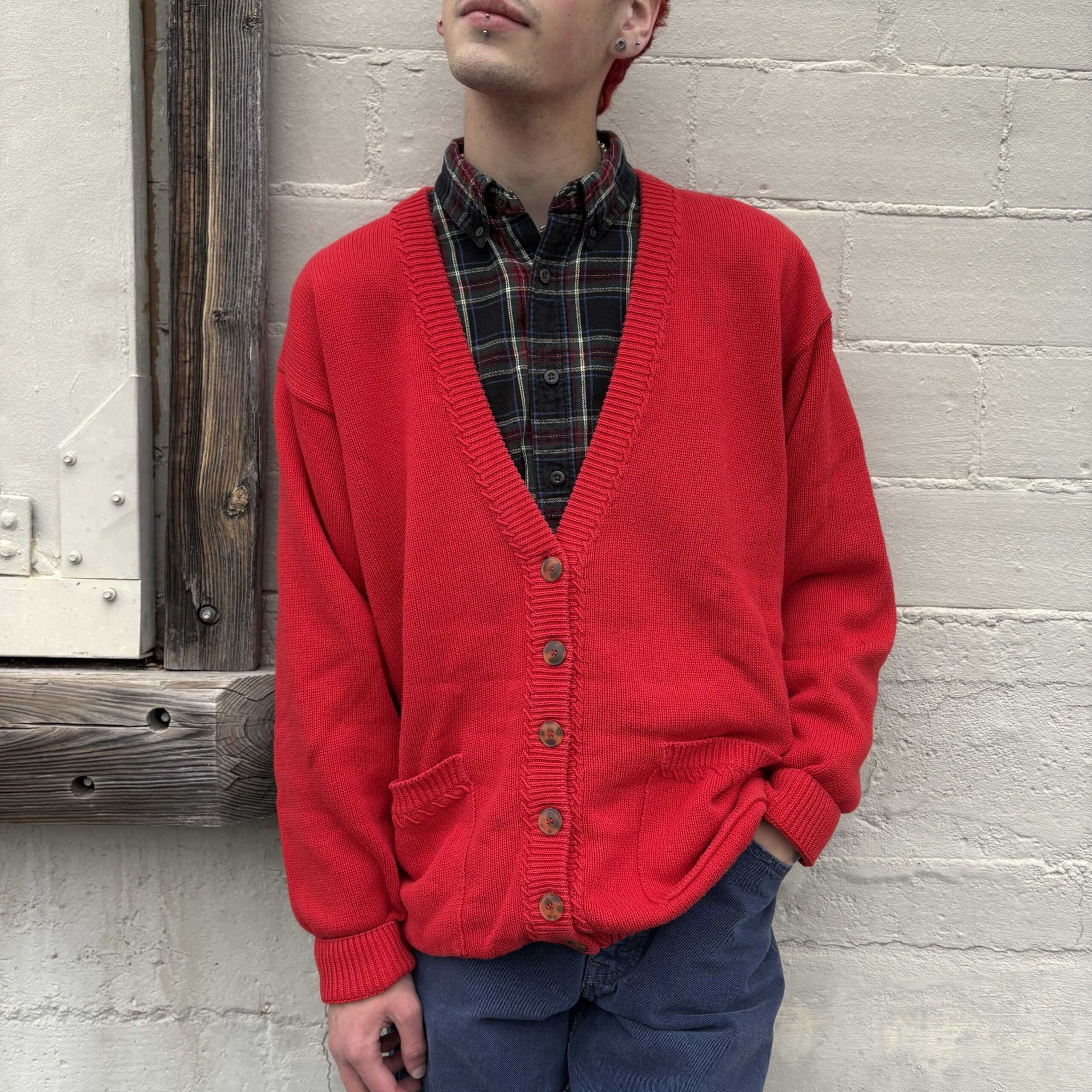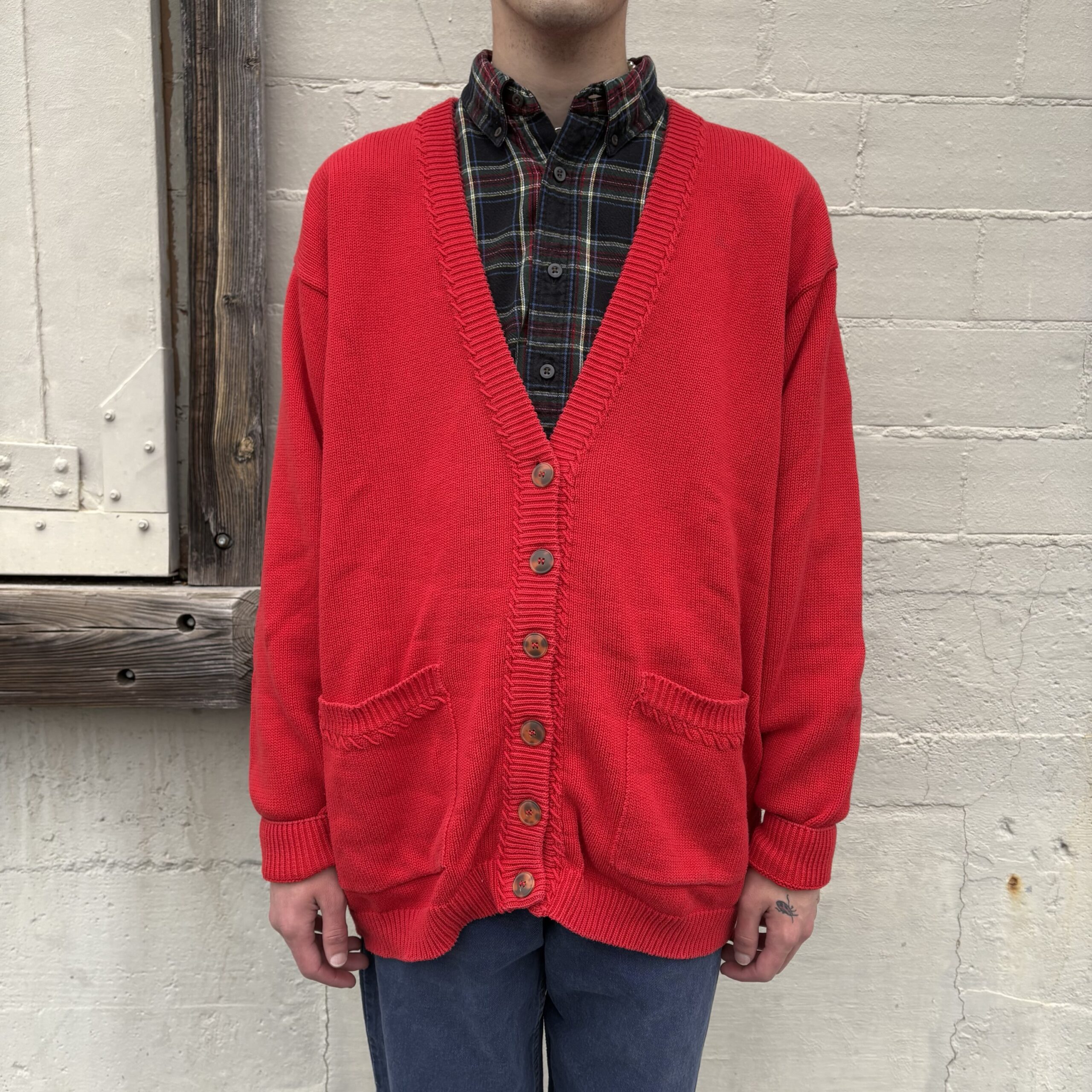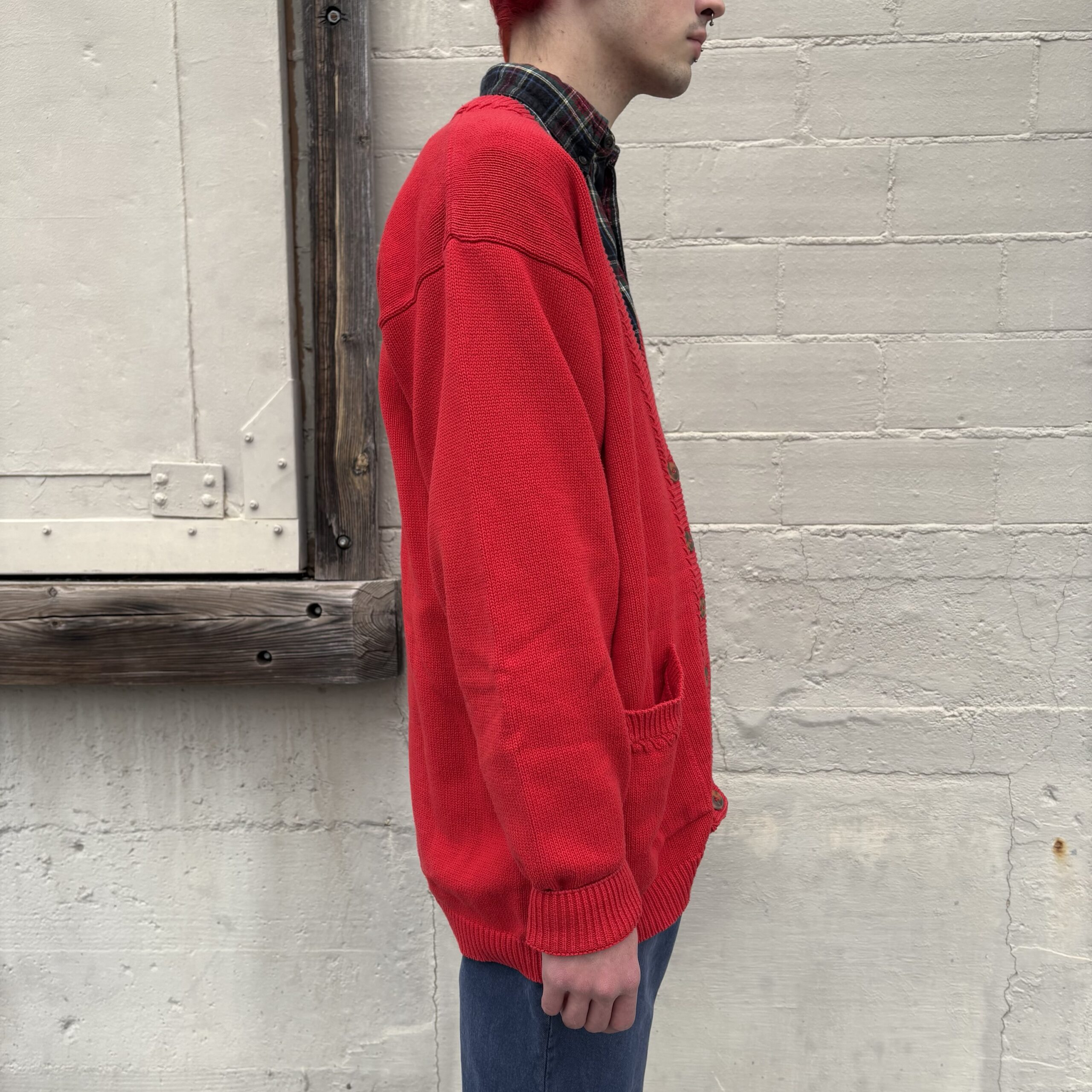 1980s, red color, ribbed collar with monochromatic stitching detail, button closure, front pockets, 100% cotton.