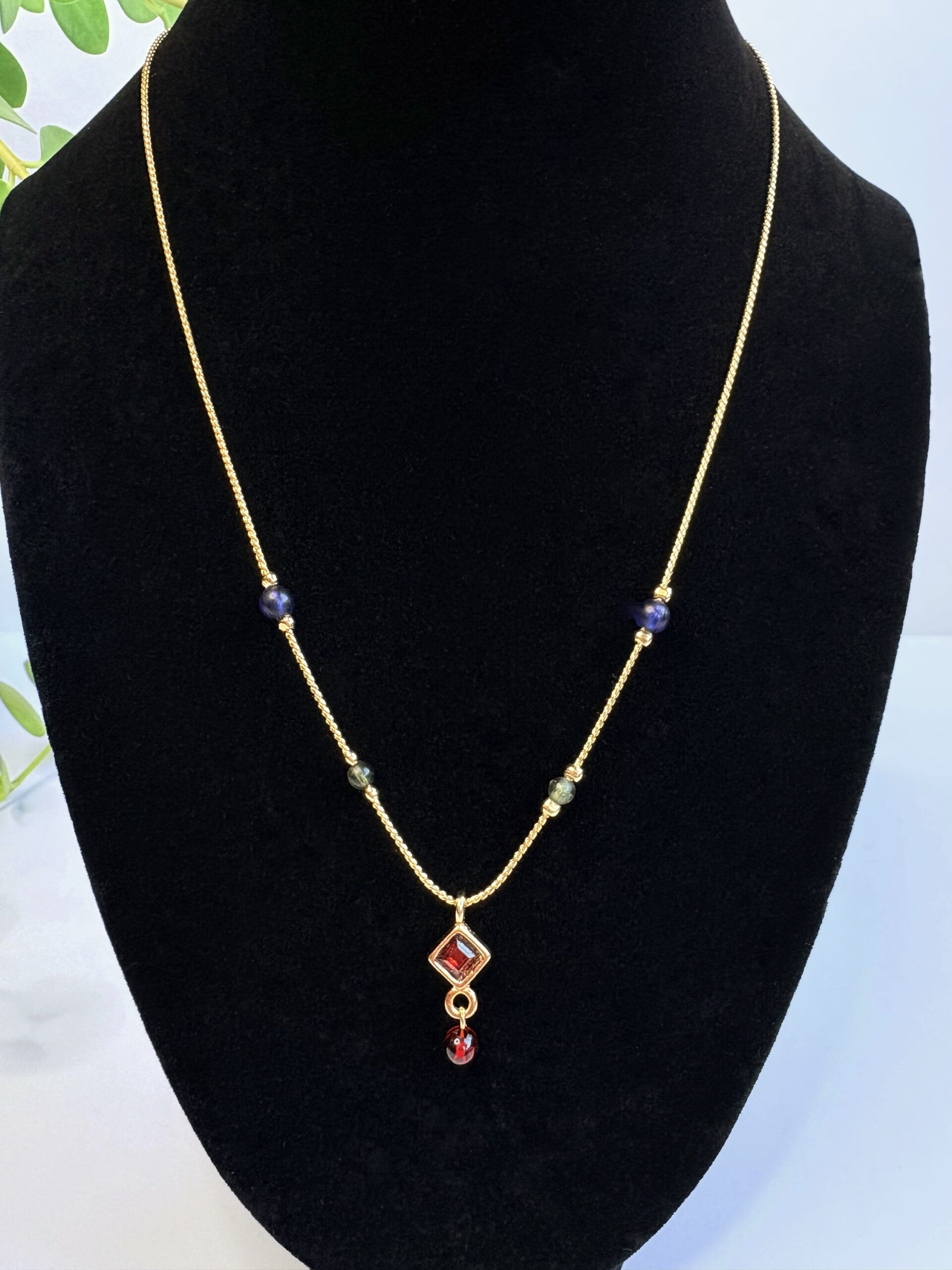 Gold tone necklace w/ blue & olive beads. Burgundy triangle pendant w/ burgundy bead