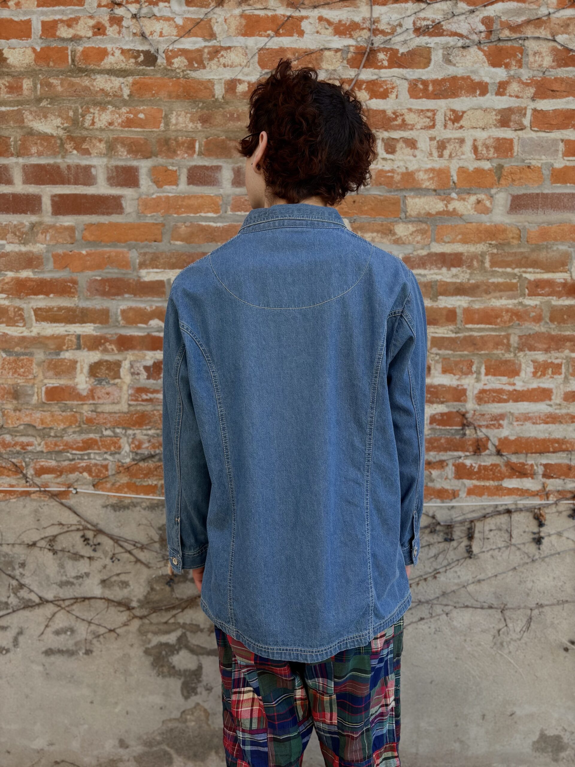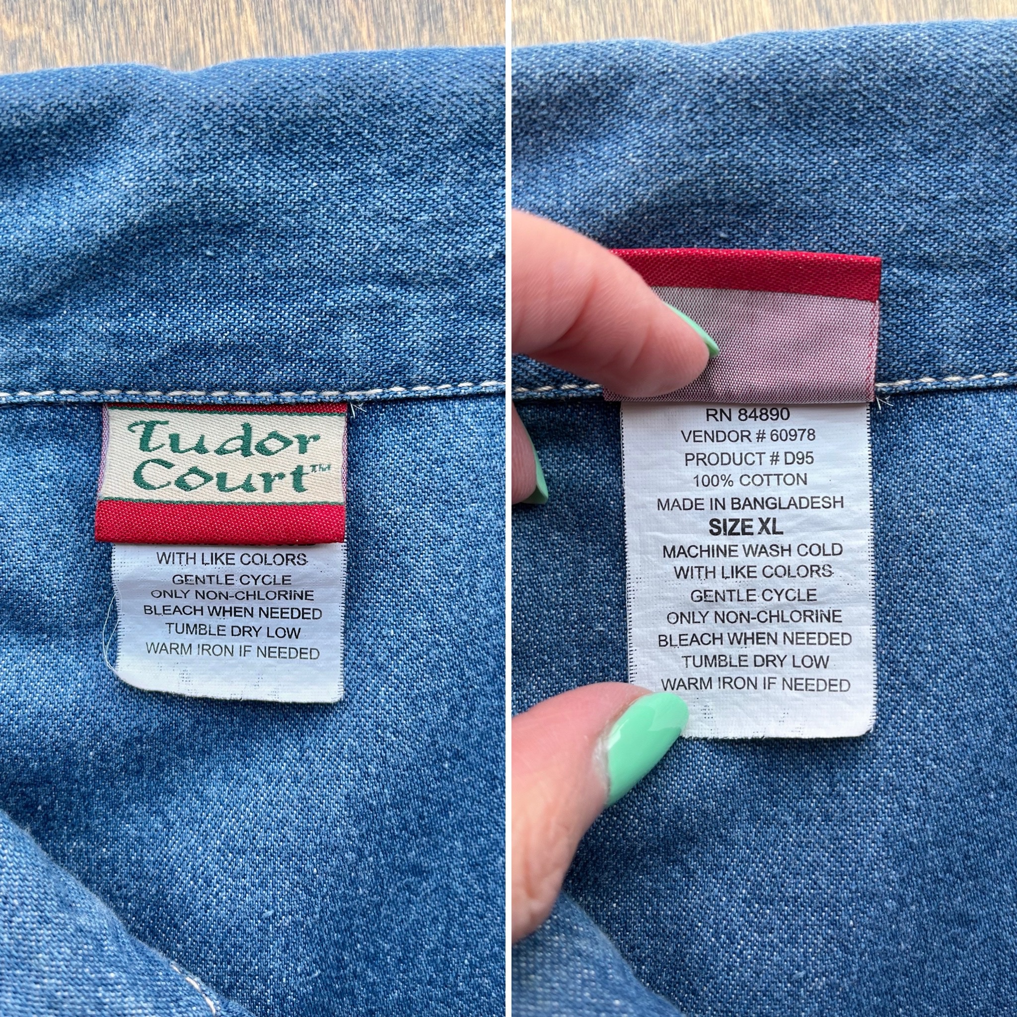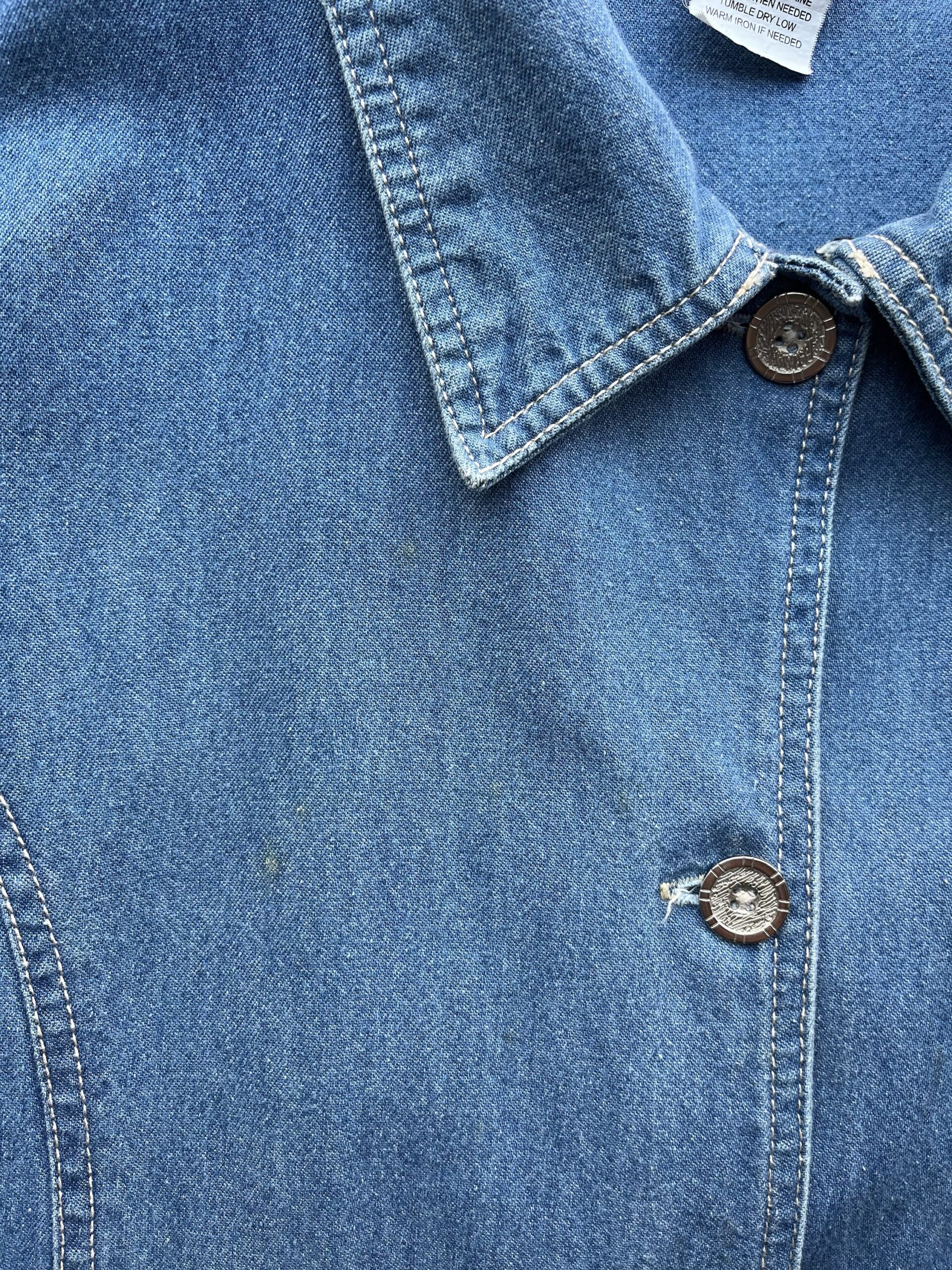 1990s, blue medium wash, collared, long sleeves, buttoned pockets at waist, front silver button closures, 100% cotton.
