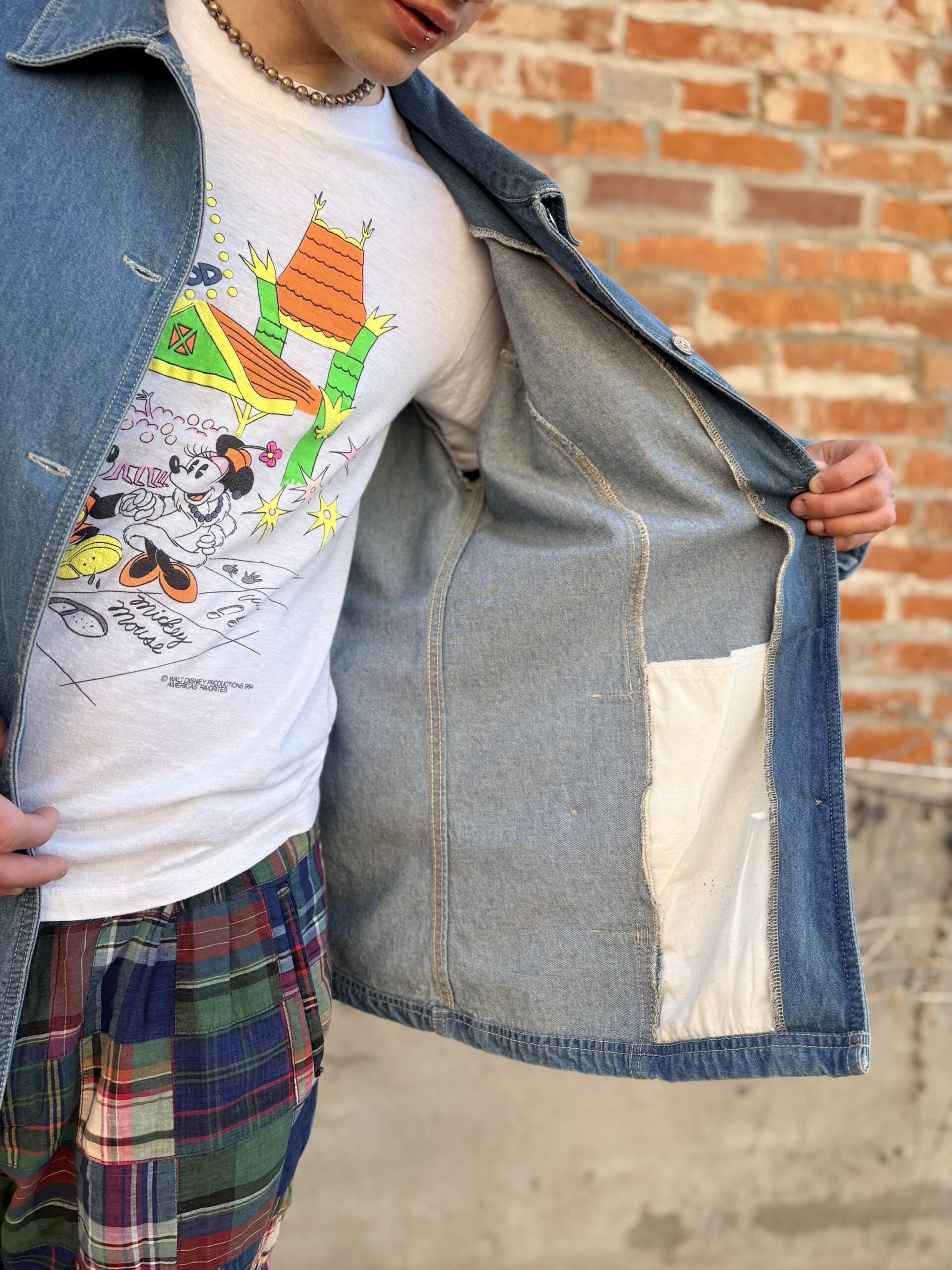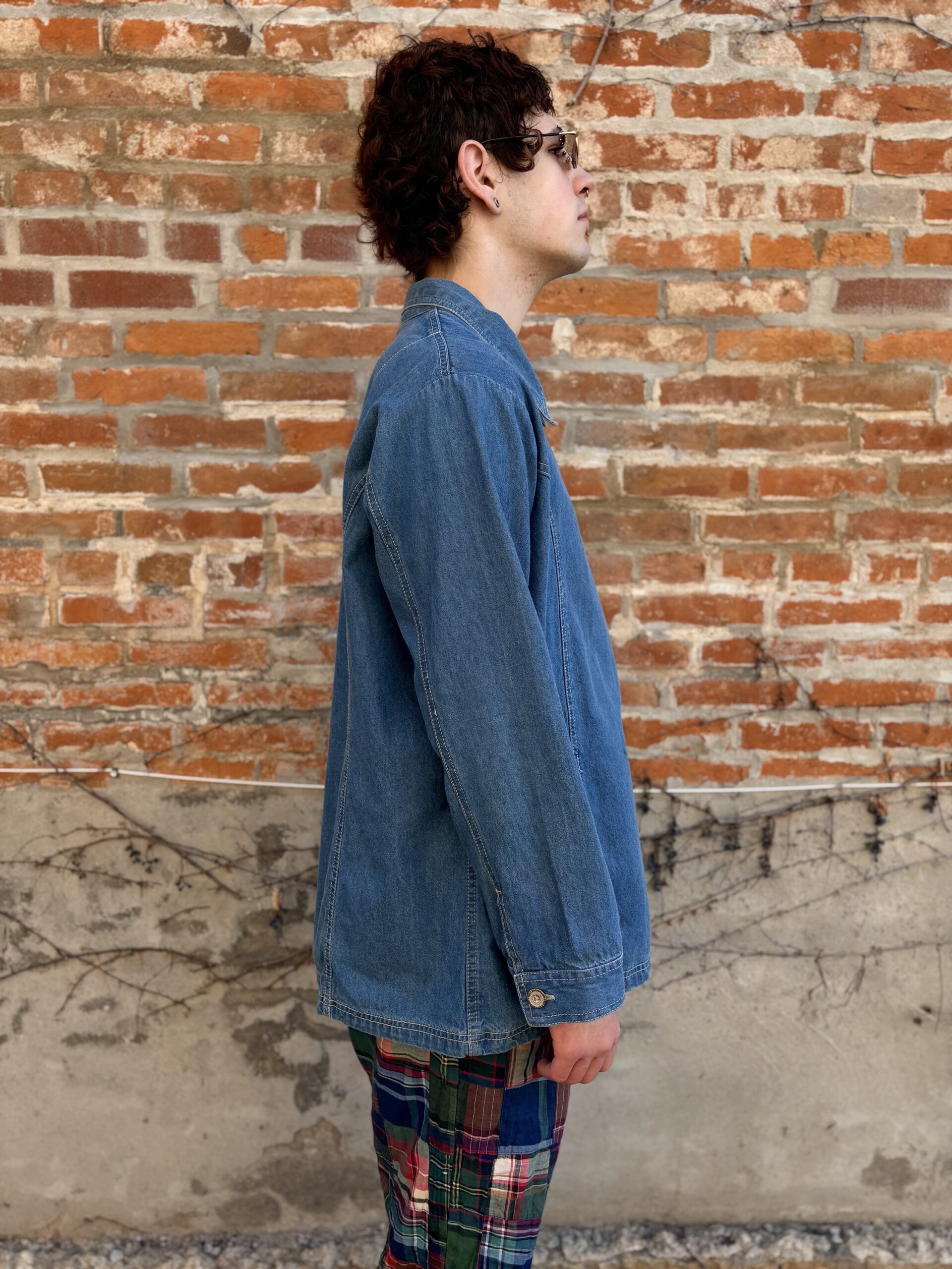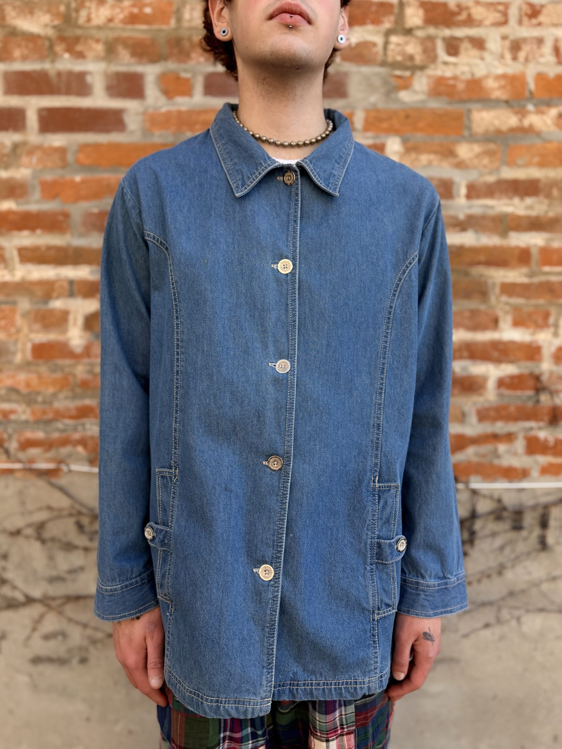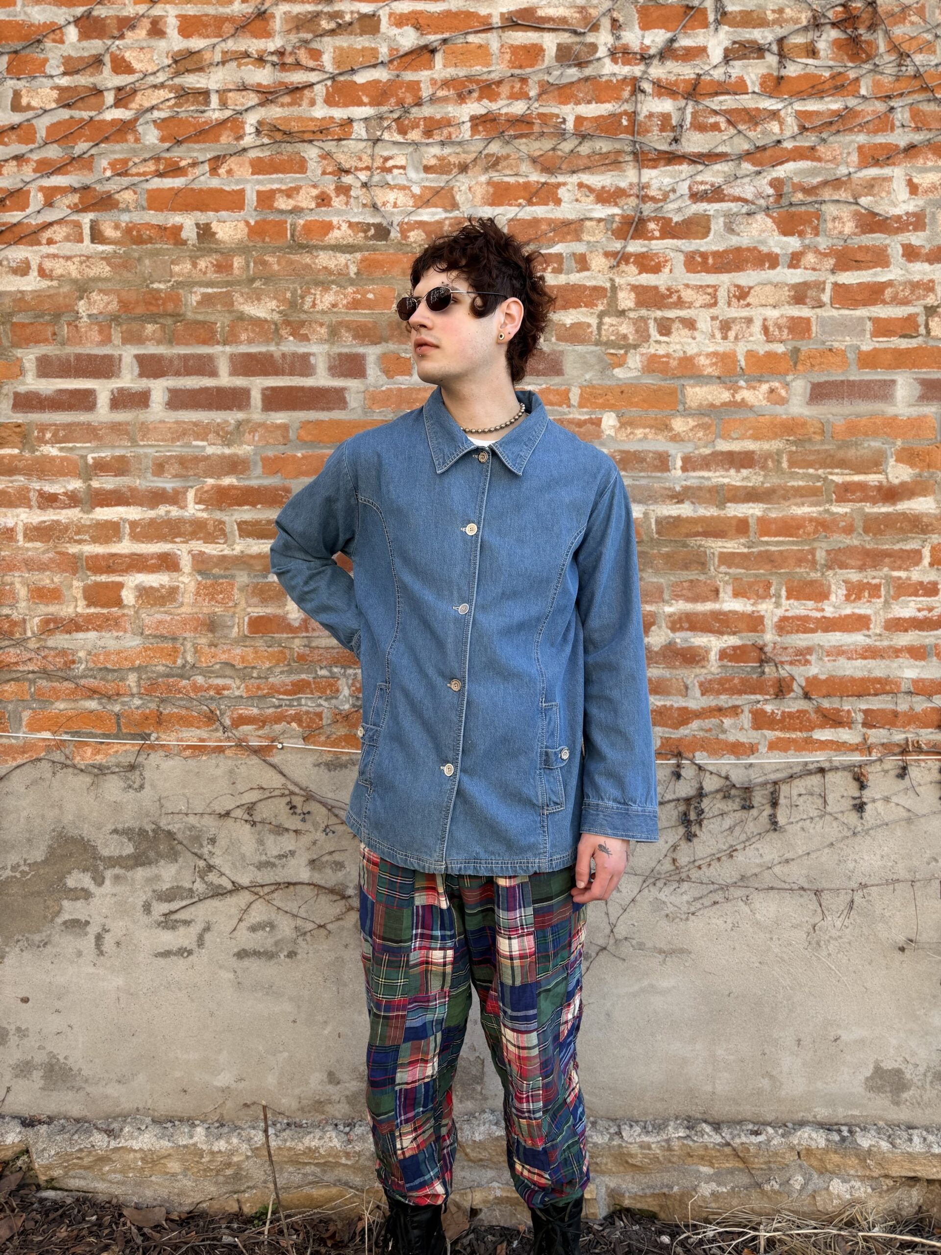 1990s, blue medium wash, collared, long sleeves, buttoned pockets at waist, front silver button closures, 100% cotton.