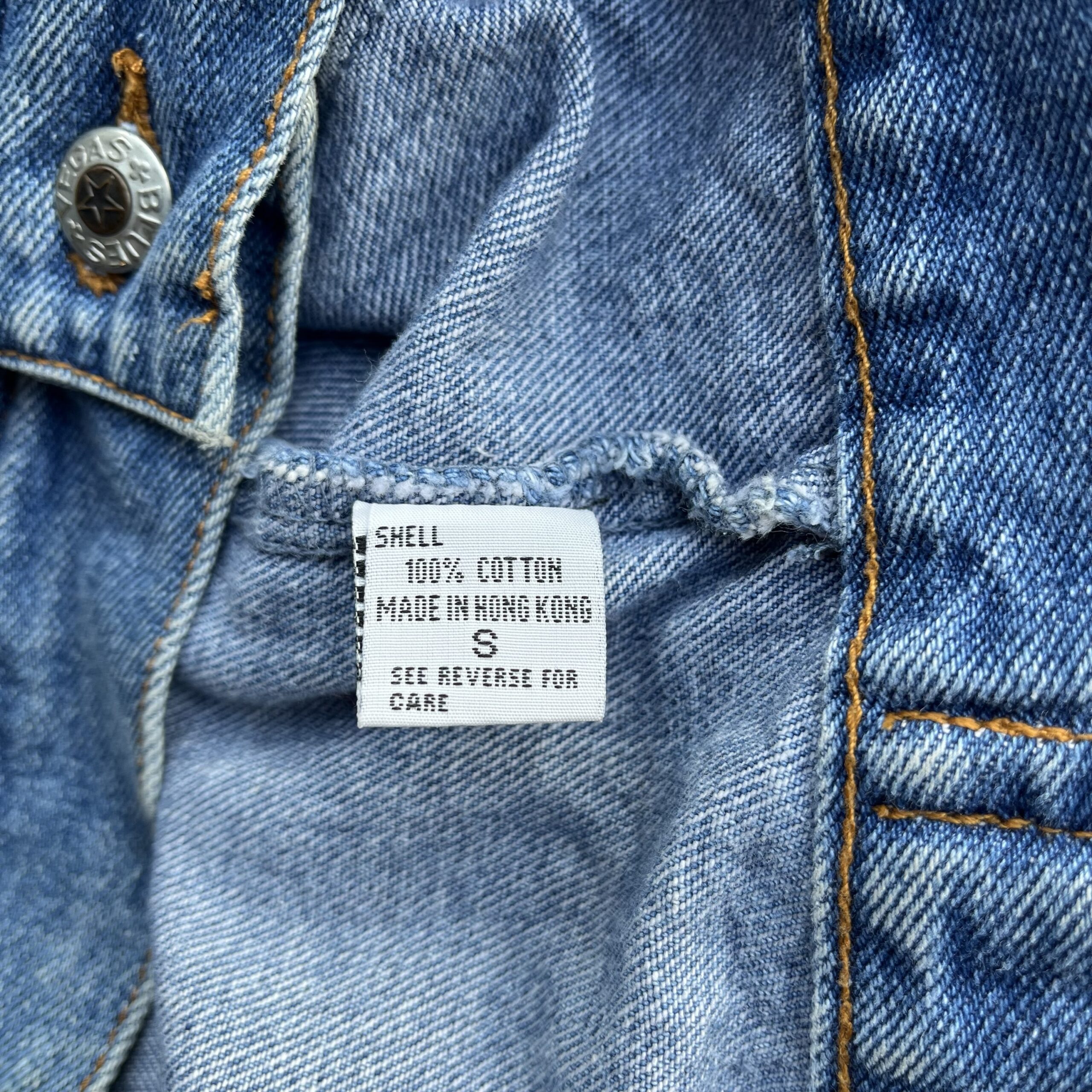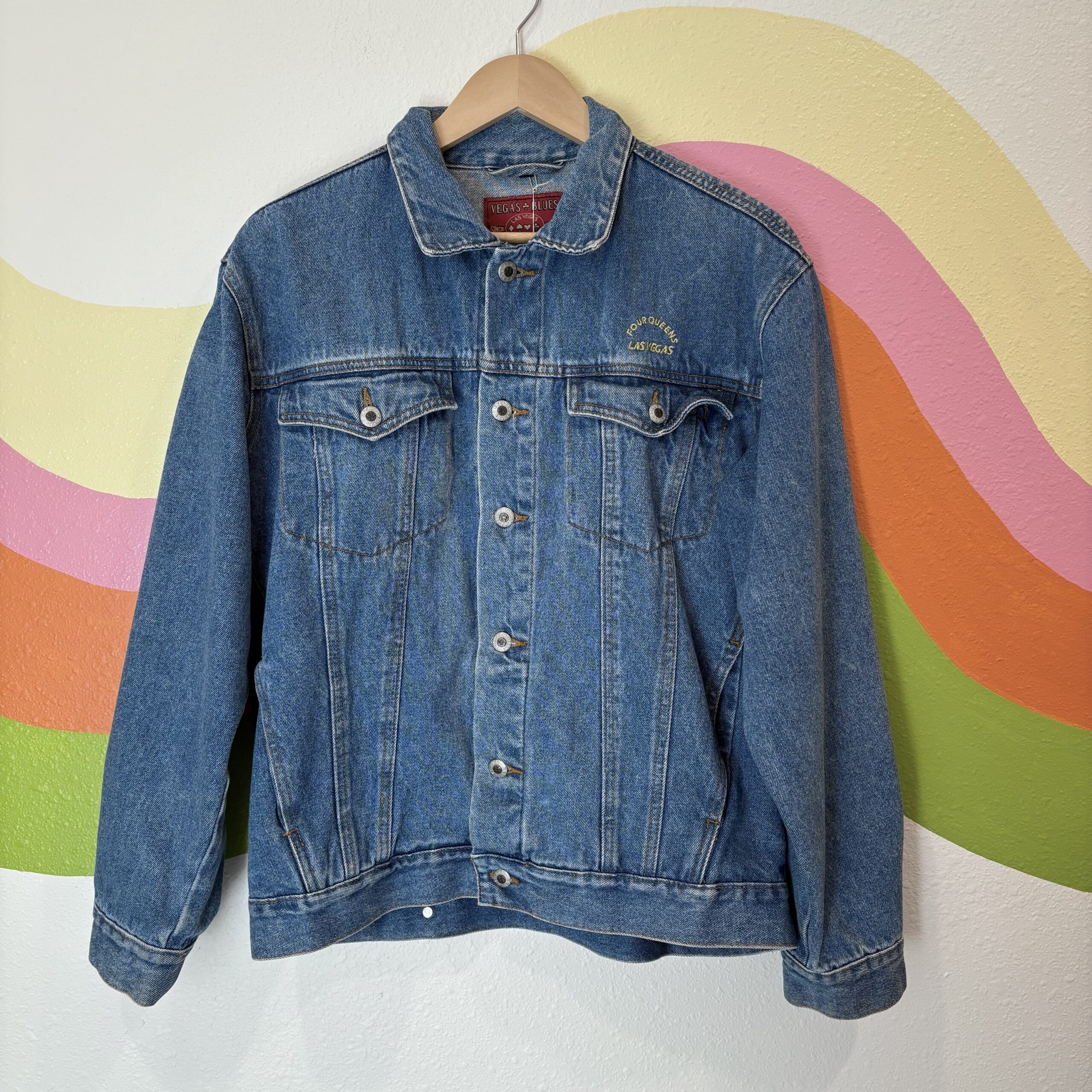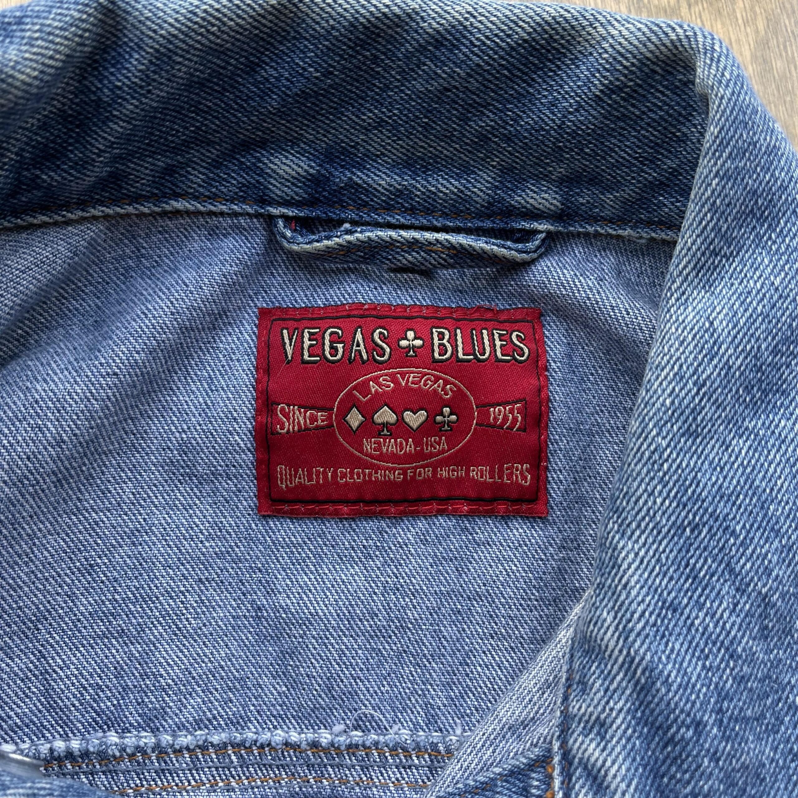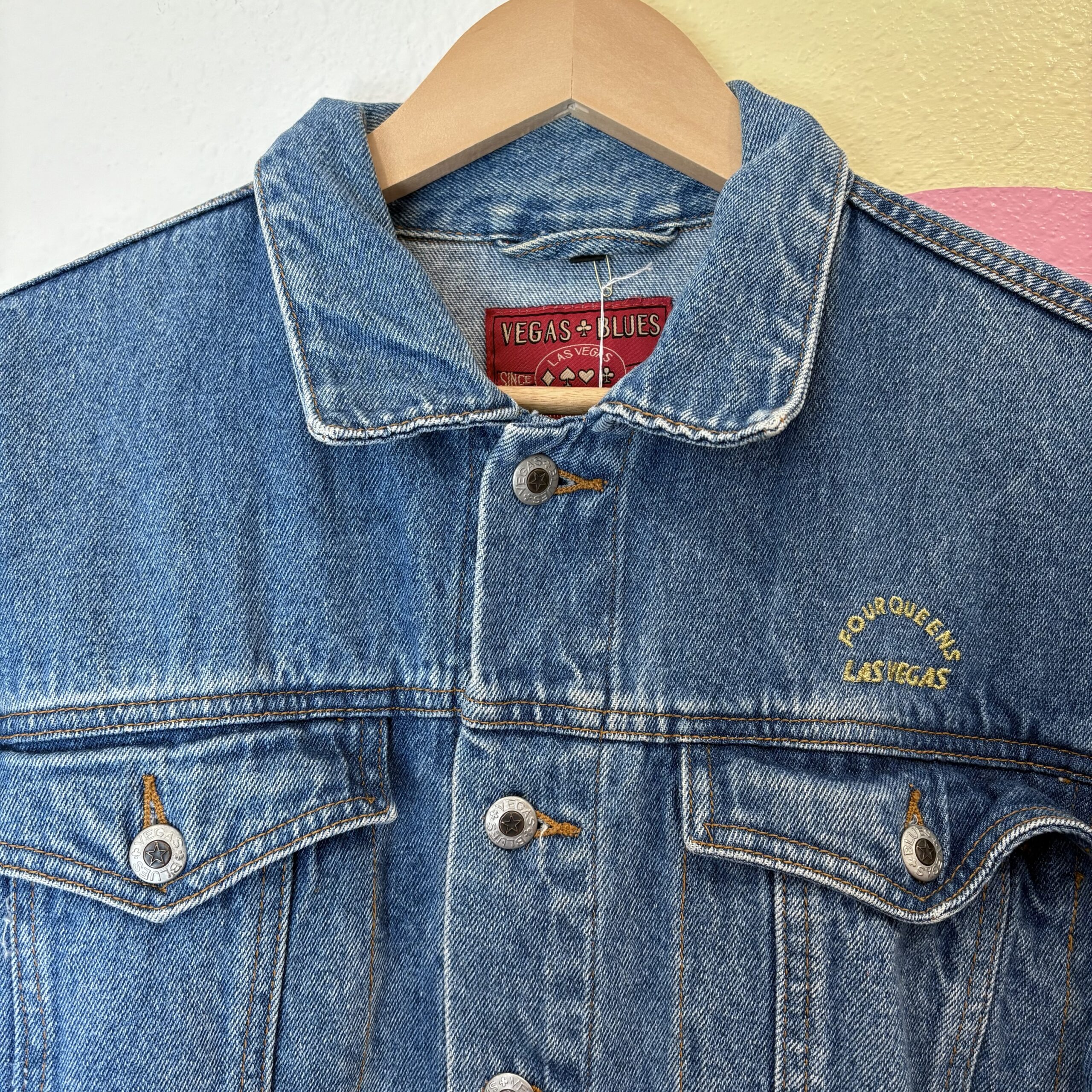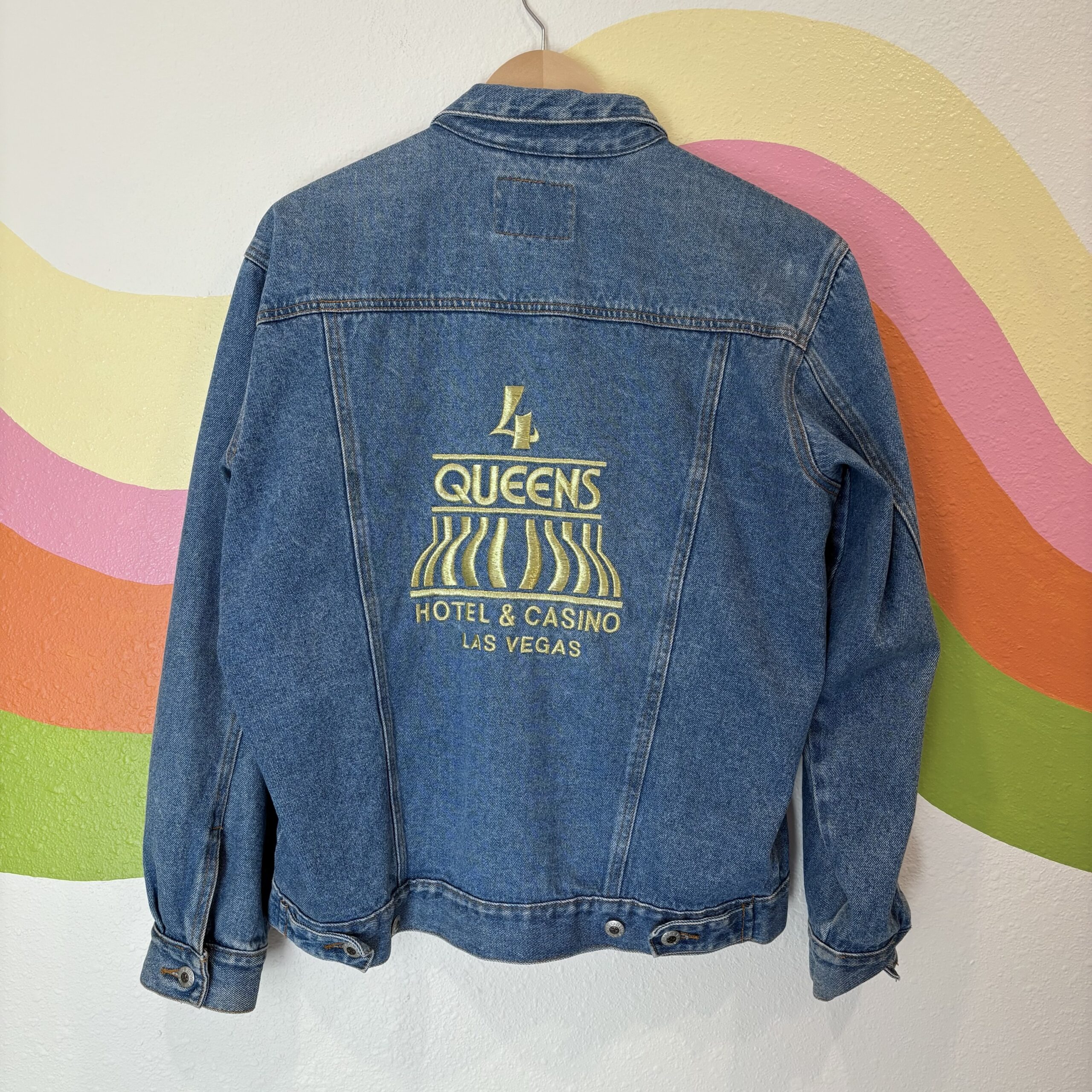 1990s, blue medium wash, collared, chest pockets, front slit pockets, two interior pockets, metallic gold embroidery on left chest and back, 100% cotton denim.