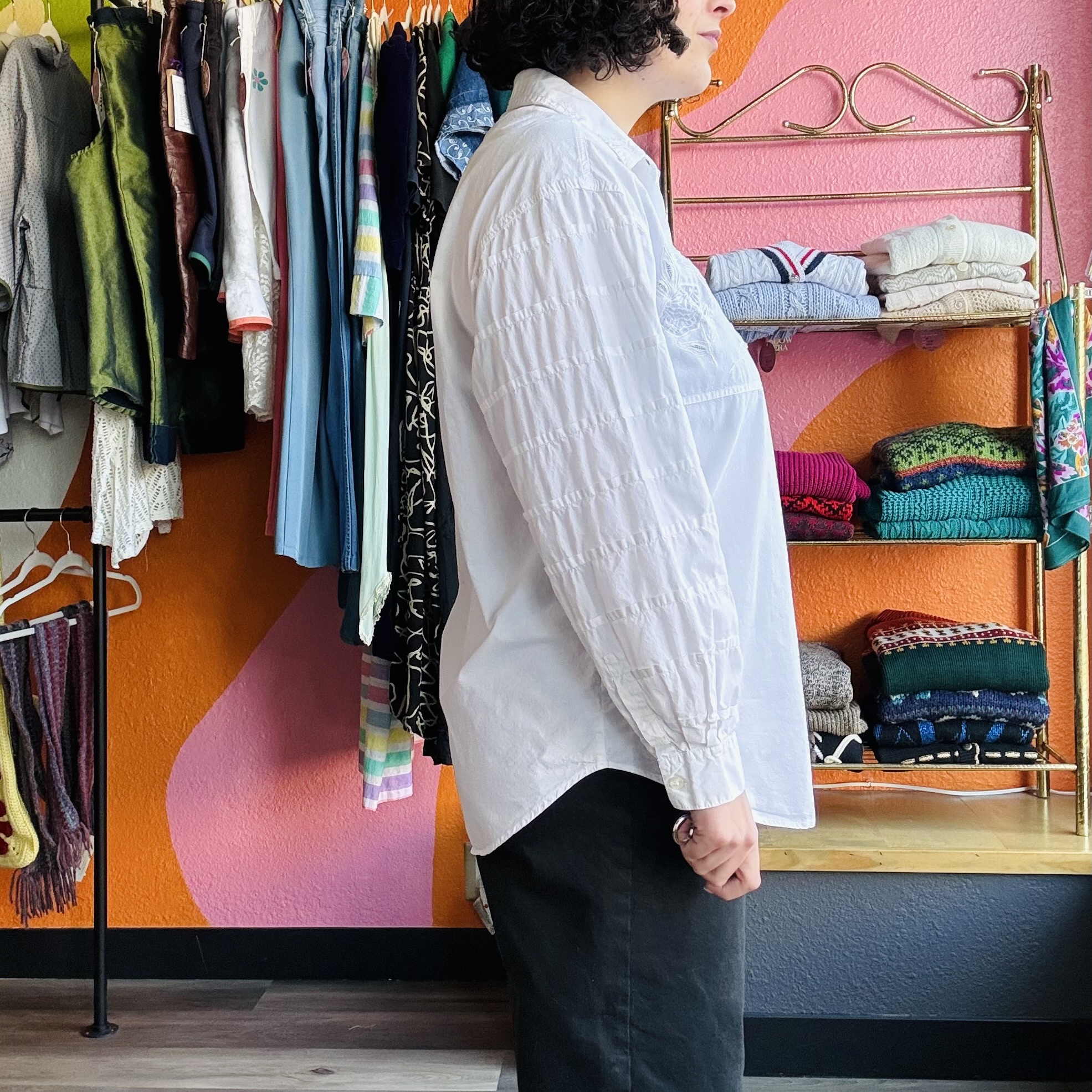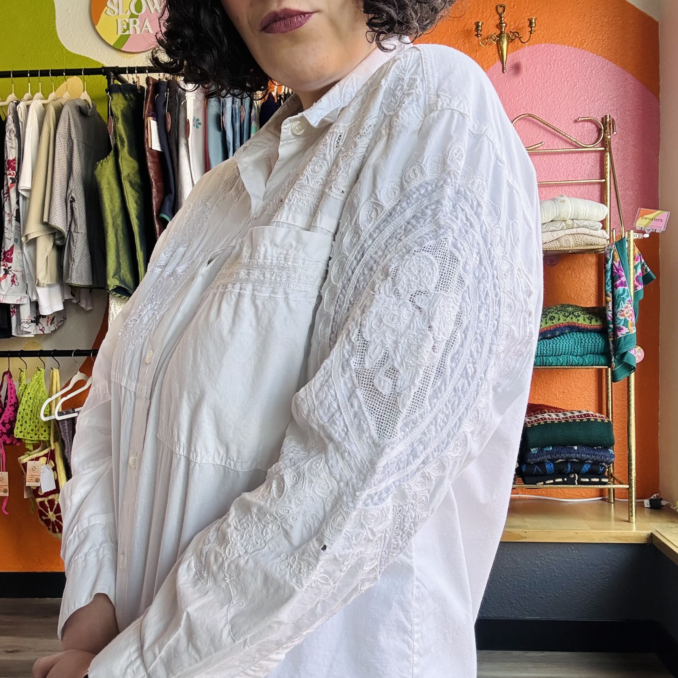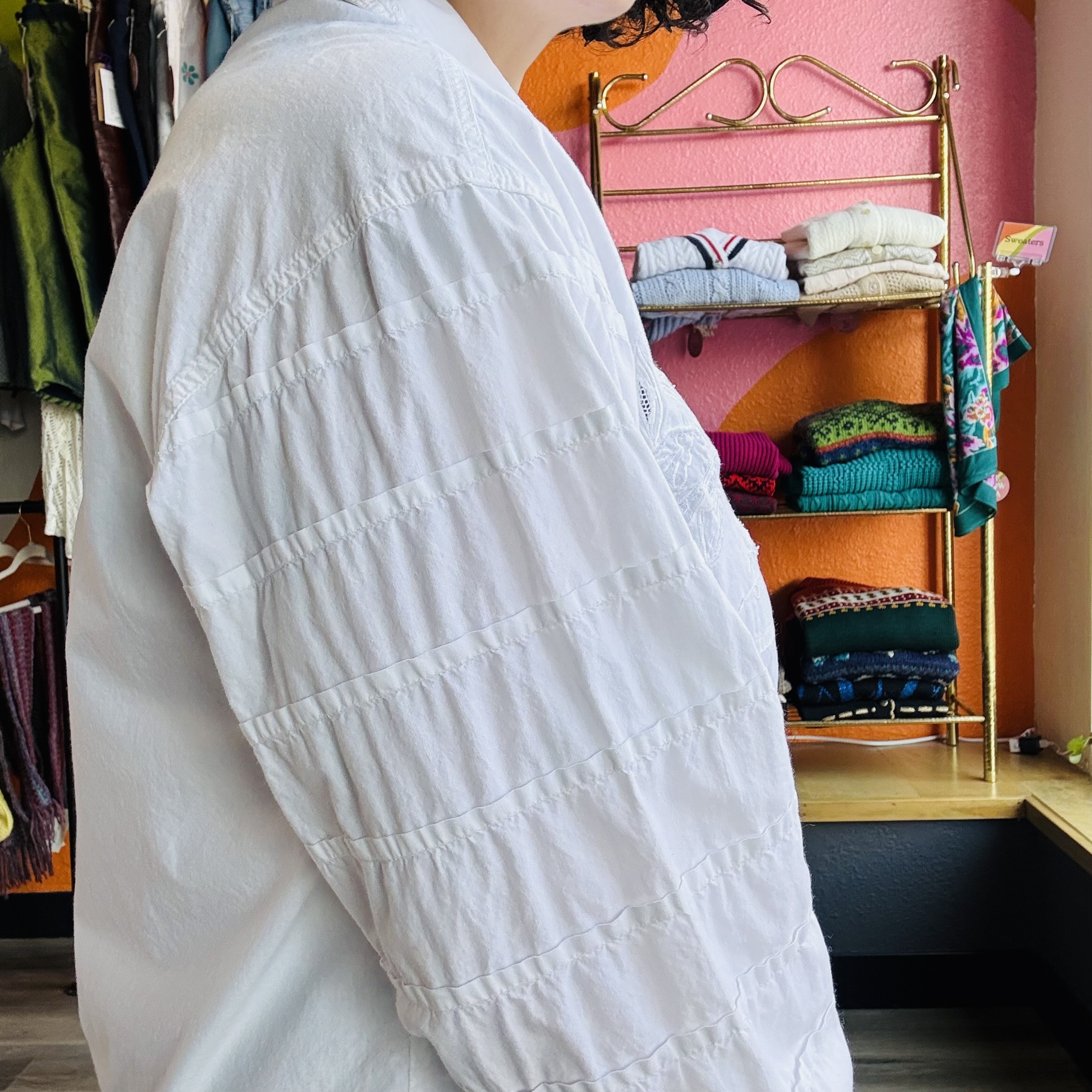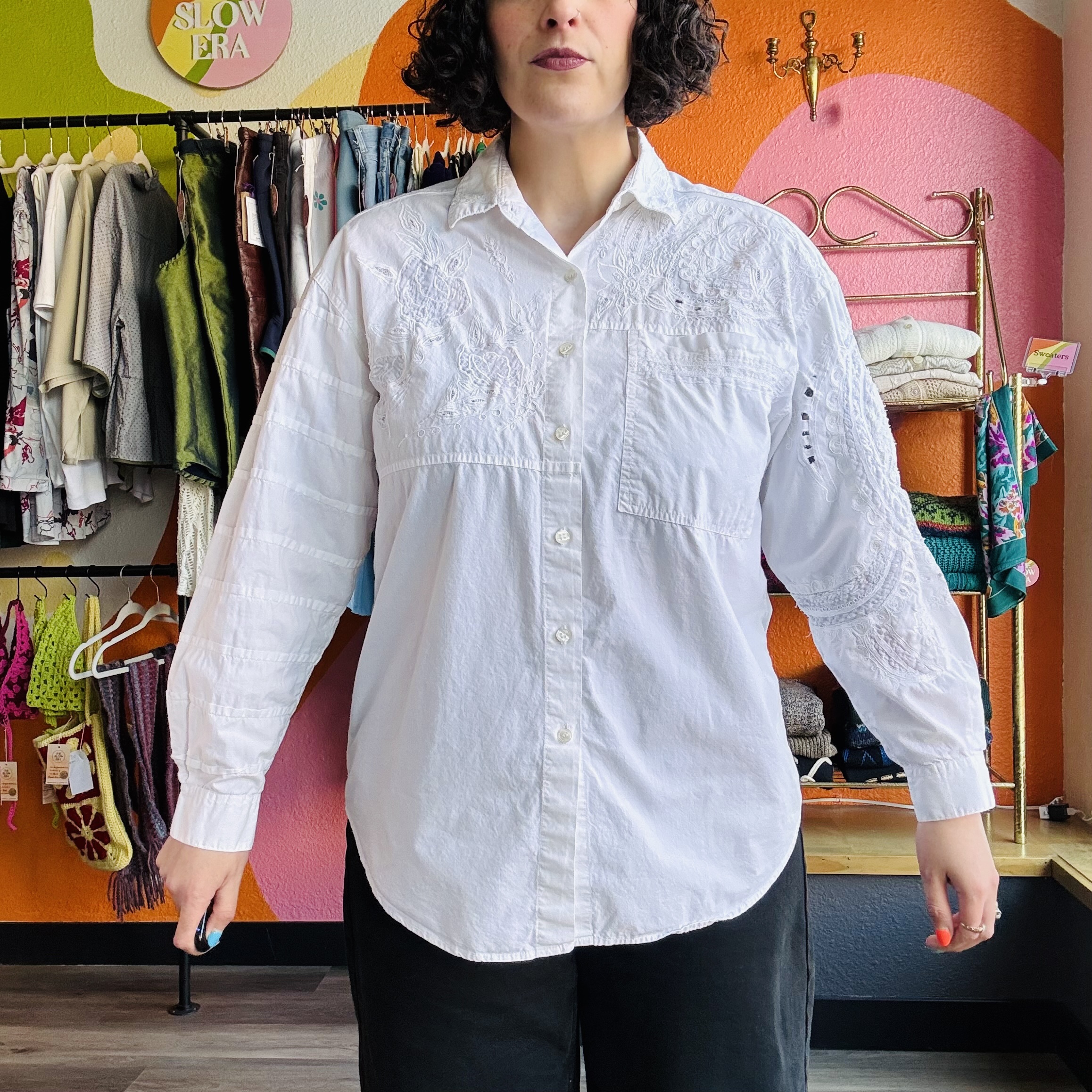 Circa 1990s, white color, collared, left chest pocket, button front, monochromatic floral embroidery on front and left sleeve, pintucks down the right sleeve, 100% cotton.