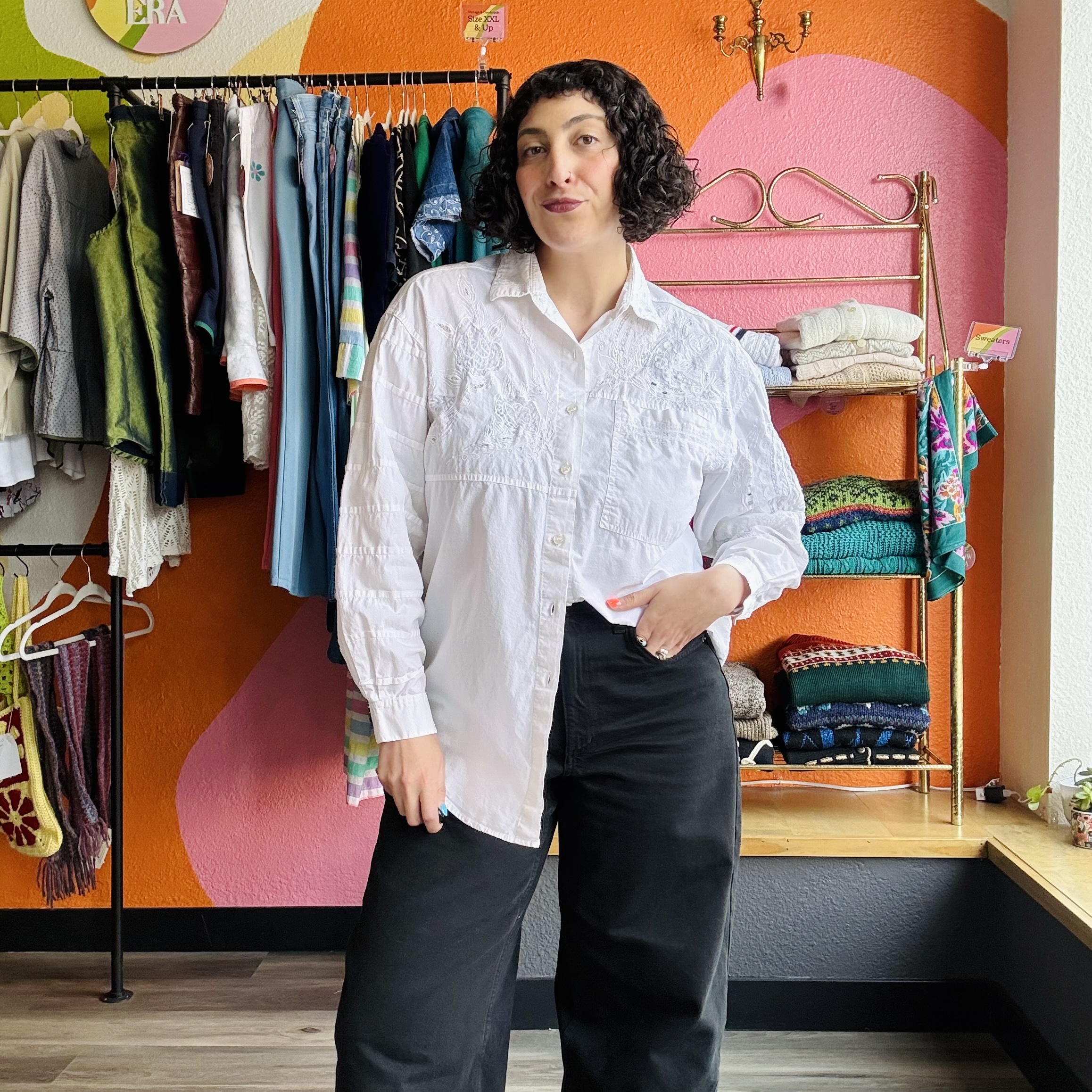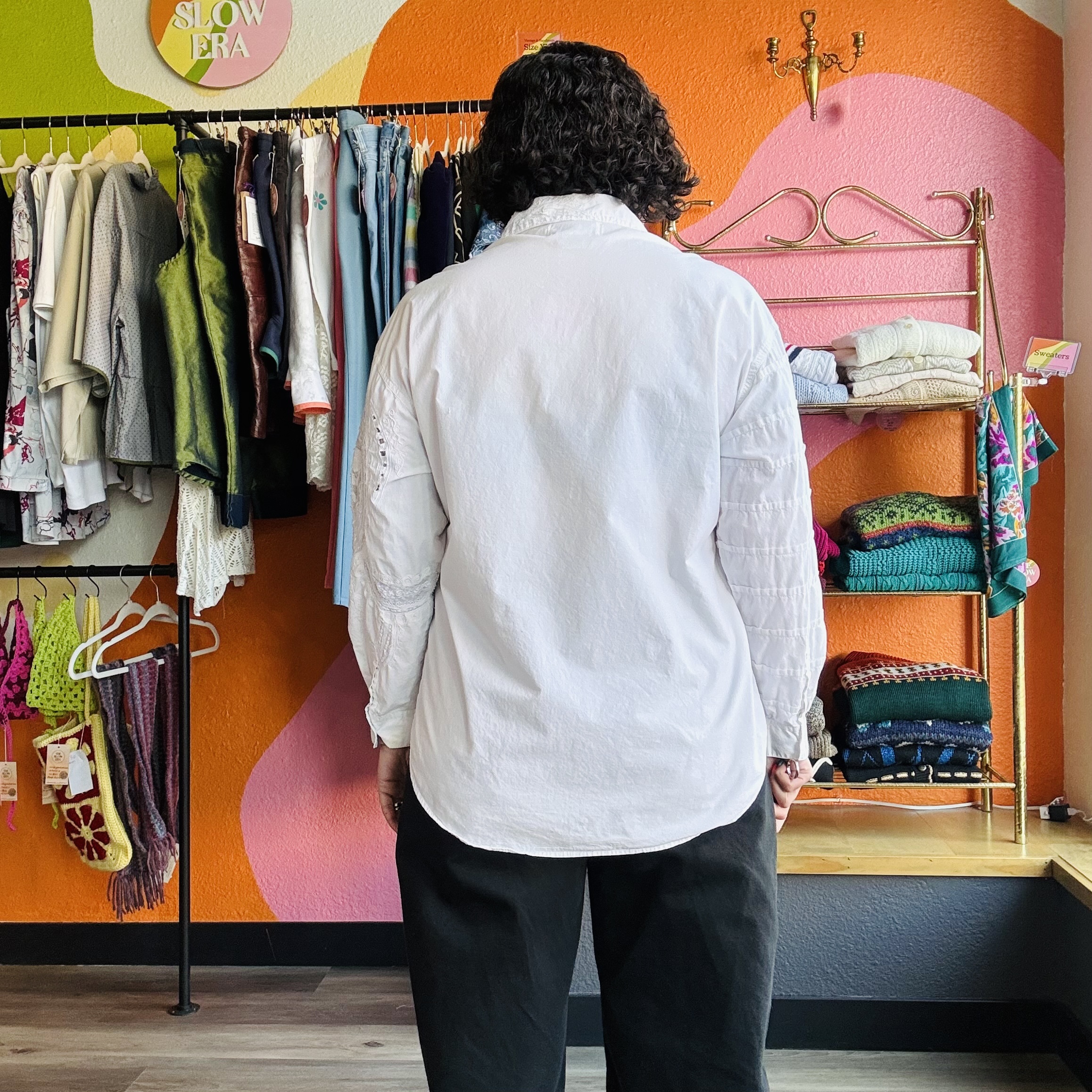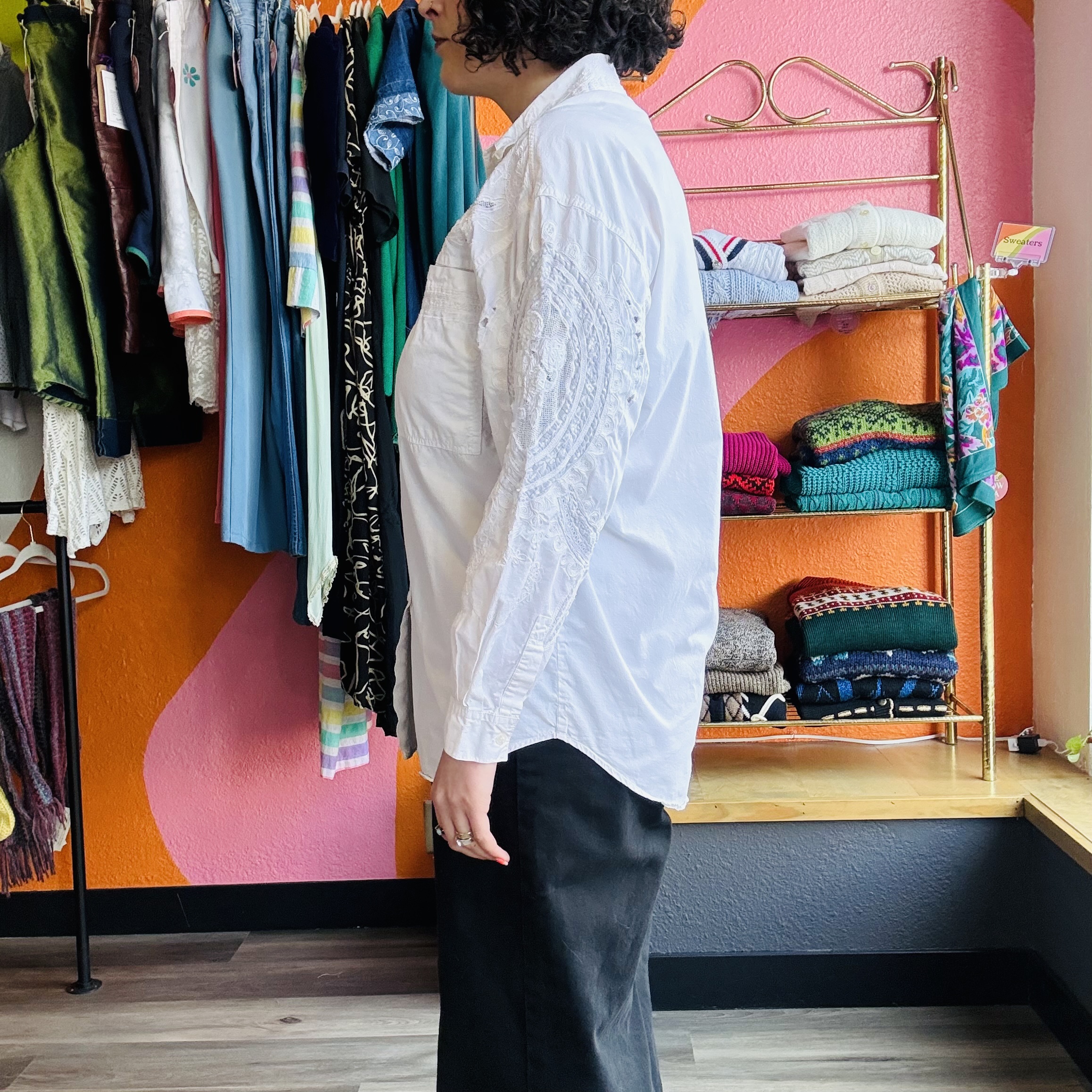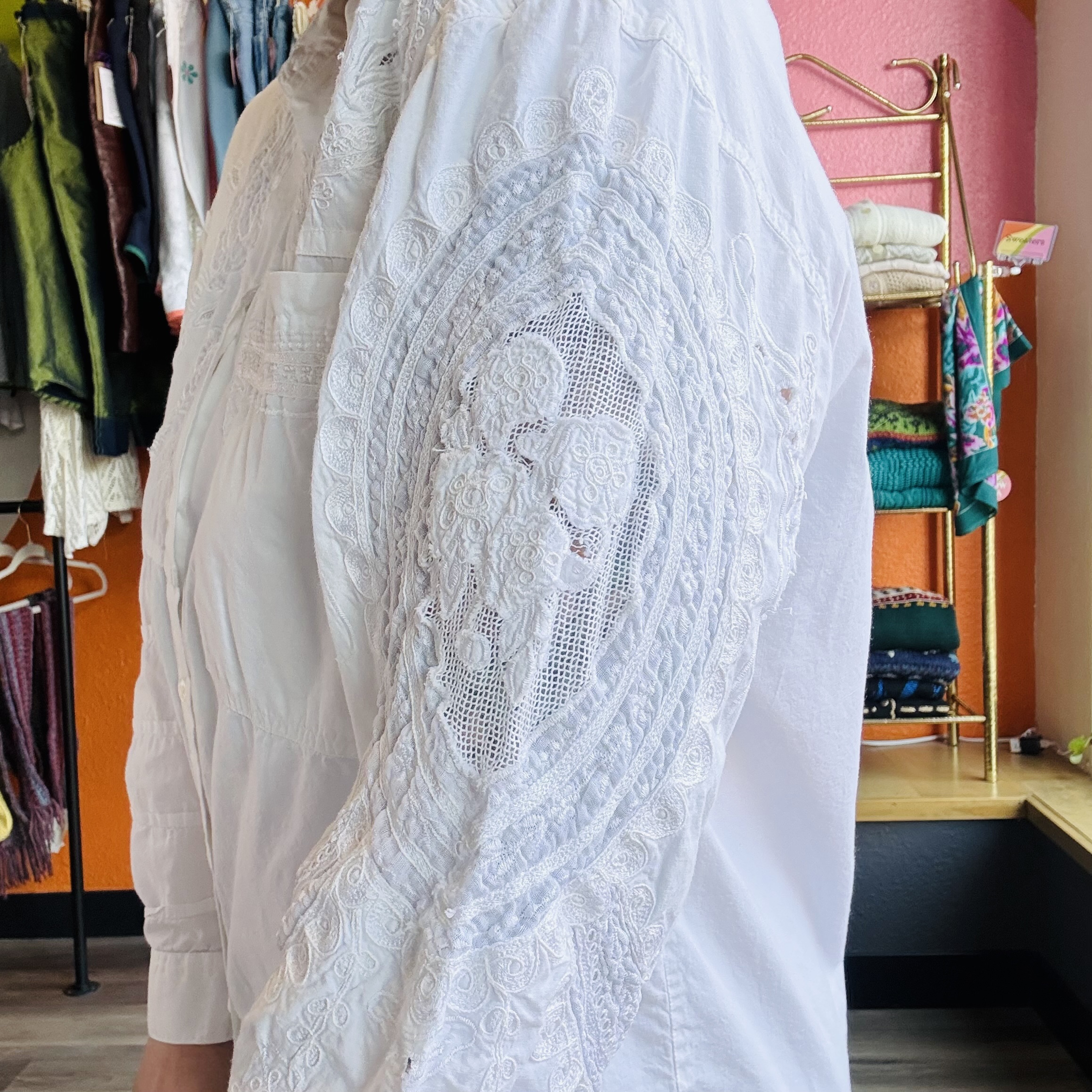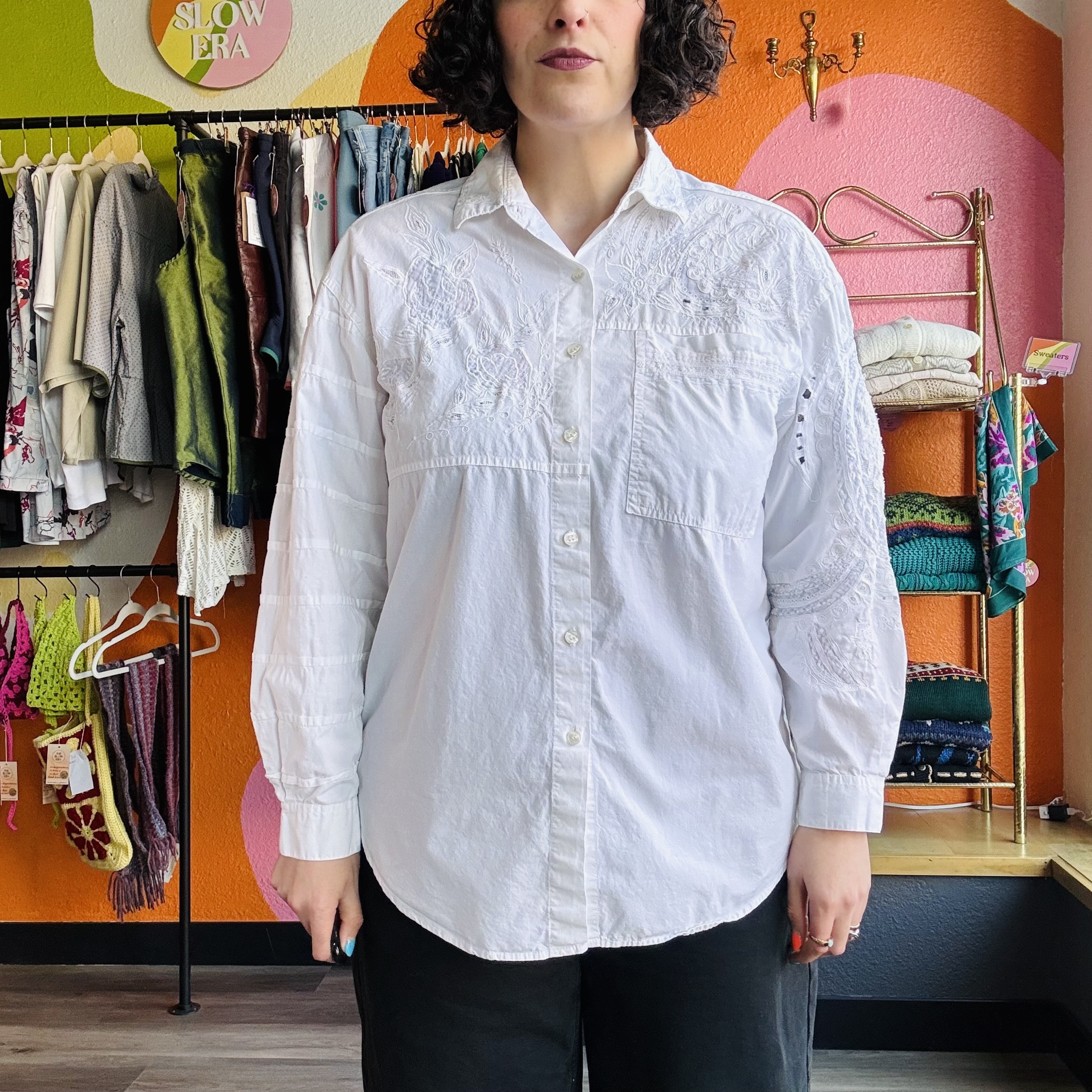 Circa 1990s, white color, collared, left chest pocket, button front, monochromatic floral embroidery on front and left sleeve, pintucks down the right sleeve, 100% cotton.