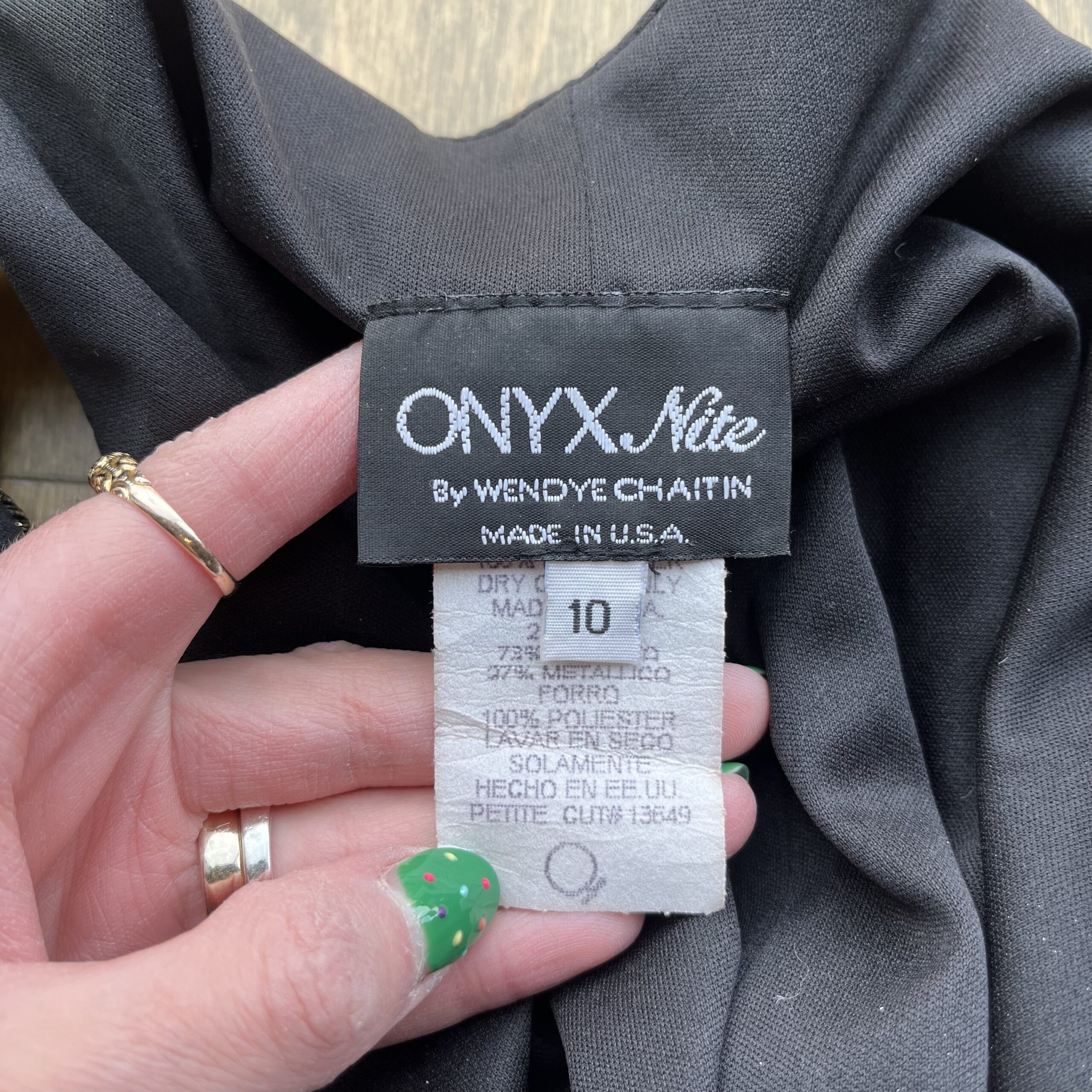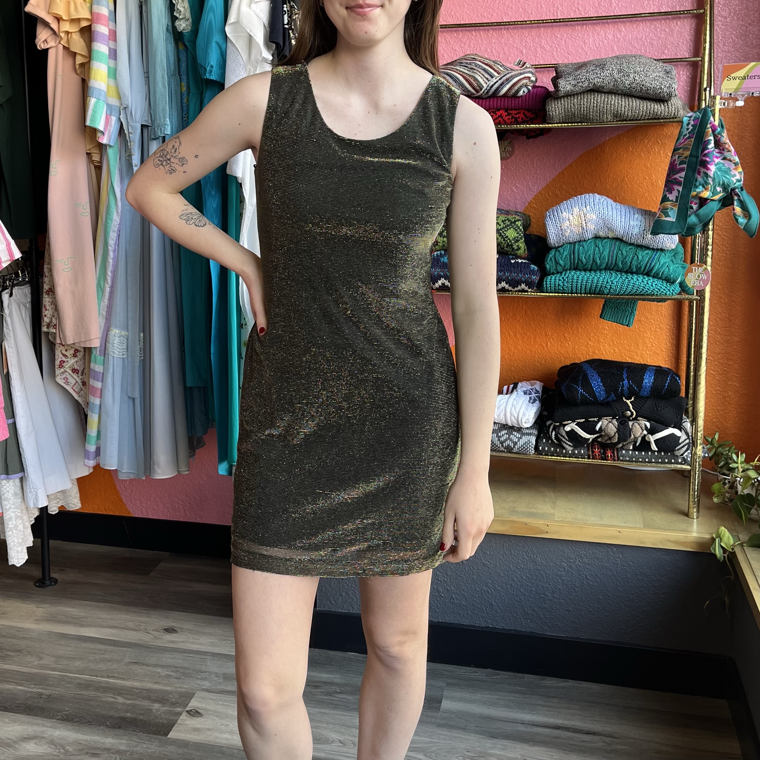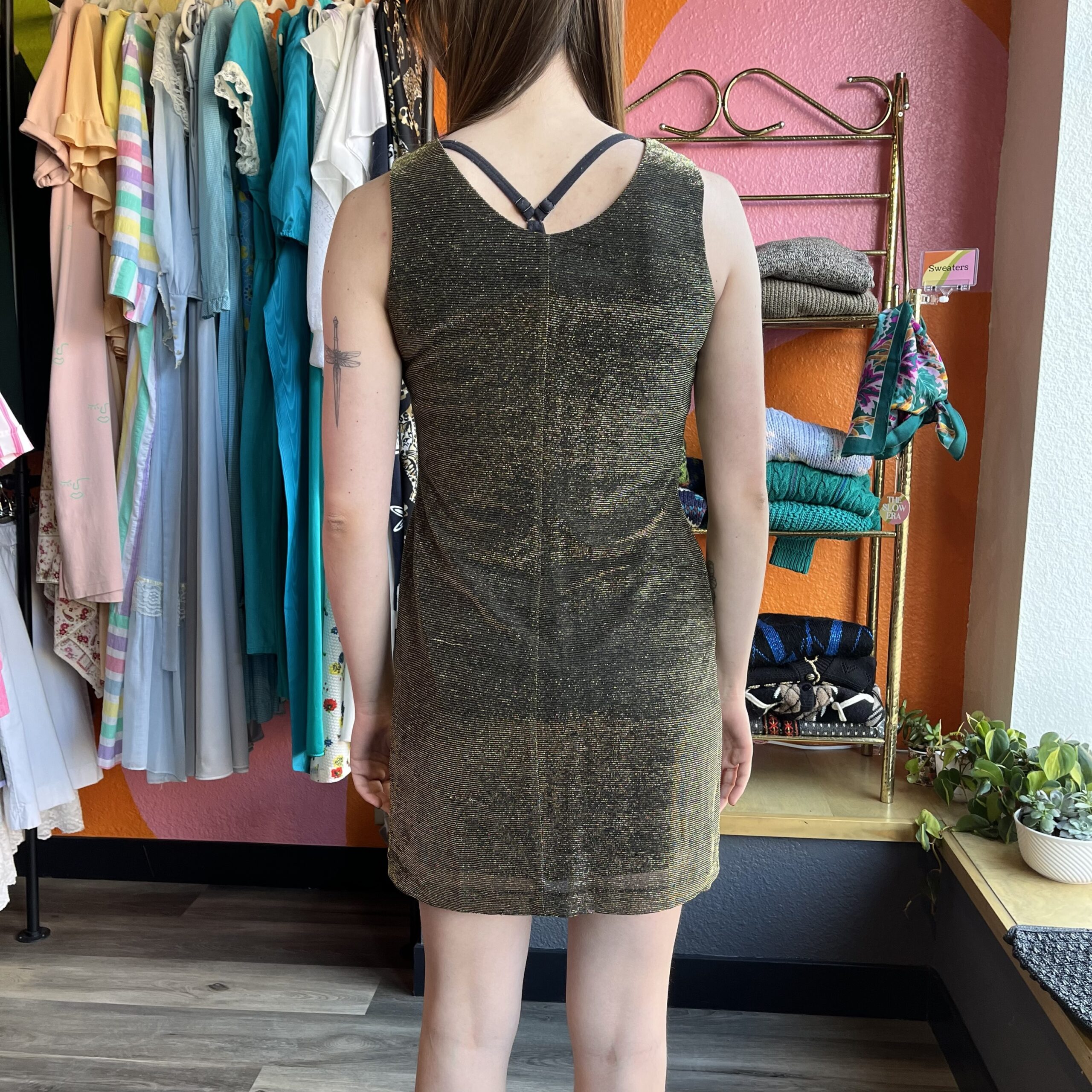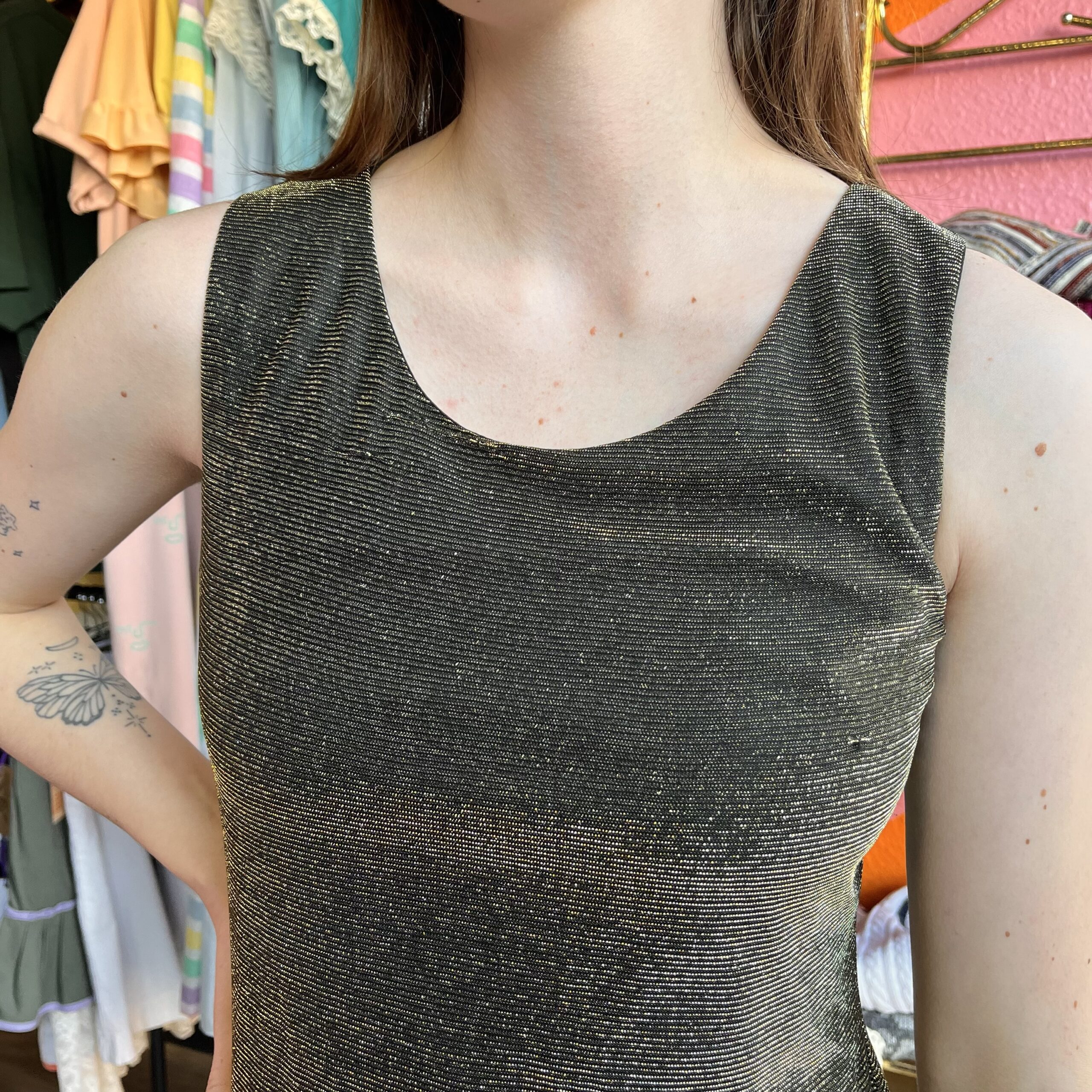 Late 1990s, Black/metallic gold, sparkly fabric, shift silhouette, sleeveless, mini length, round neck, fully lined, pullover/no closure, shell is 73% acetate 27% metallic, lining is 100% polyester.