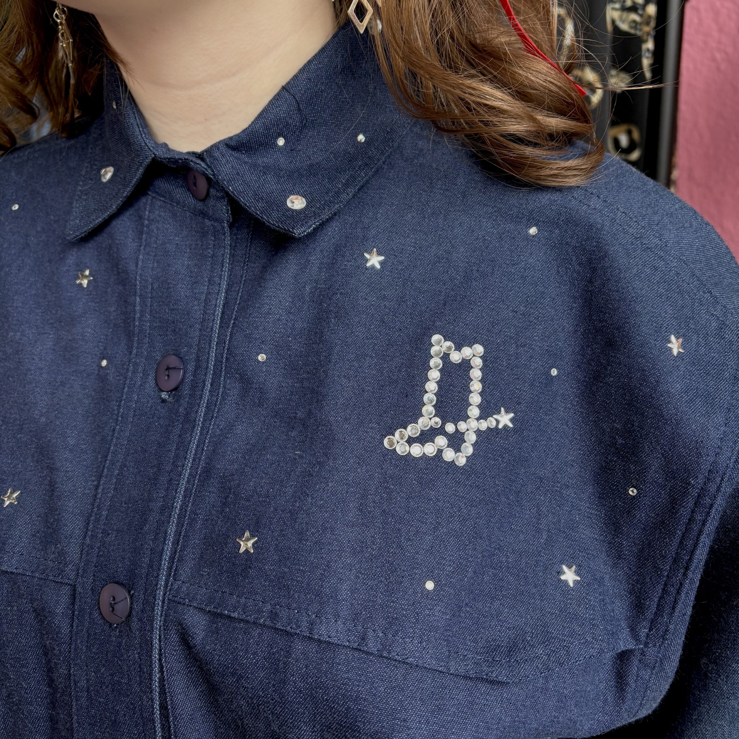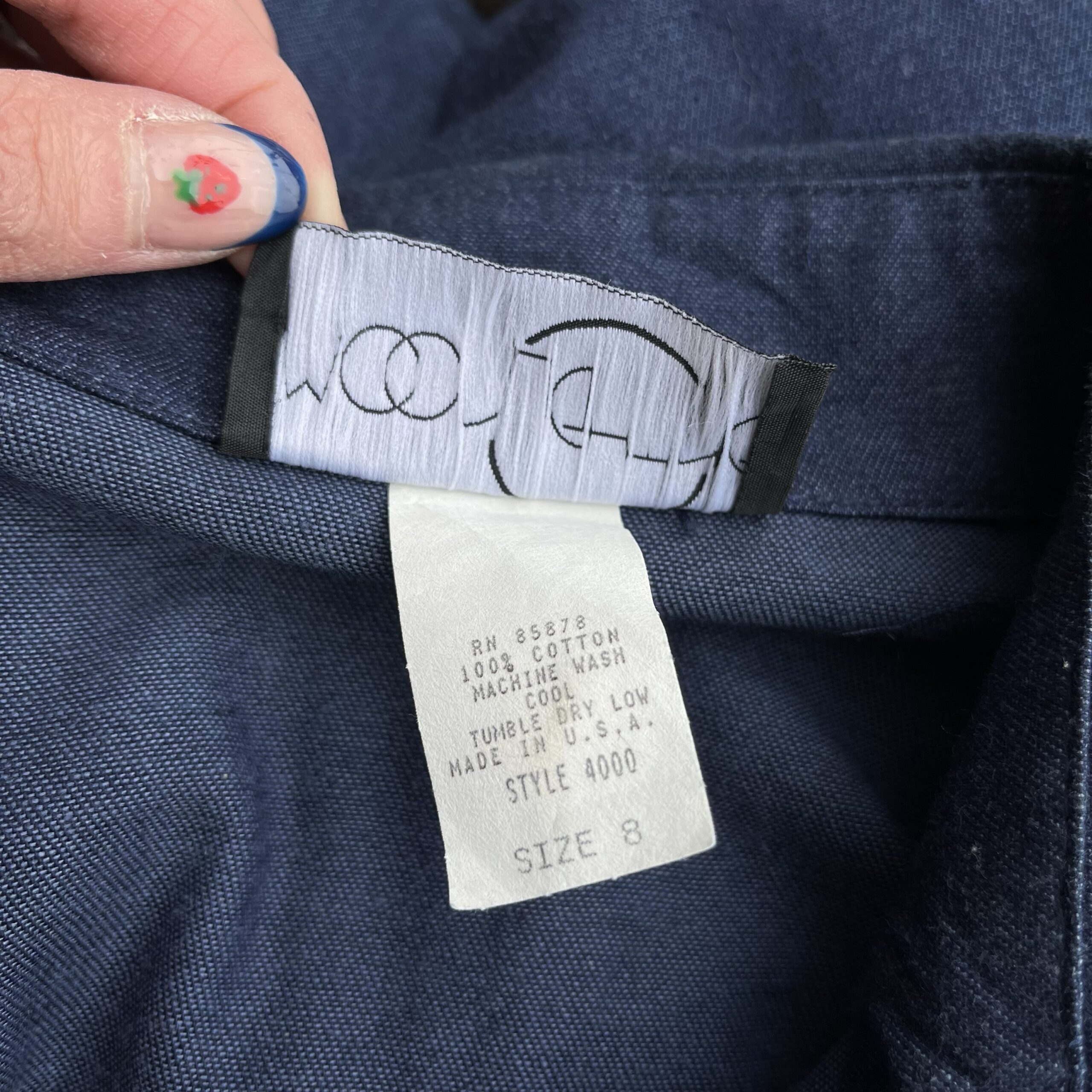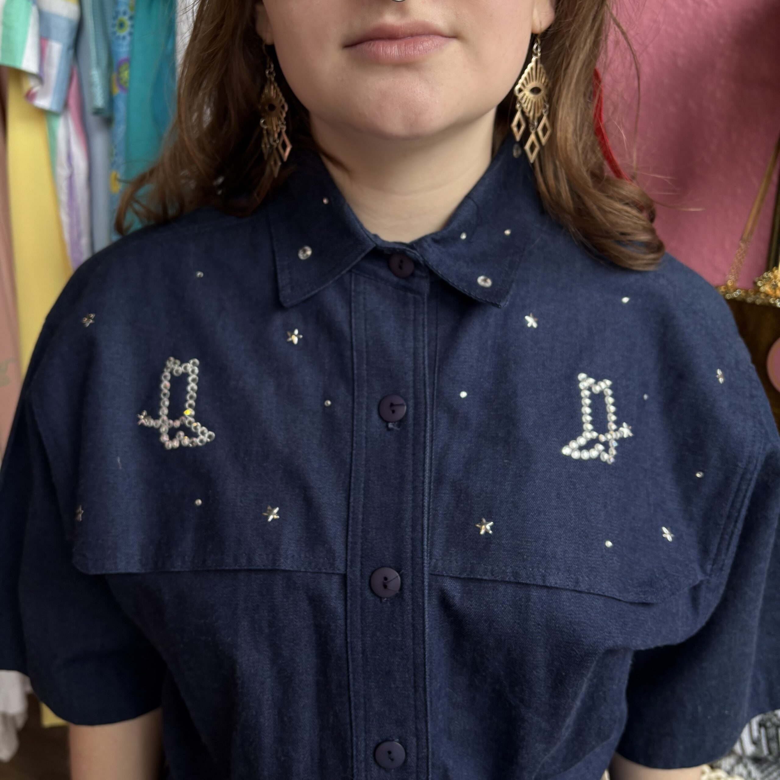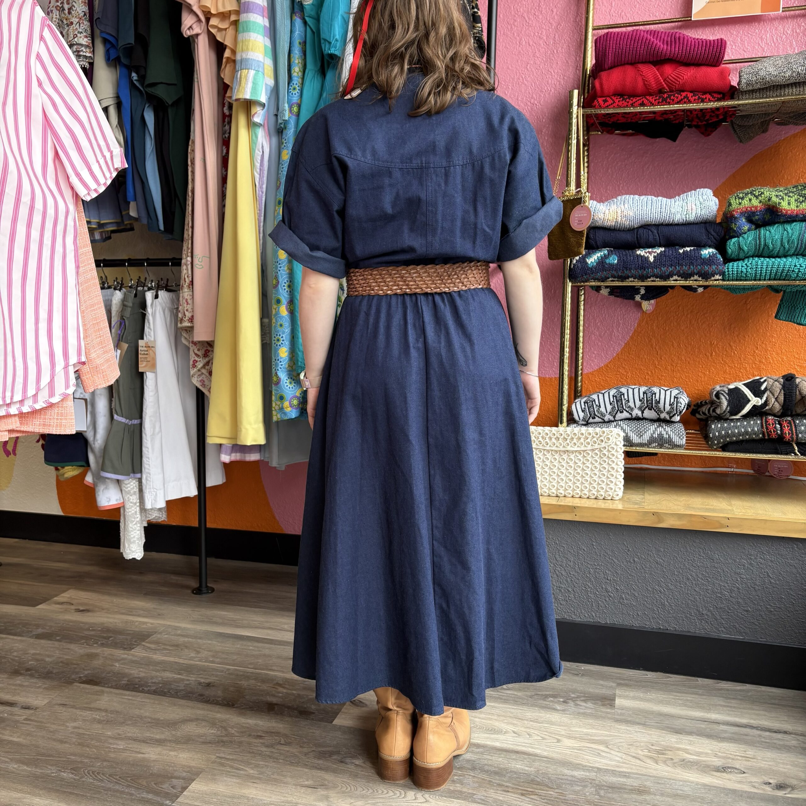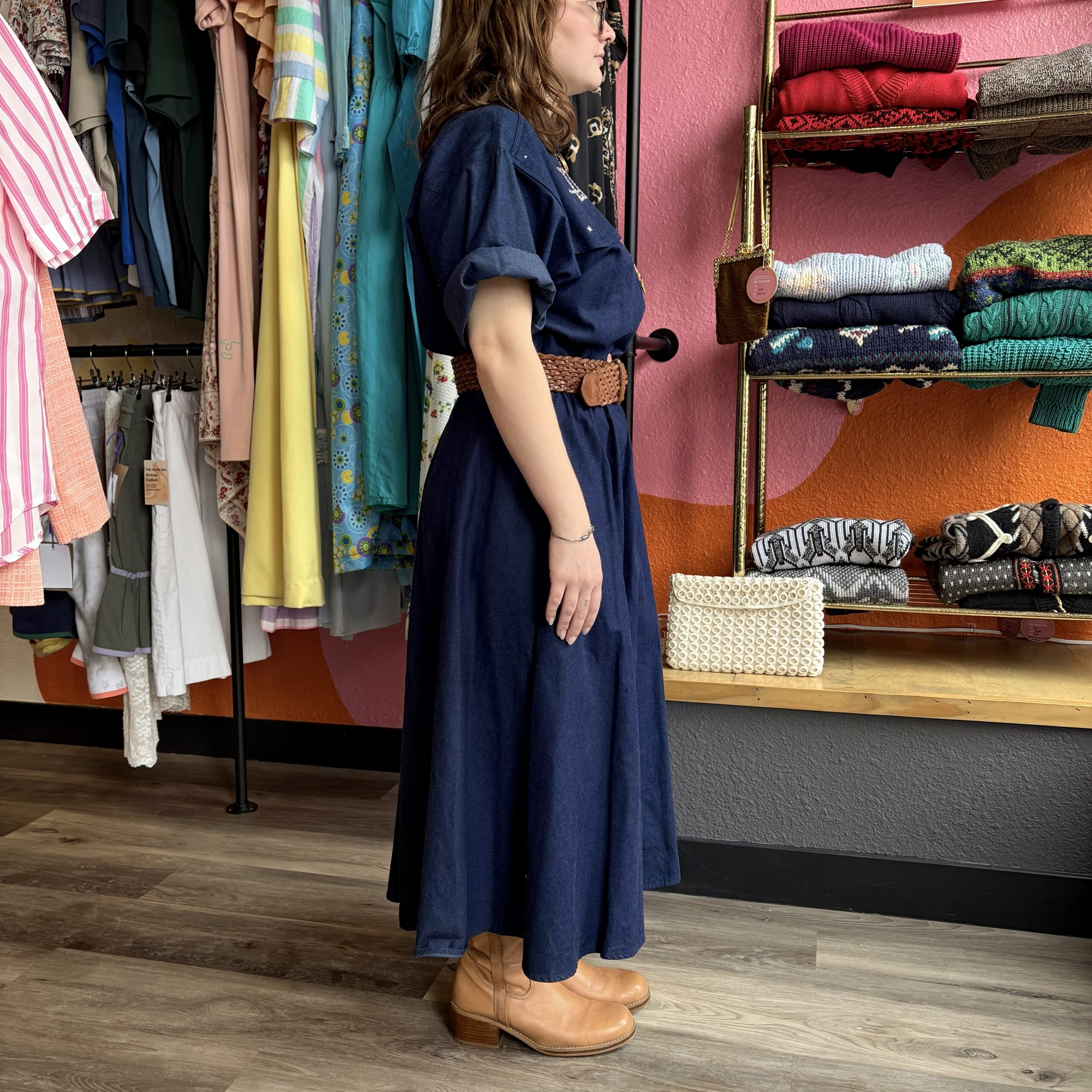 Circa late 80s/early 90s, navy, aline silhouette, midi length, short sleeve, side slit pockets, button closure, elastic waist, rhinestone cowboy boot chest w/ stars, rhinestone collar, 100% cotton denim.