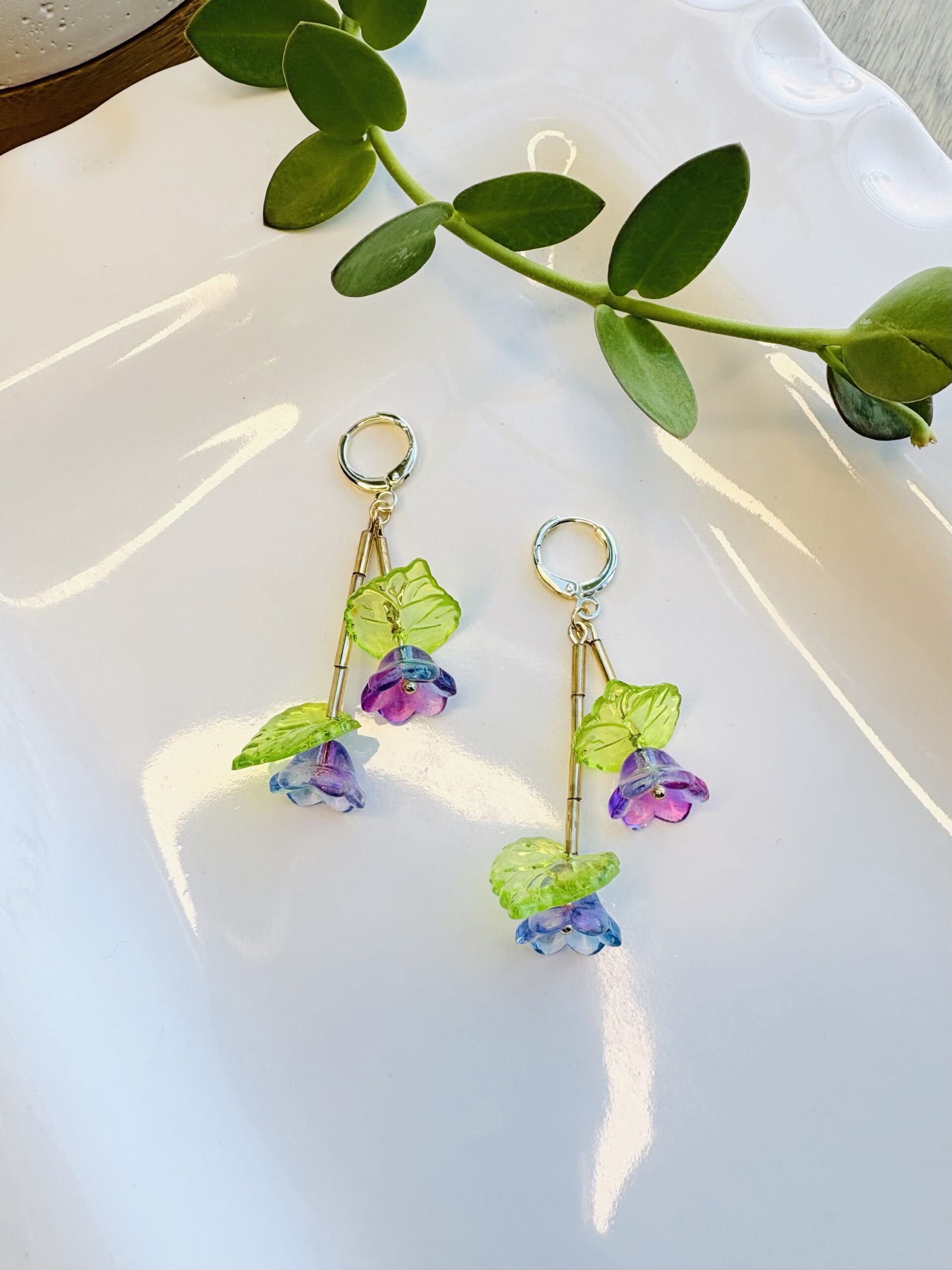 Gold Tone hardware, huggie hoops, blue-violet hanging flowers.