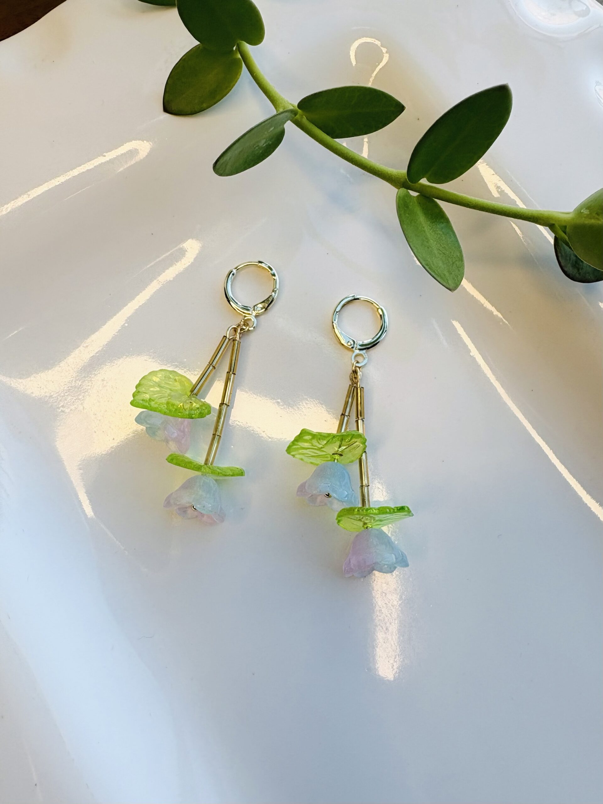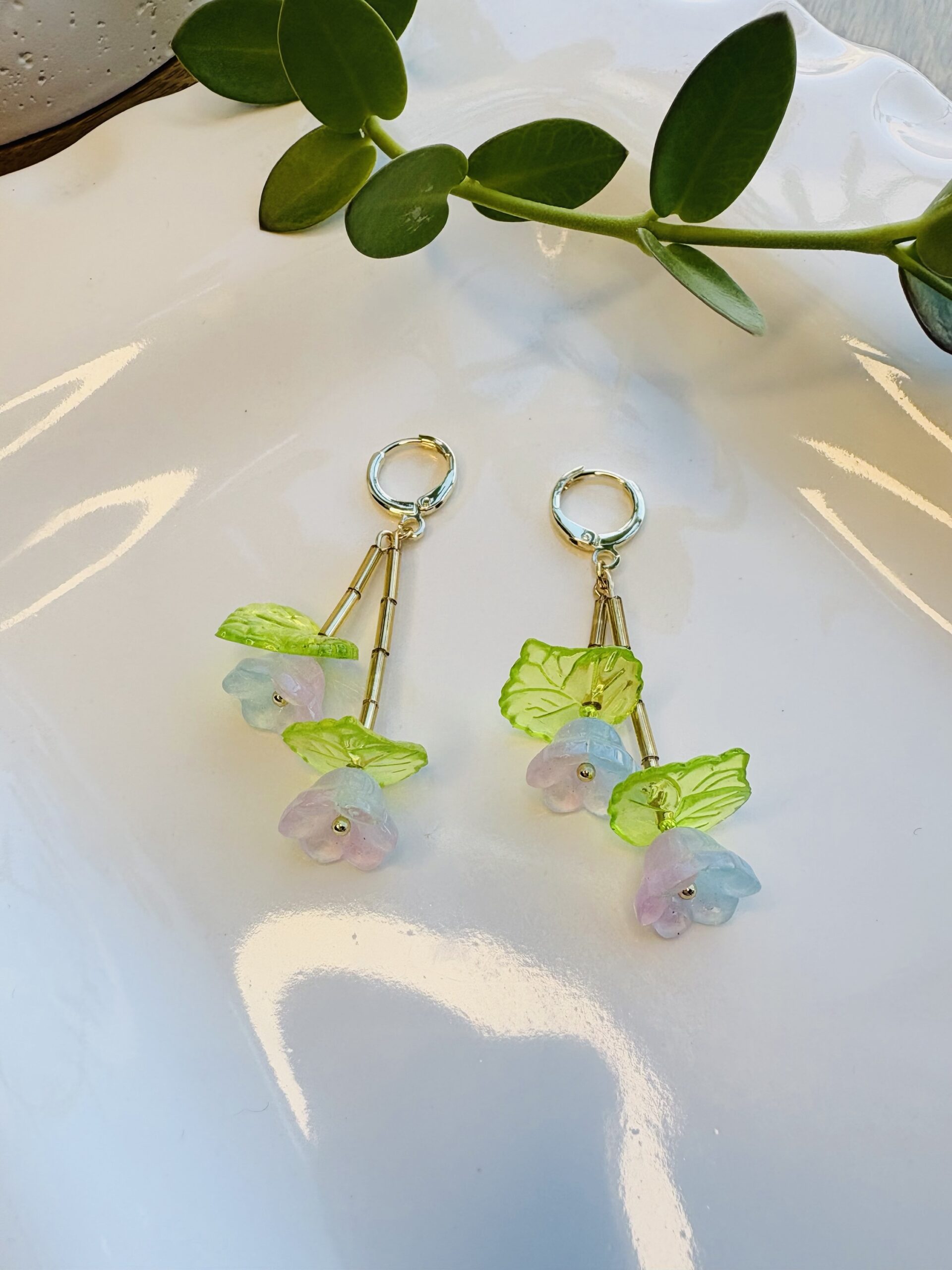 Gold Tone hardware, huggie hoops, light pink and blue flowers.