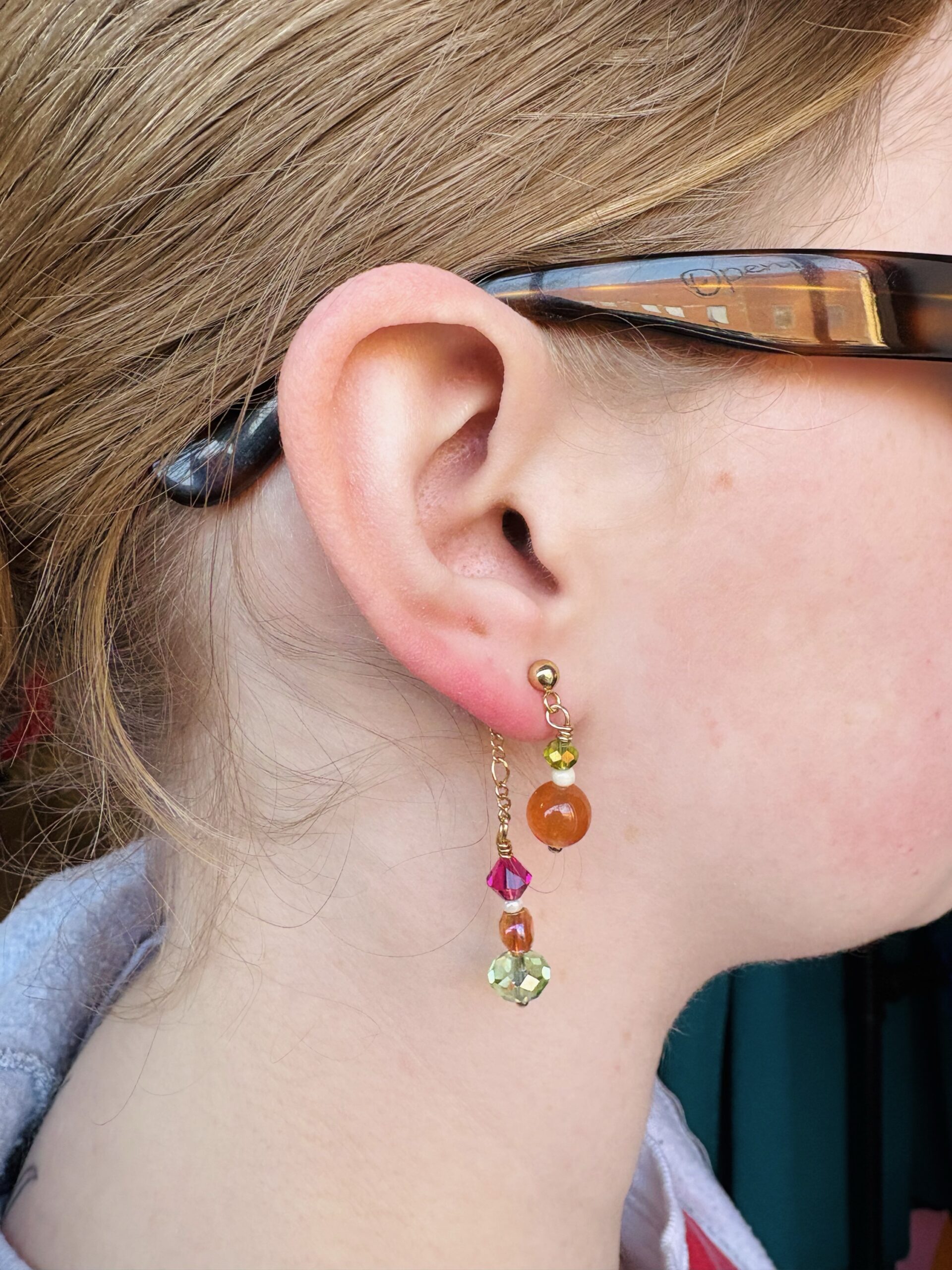 Gold Tone hardware, push-back, green/pink/orange beads in front and back.