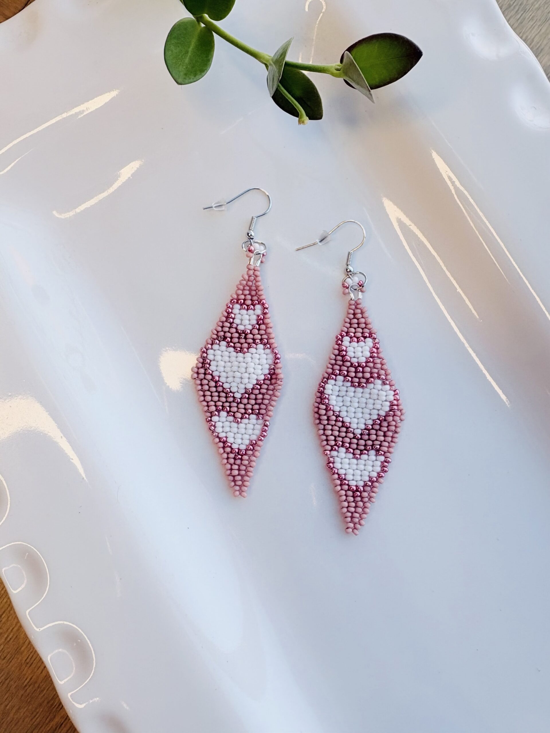 Kathleen Embrey Light Pink and White Beaded Heart Earrings