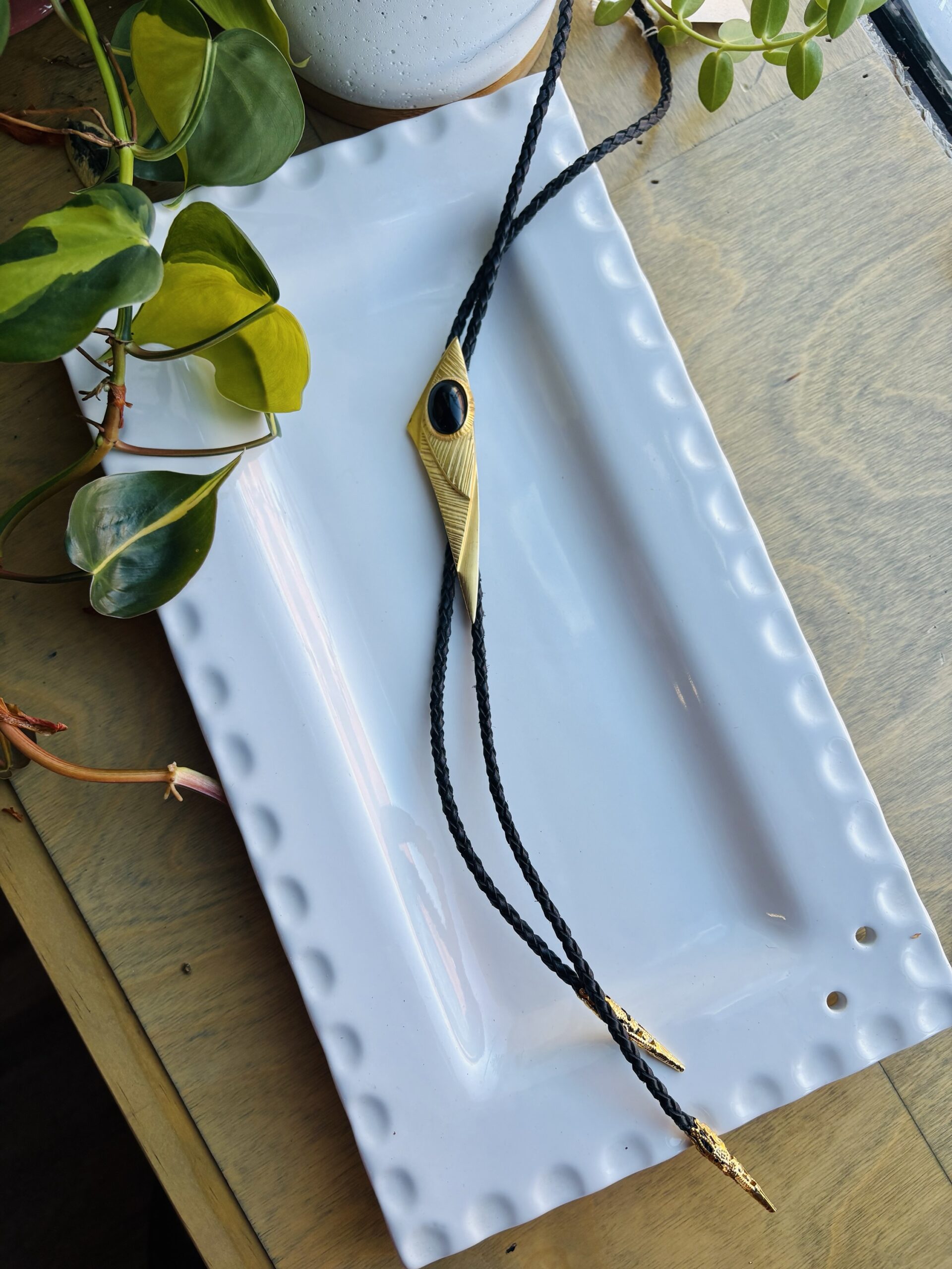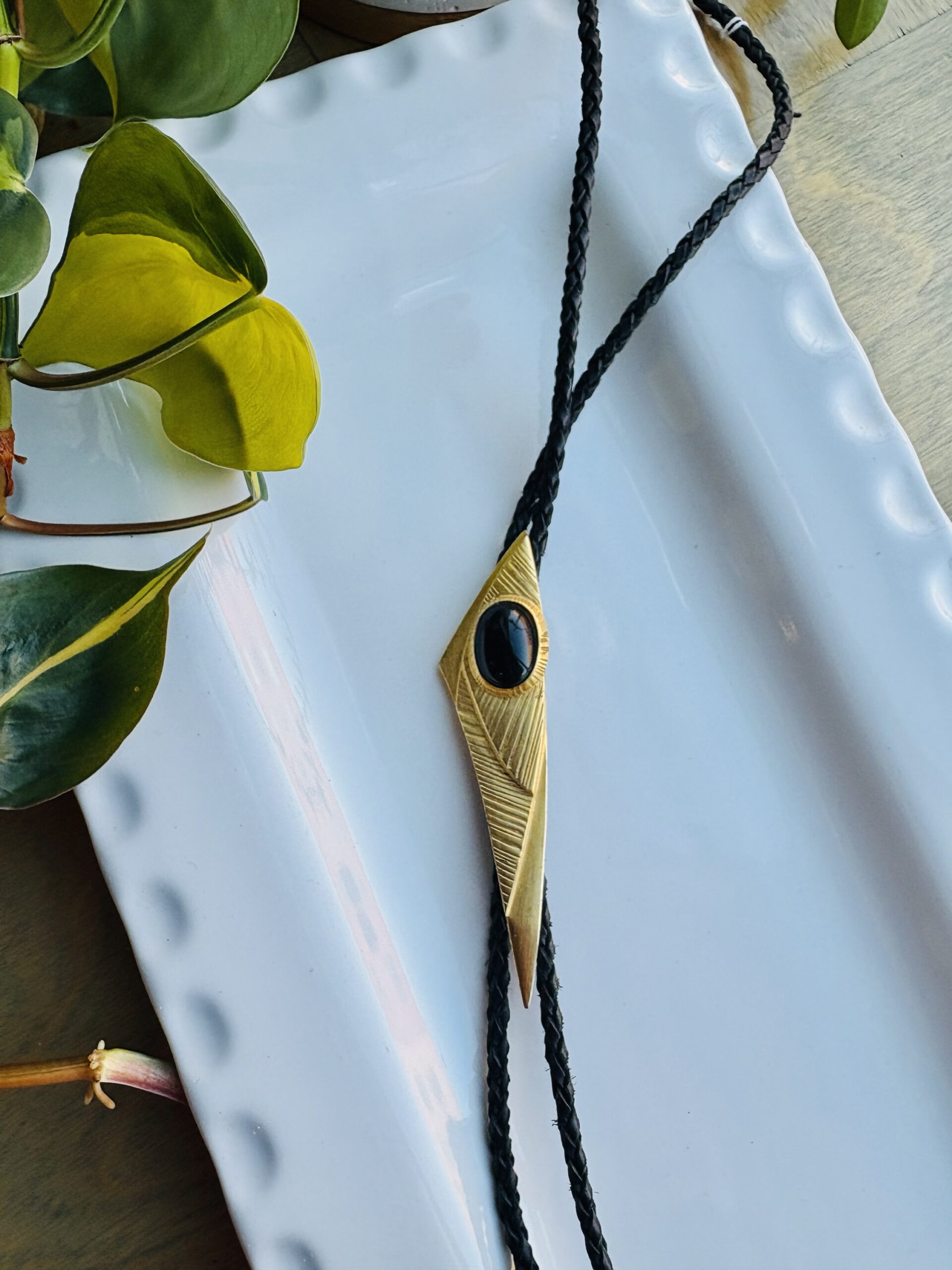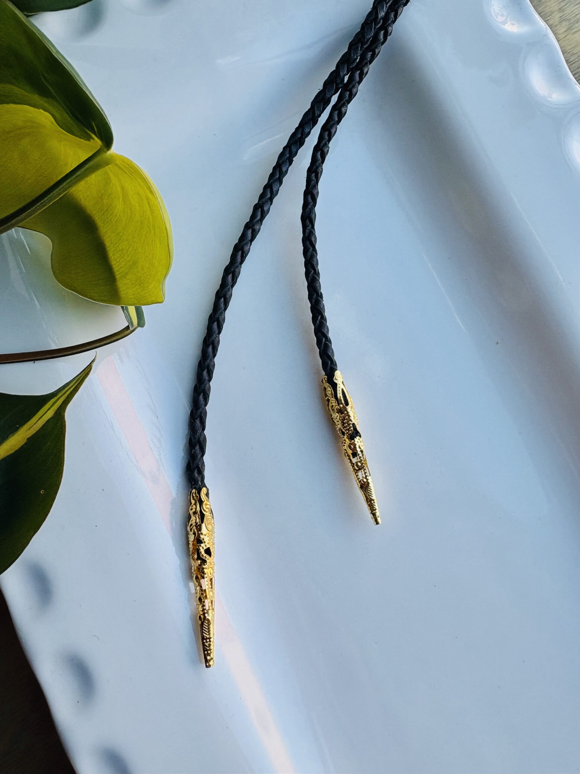 Black braided leather cord. Engraved, gold tips. Gold/onyx emblem.