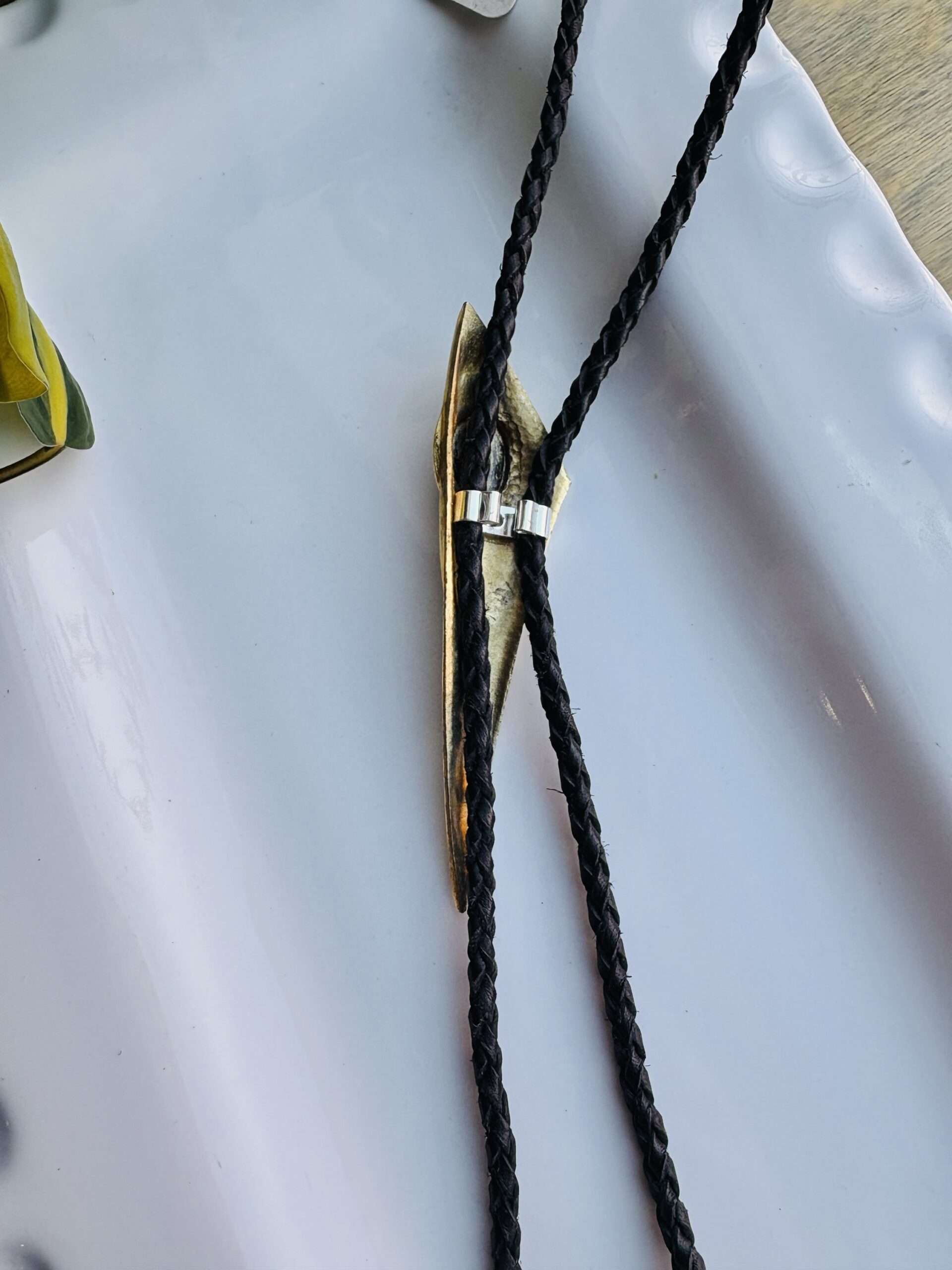 Handmade here in Iowa by One Hand Ties. One Hand Ties often appropriates existing materials, like broaches and pins, creating sustainable, unique, and one-of-a-kind bolo ties.