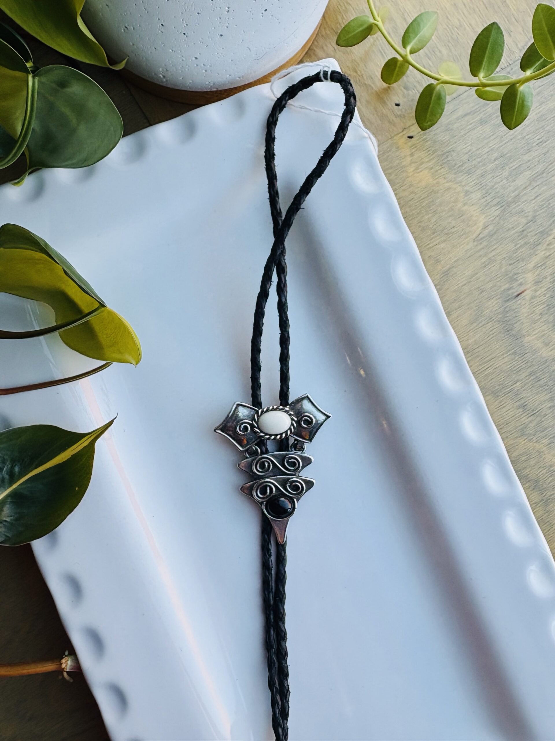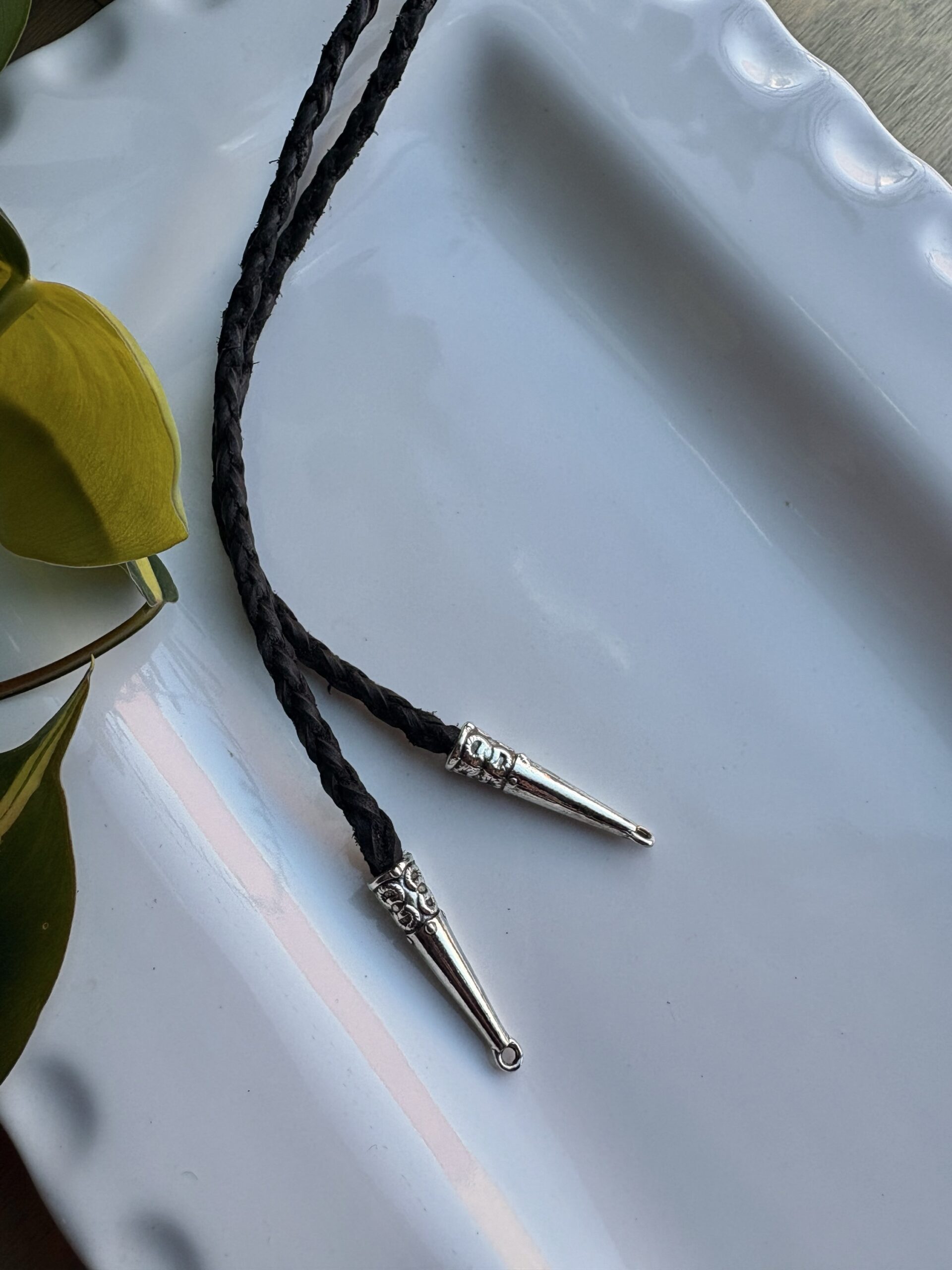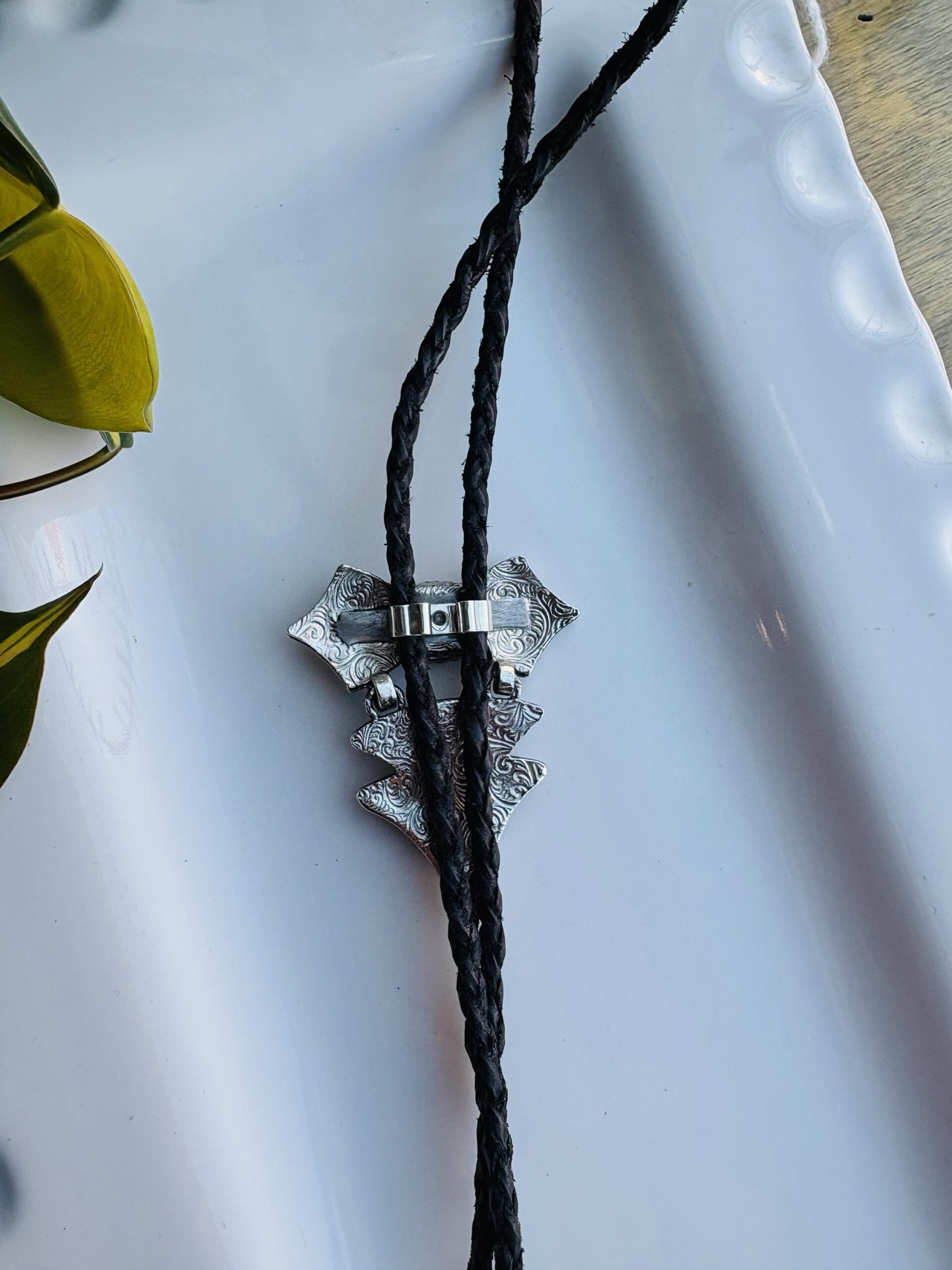Handmade here in Iowa by One Hand Ties. One Hand Ties often appropriates existing materials, like broaches and pins, creating sustainable, unique, and one-of-a-kind bolo ties.