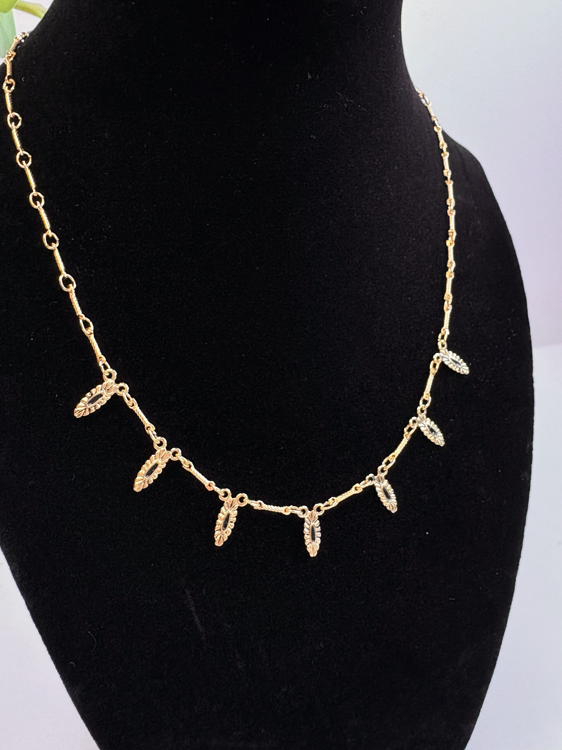Gold tone necklace w/ engraved gold/black “leaf” charms