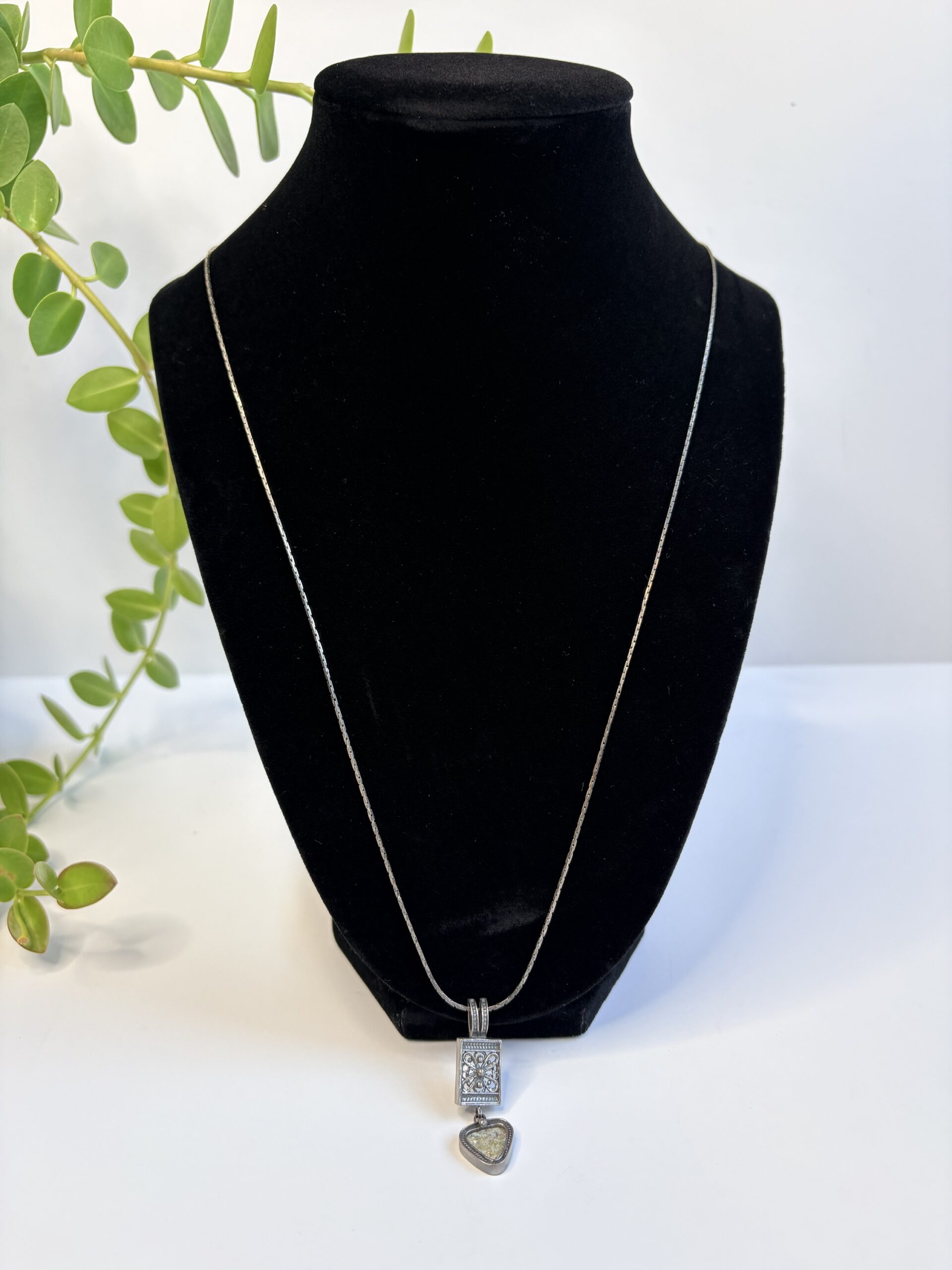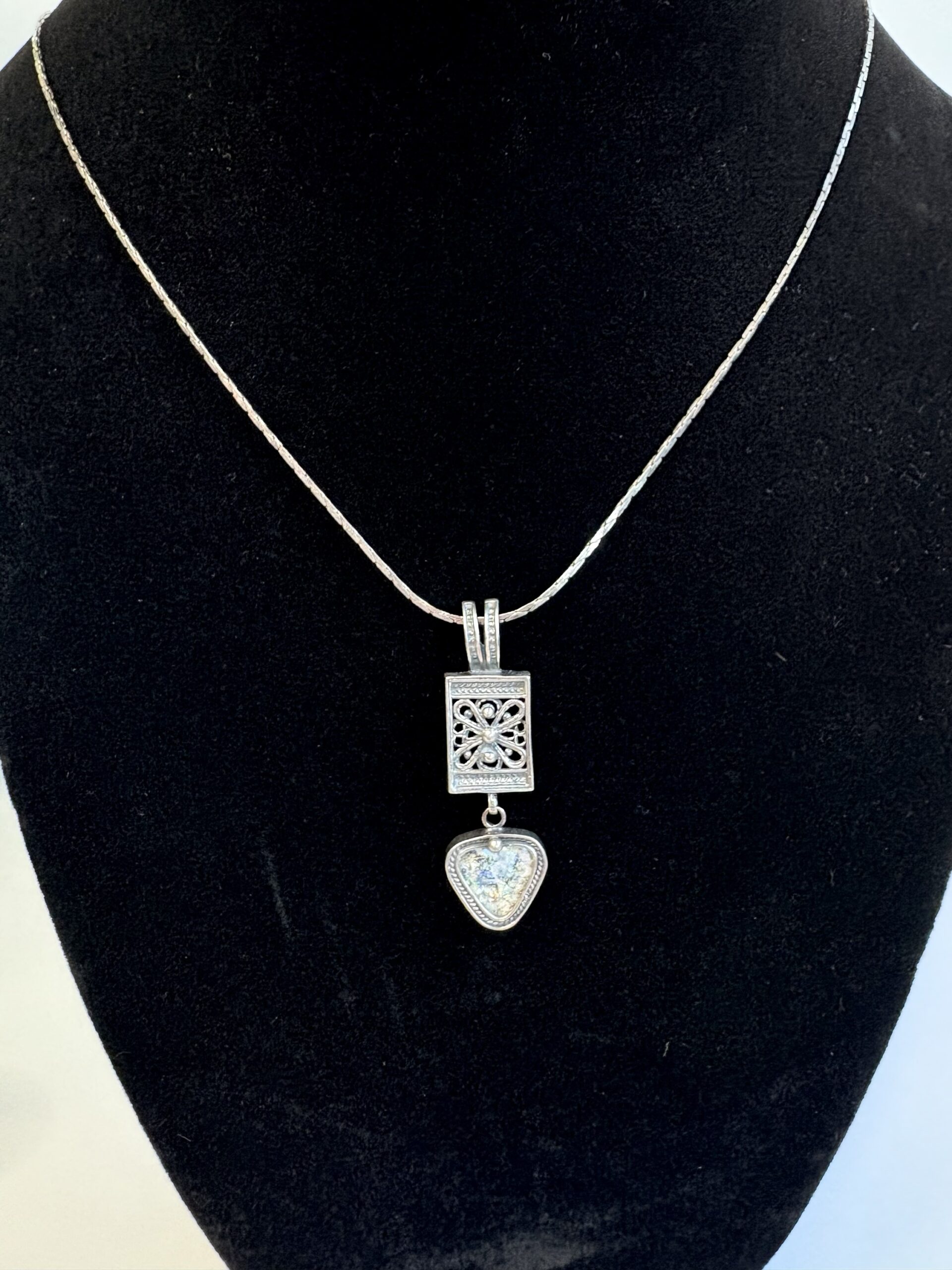 Silver tone necklace w/ engraved & iridescent triangle pendant