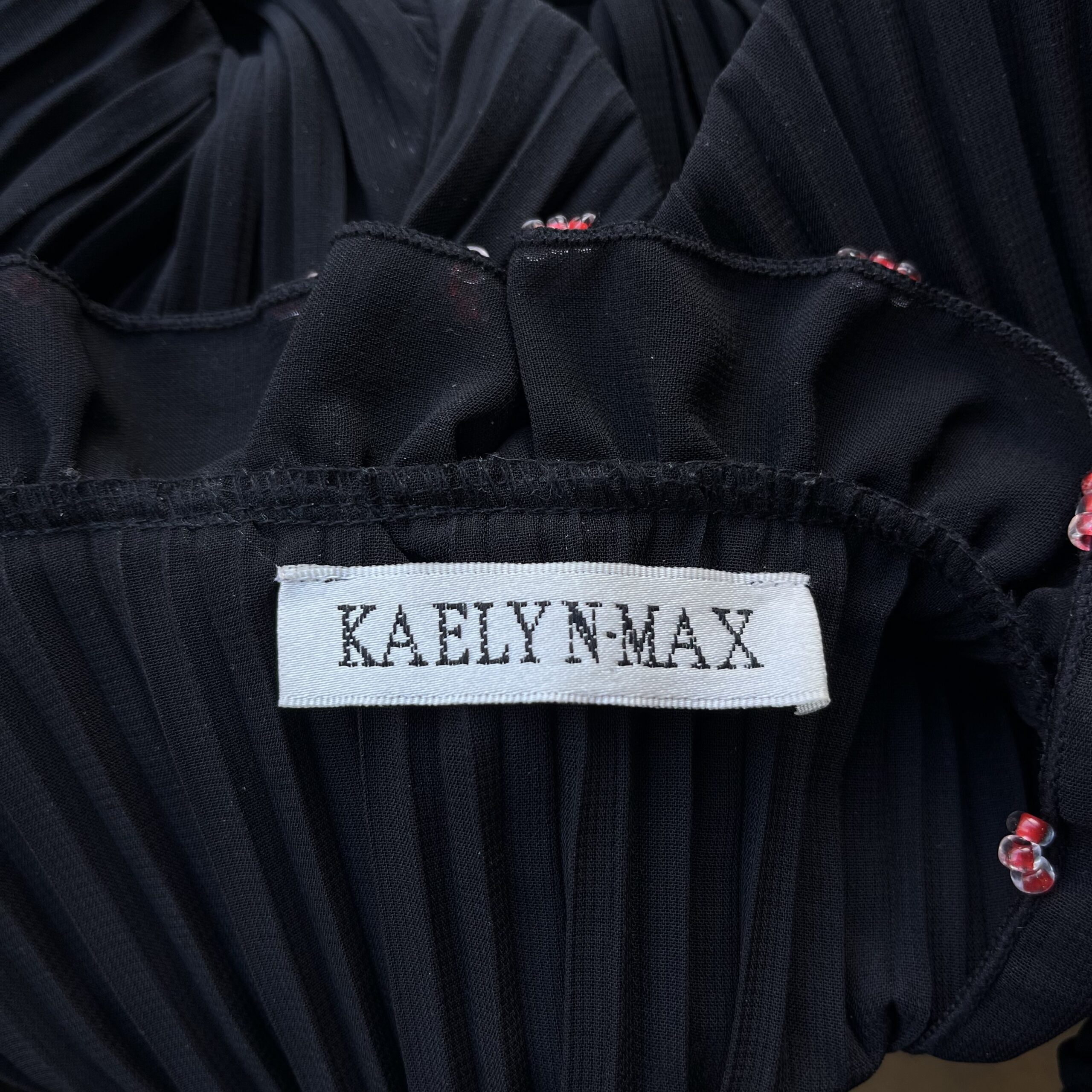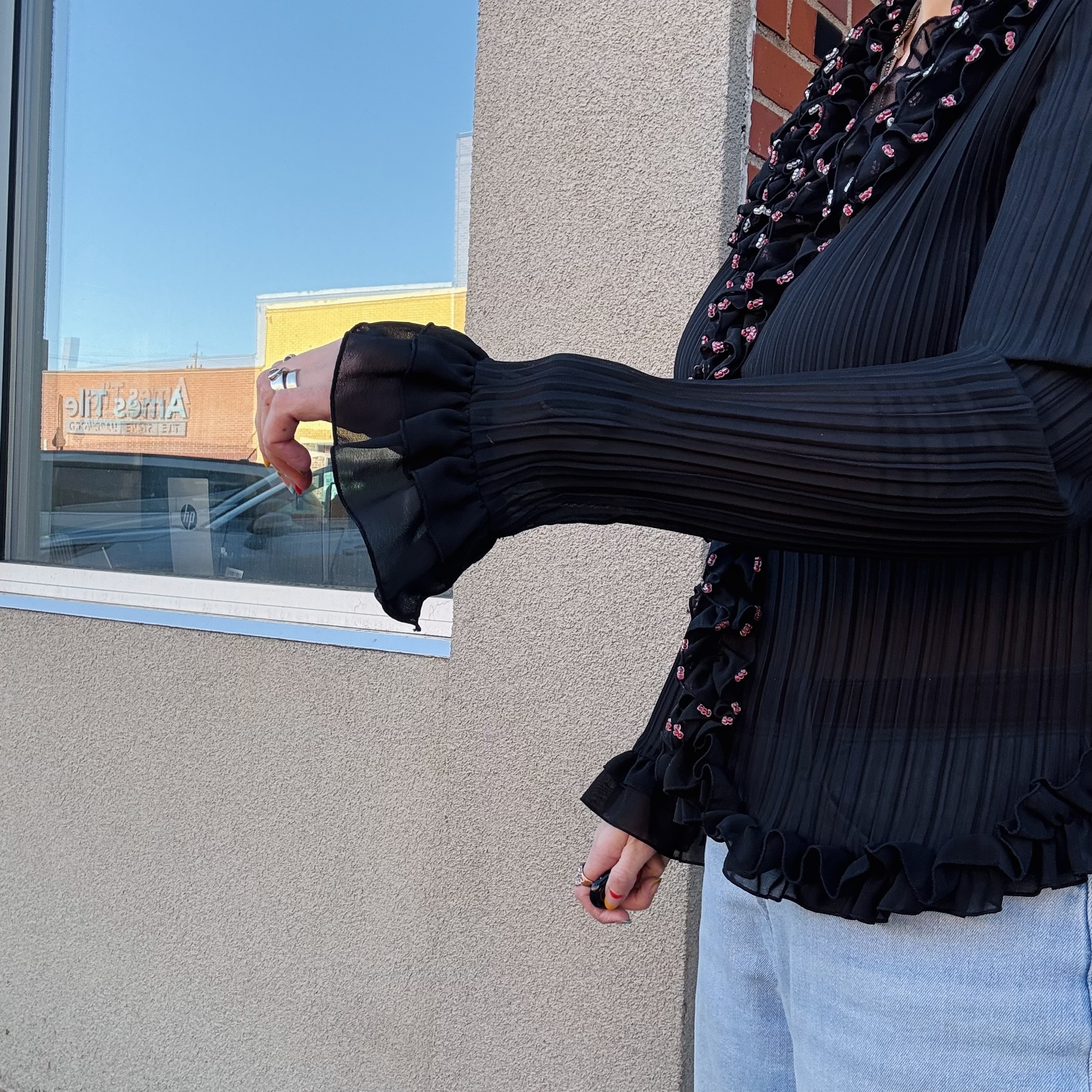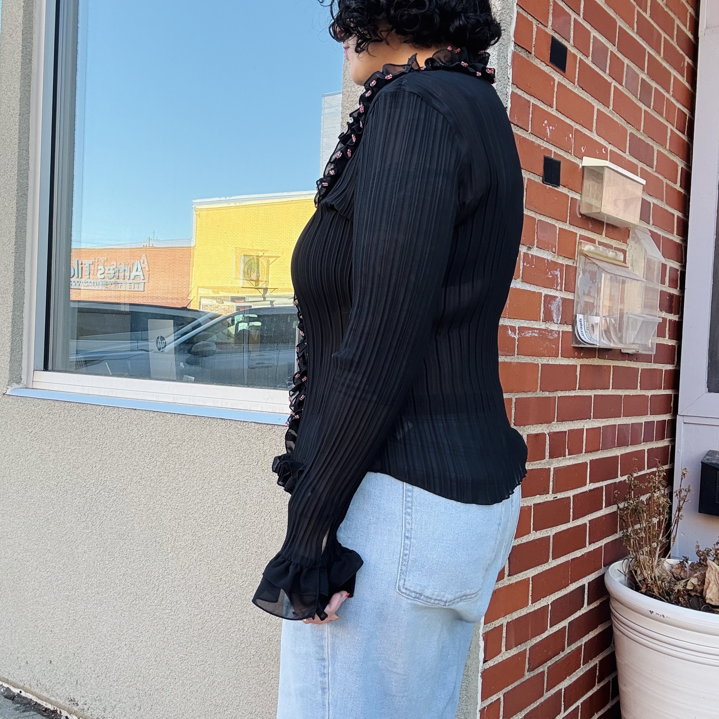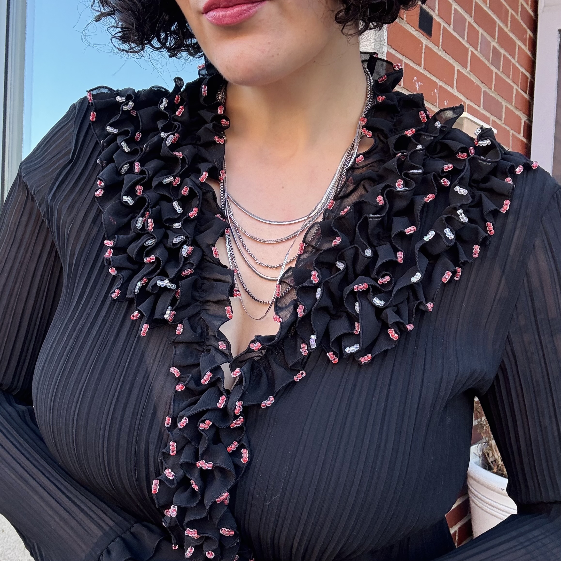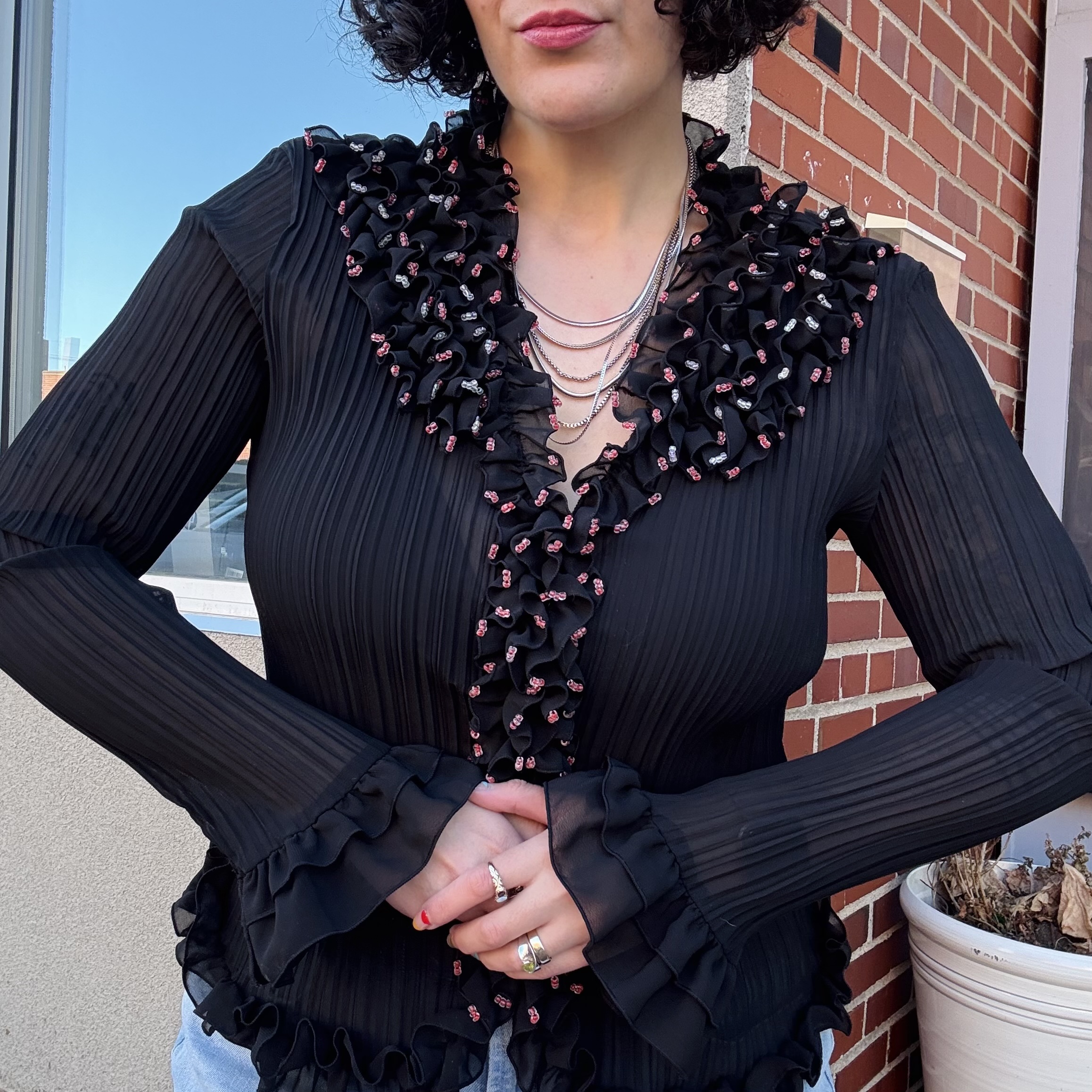 Late 90s/Early 2000s, black color, long sleeves, beaded ruffle collar & down front, ruffle hem, layered ruffle sleeve cuffs, button up closure, semi-sheer, crinkle-texture fabric provides stretch, 100% polyester.